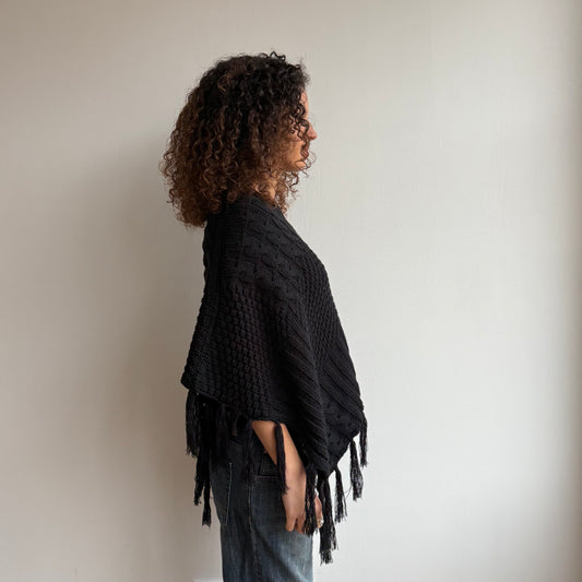 Black chunky knit tassel poncho - One Size