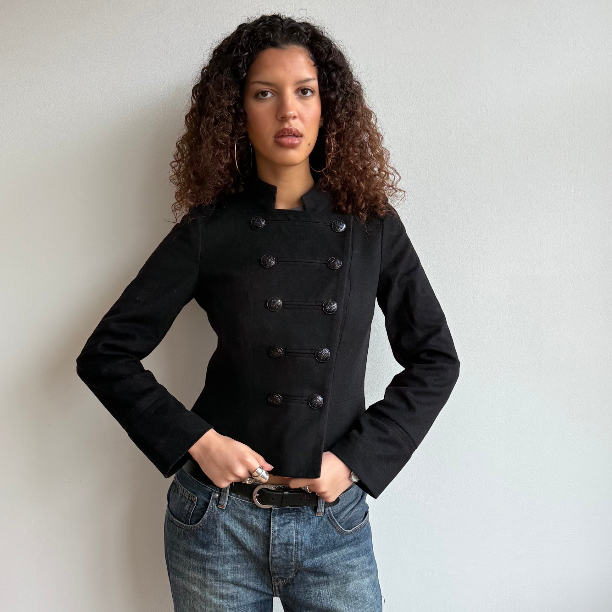 Black cashmere and wool blend structured military jacket