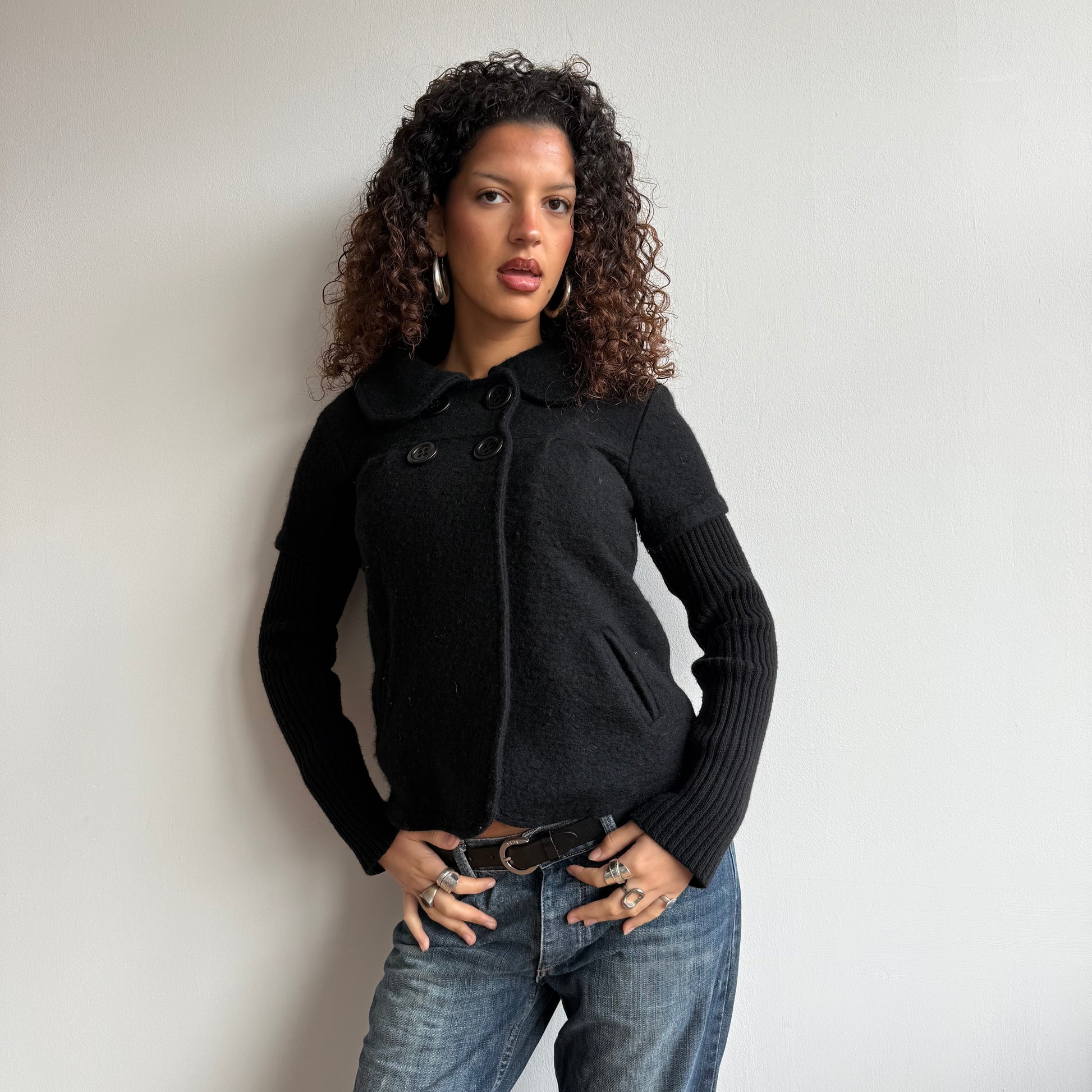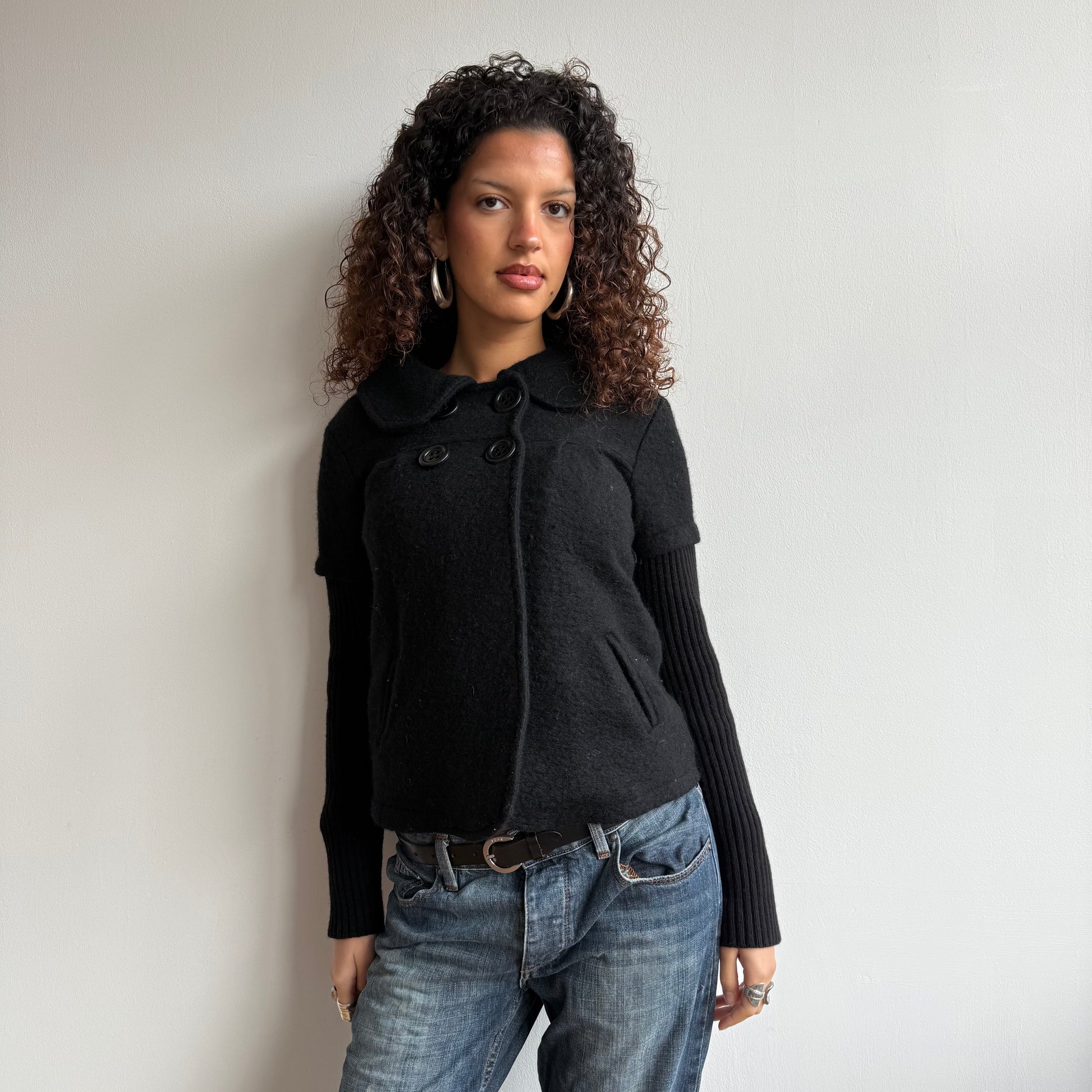 Black knitted long sleeve / short sleeve double breasted peacoat, stretchy knit material