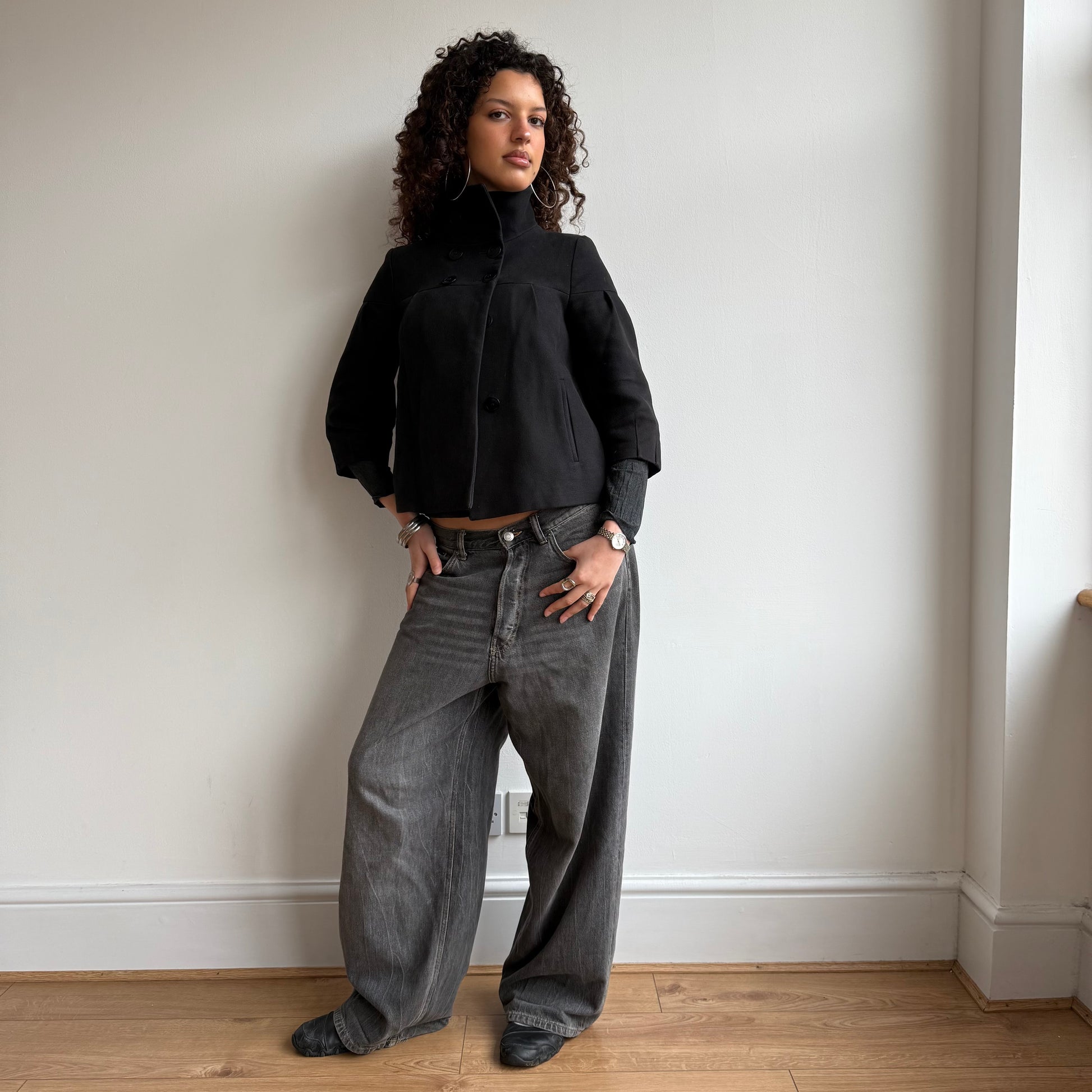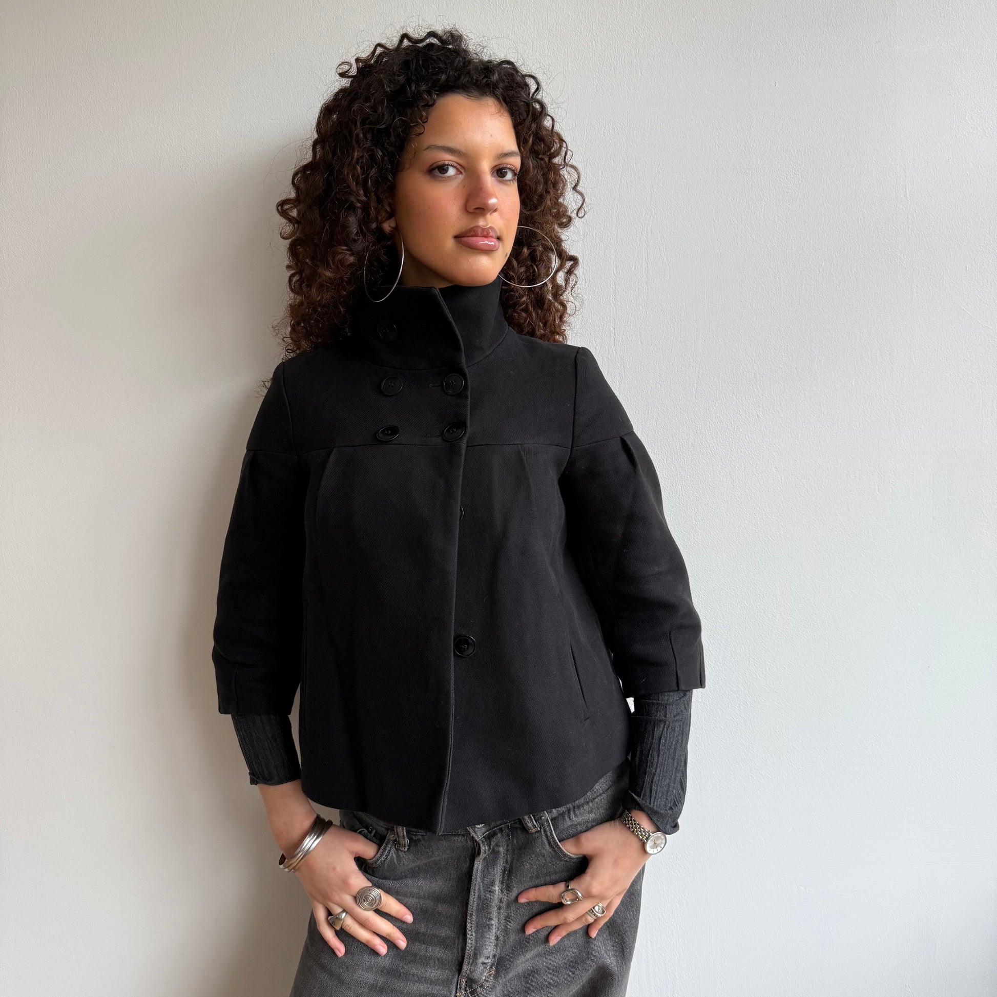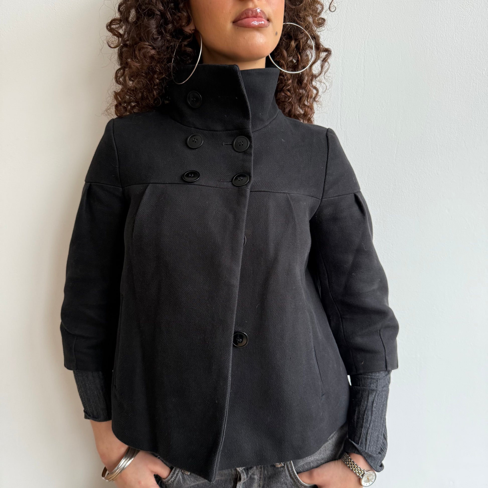 Black suit material peacoat with high neck and buttons. One of the external buttons has come off but one of the concealed ones could sewn in it’s place
