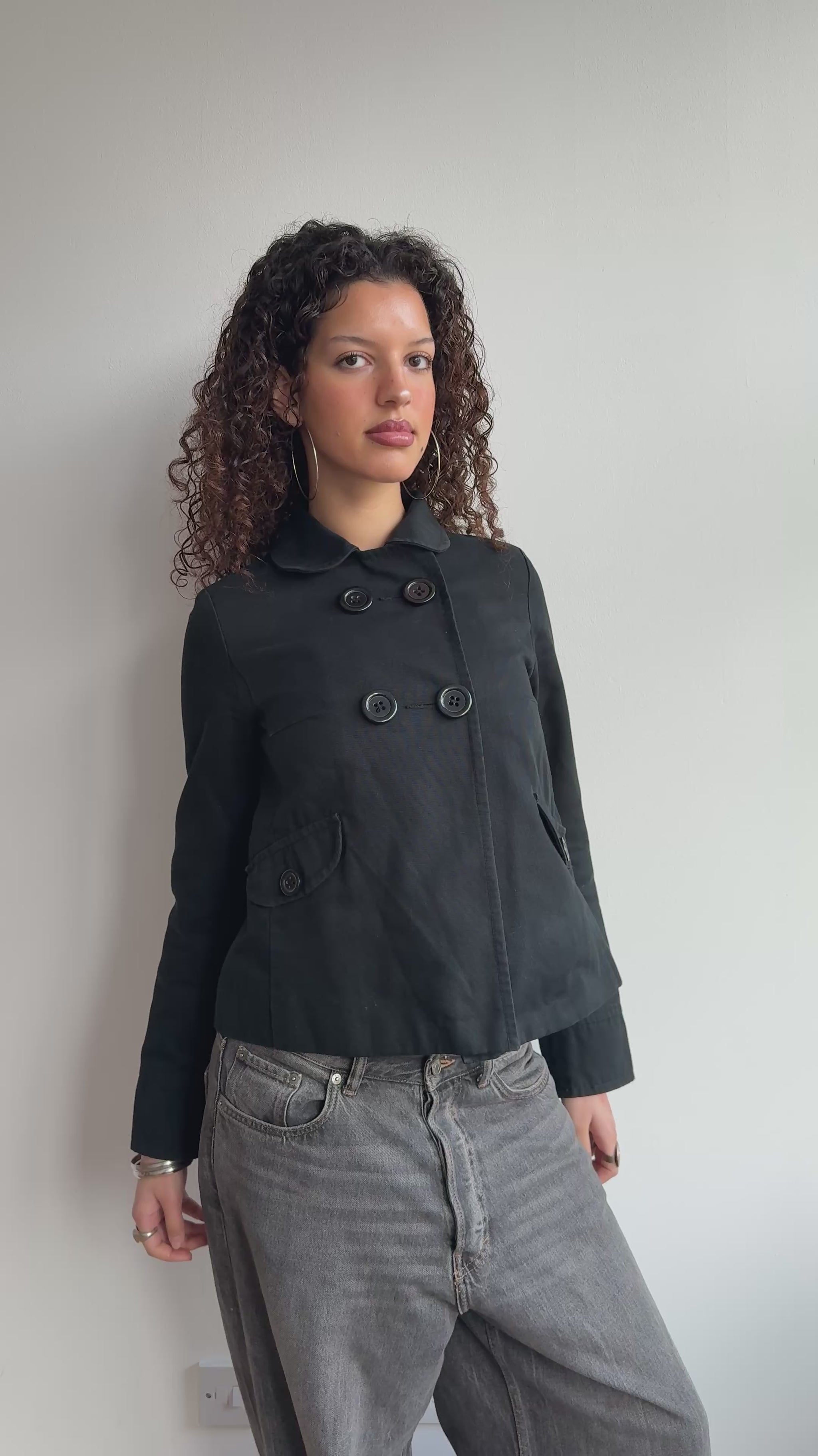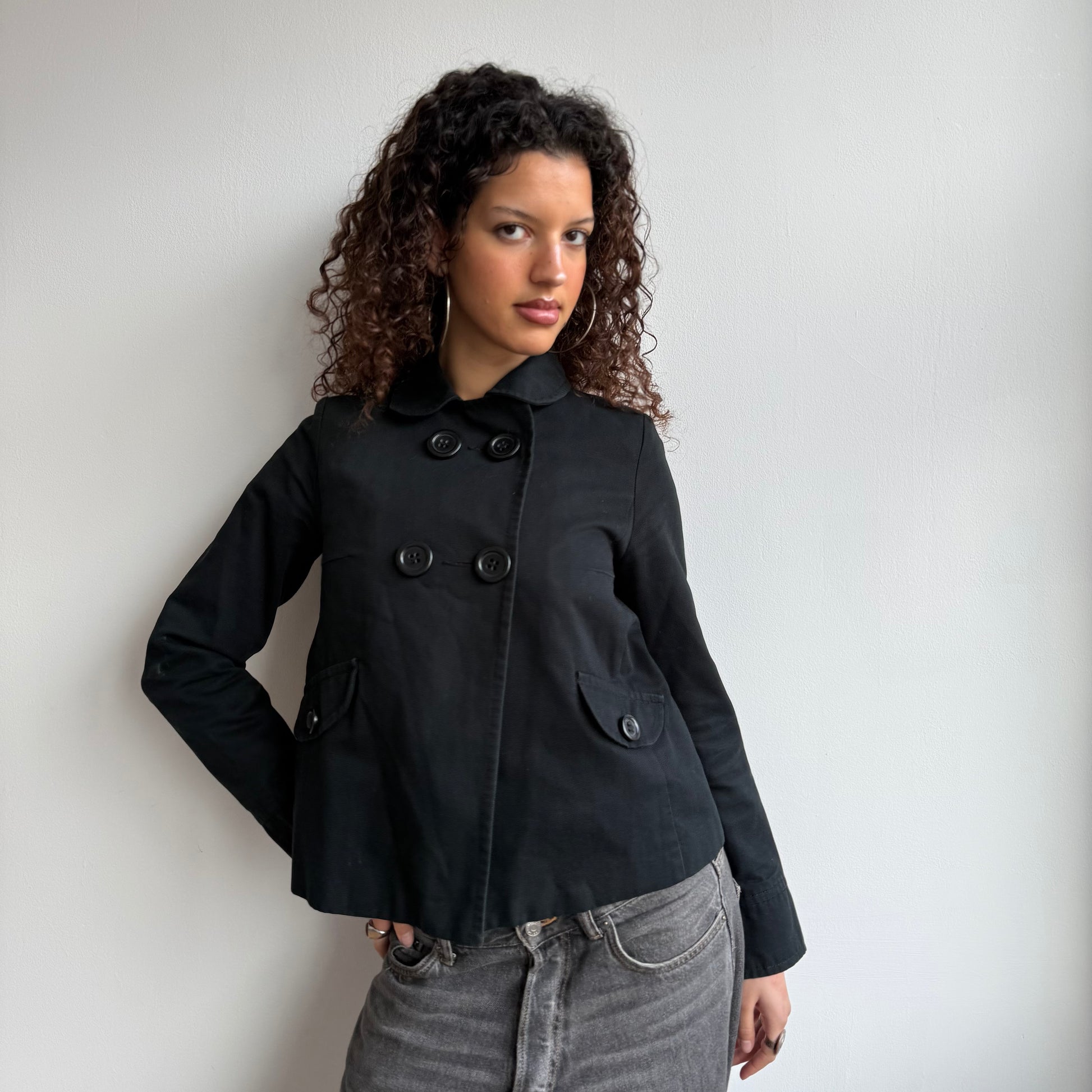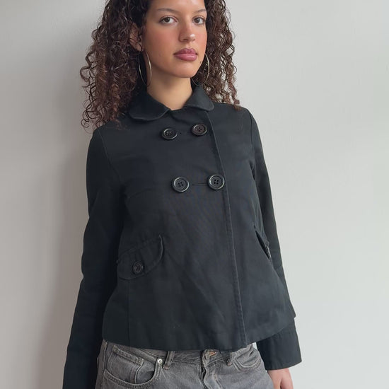 Black slightly cropped swing jacket with double breasted peacoat buttons
