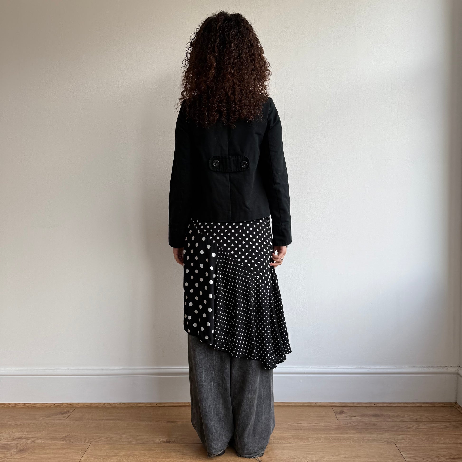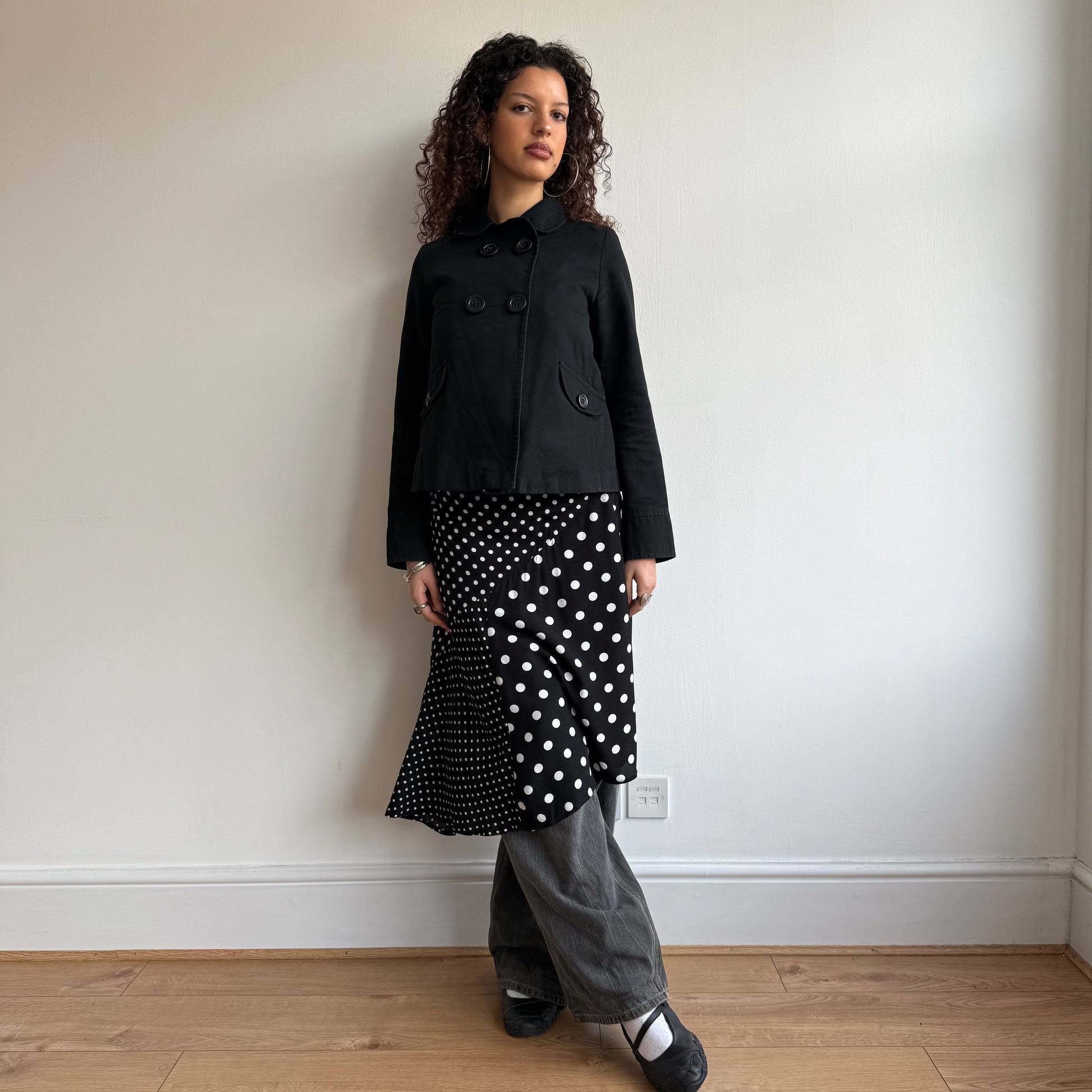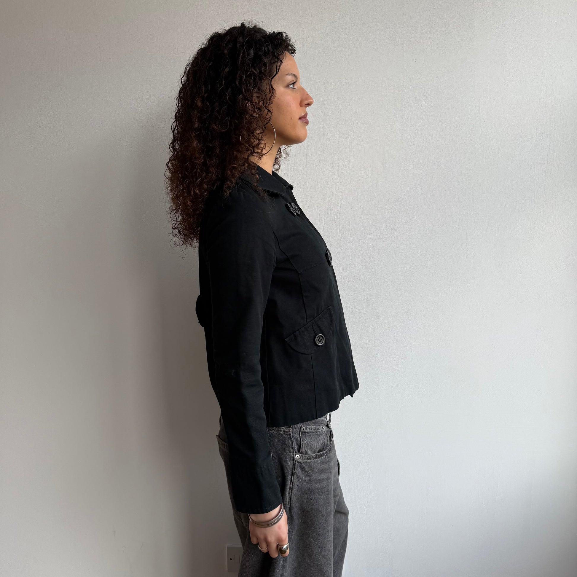 Black slightly cropped swing jacket with double breasted peacoat buttons