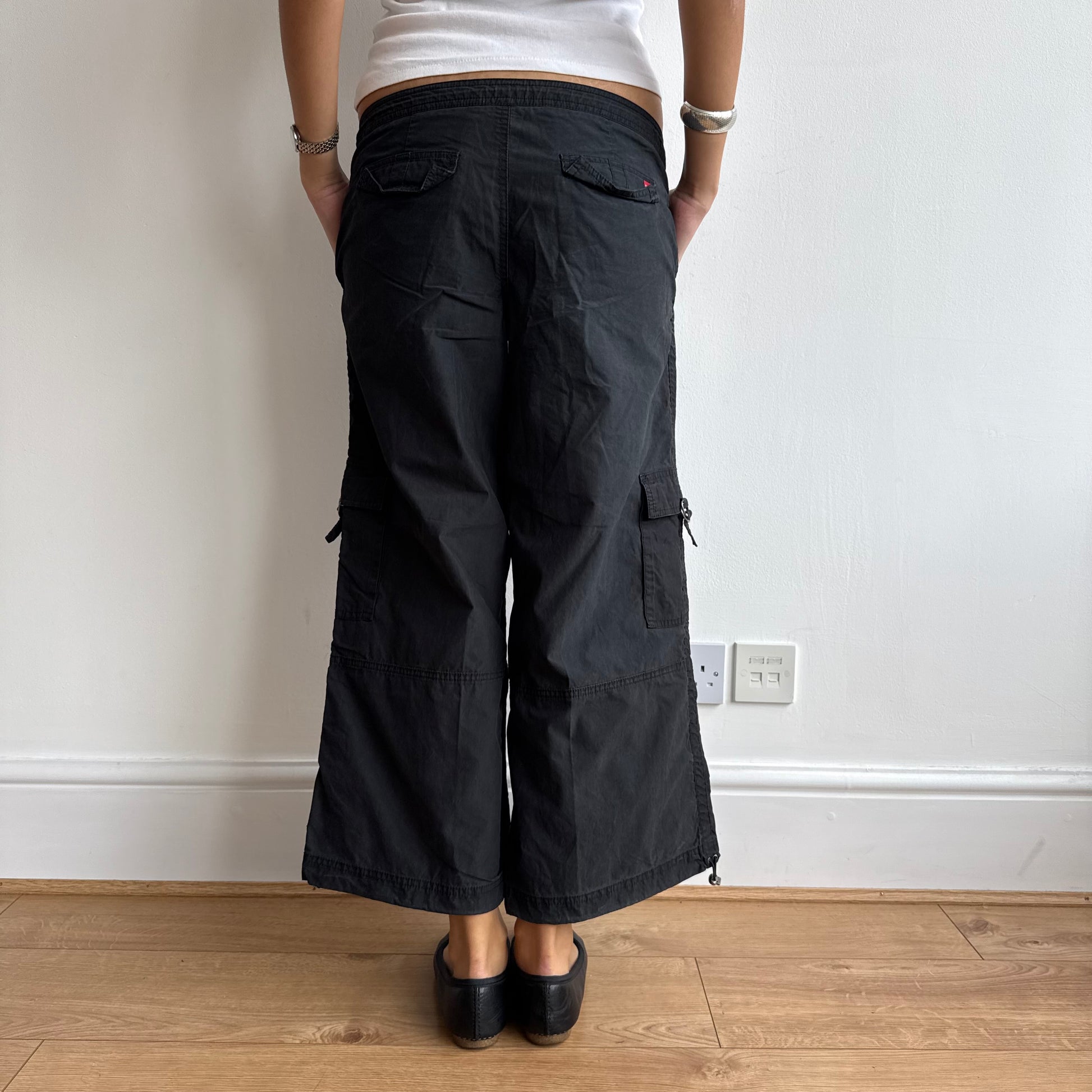 Black cargo toggle waist capris and adjustable ties at the ankles and side pockets