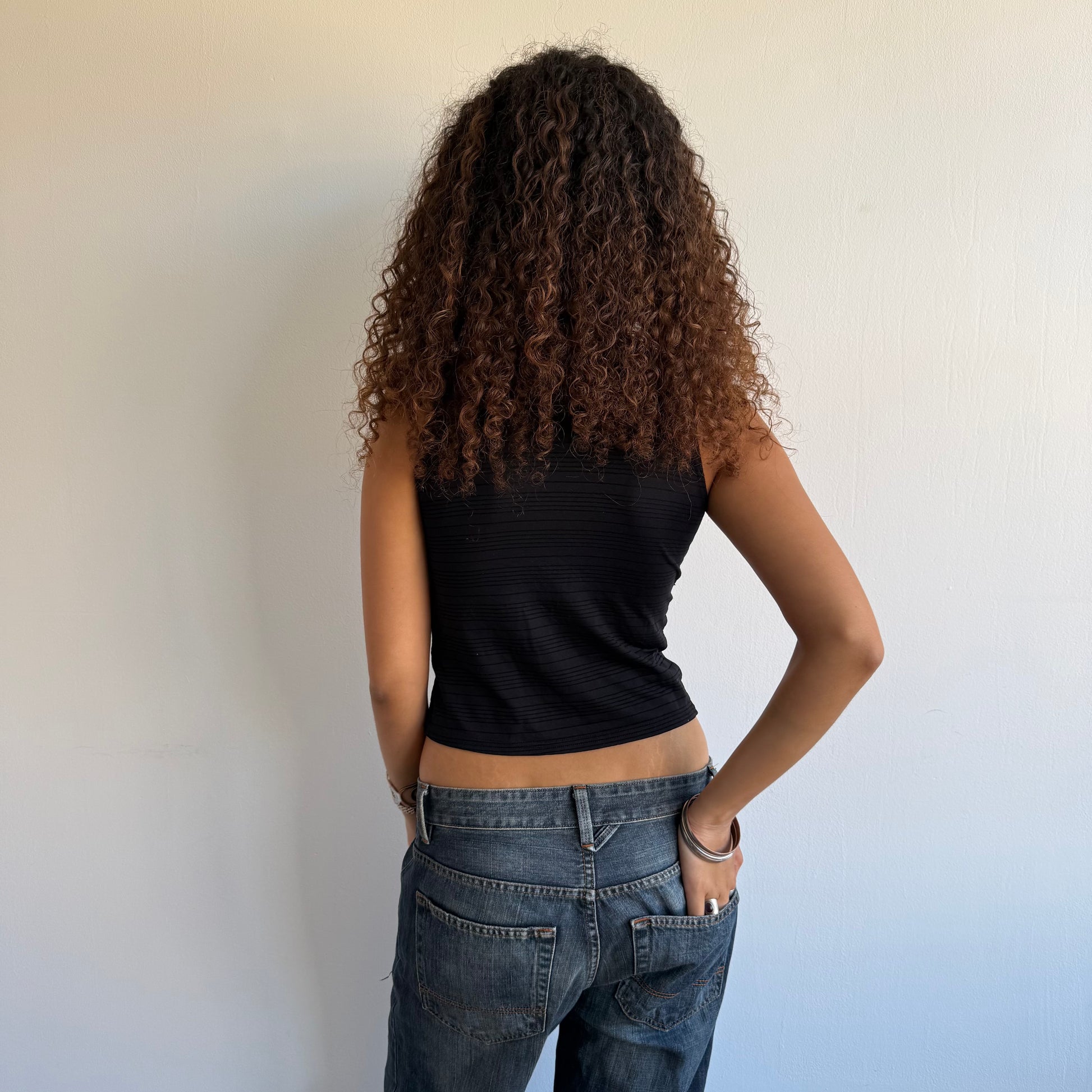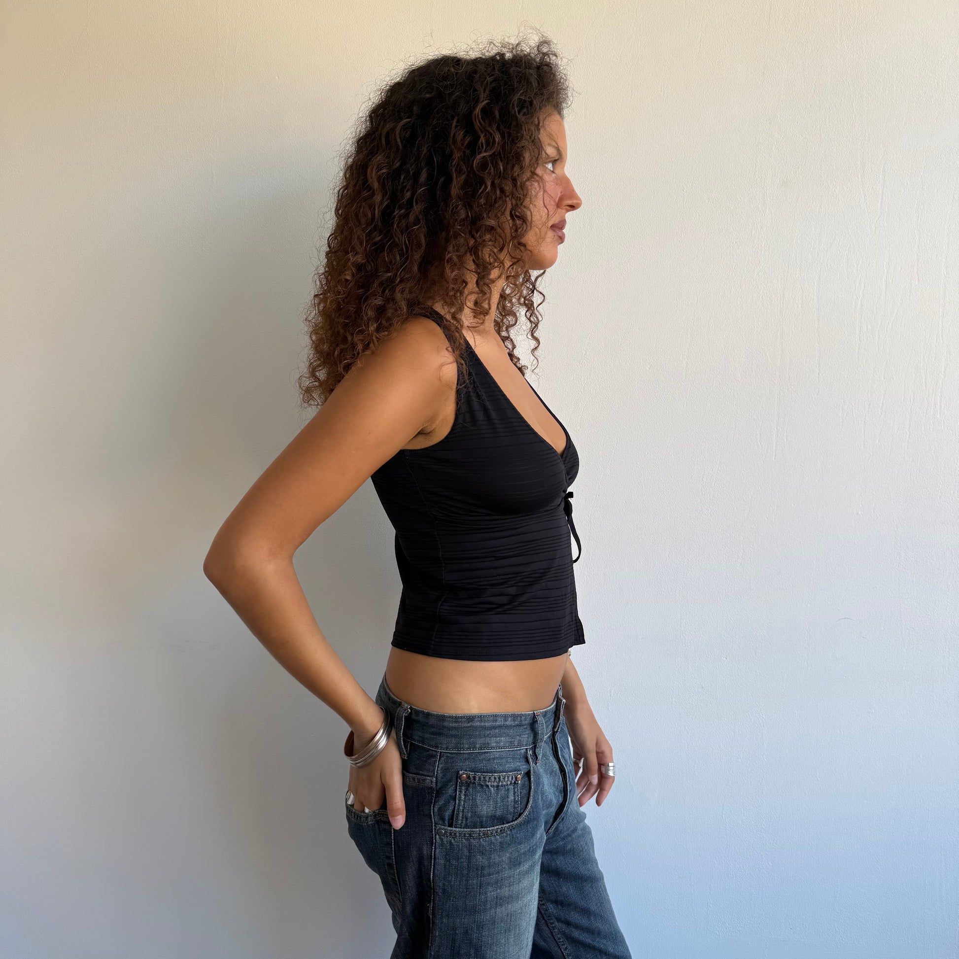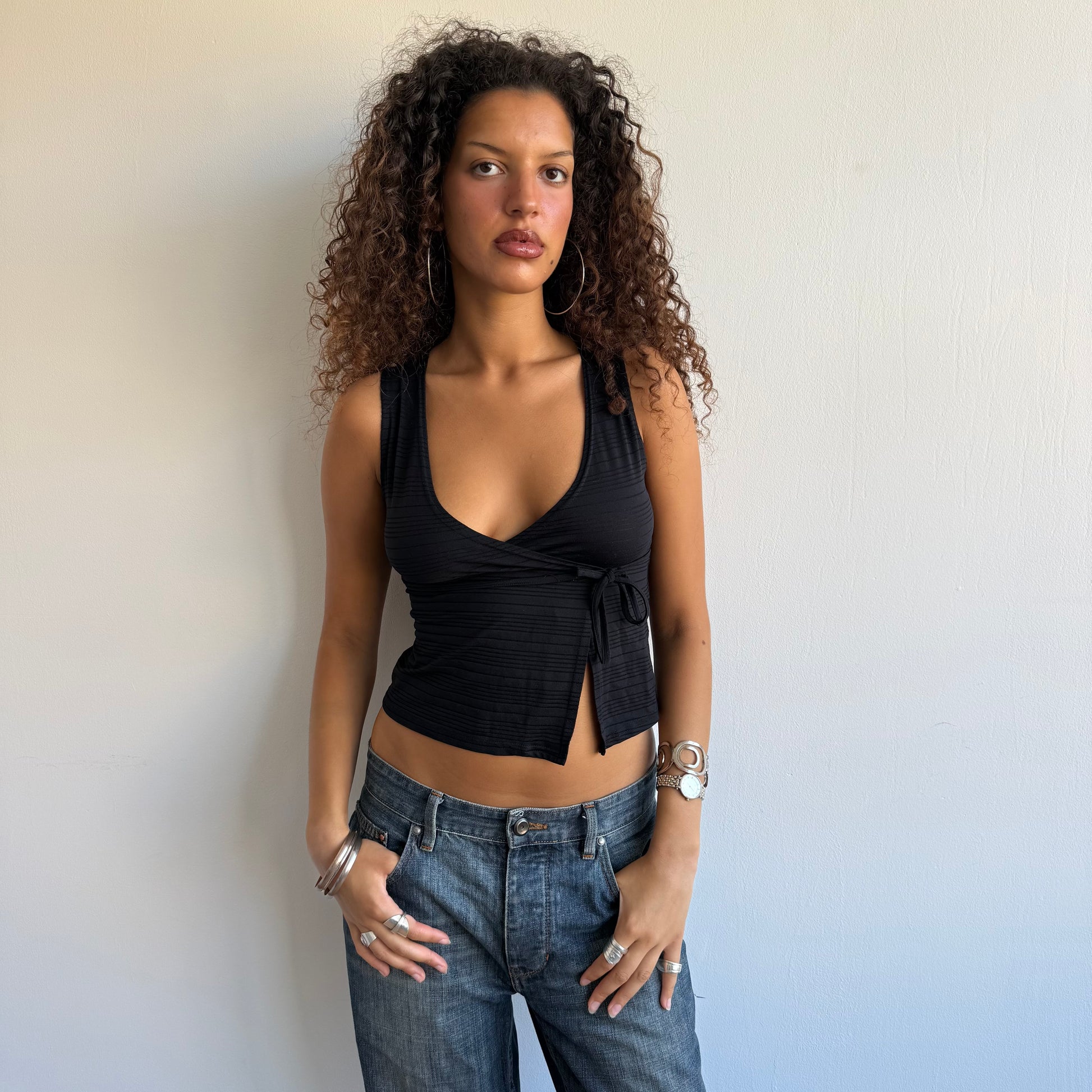 Black stretchy wrap top with stripe pattern and tie around the bust.