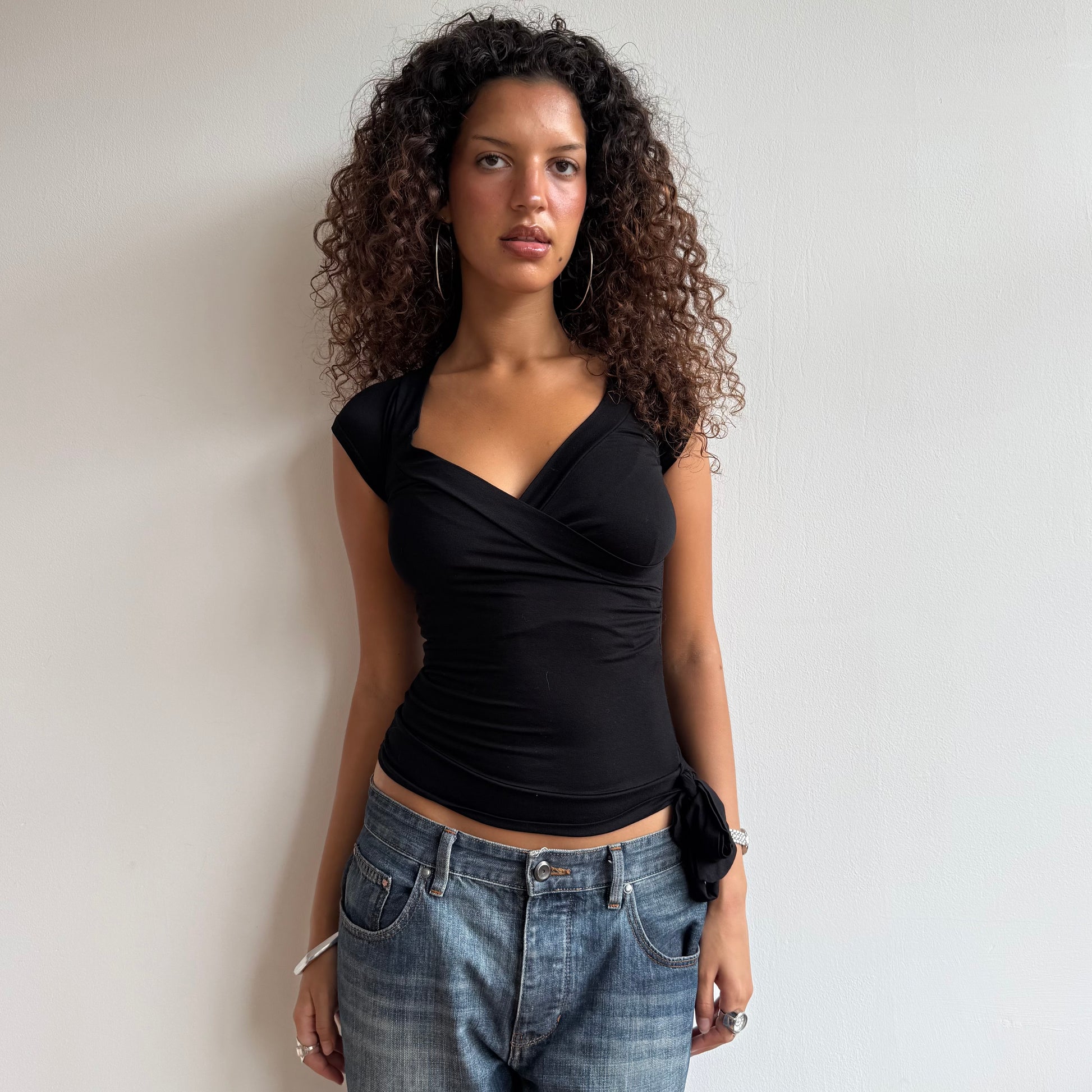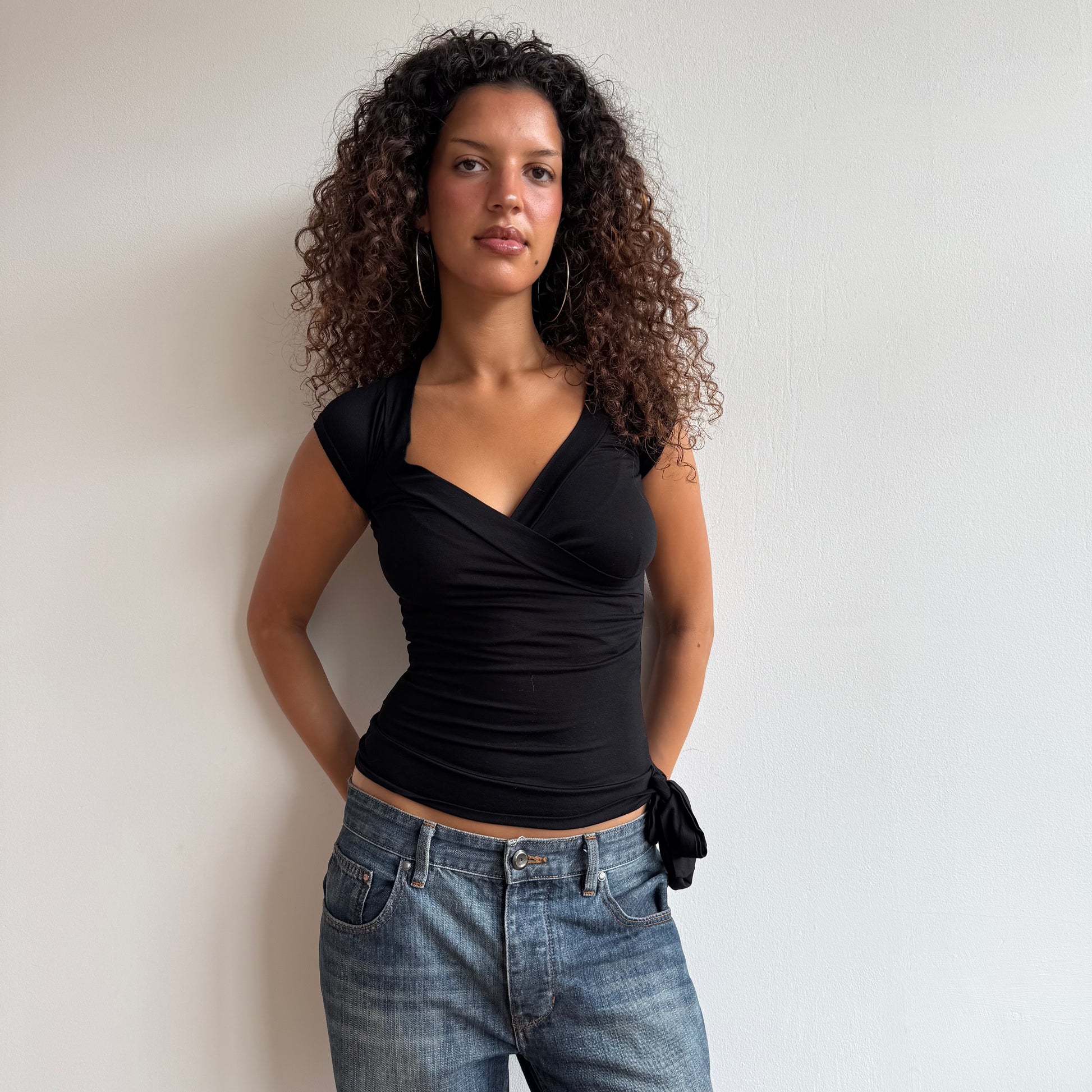 Black stretchy wrap front top with tie side
