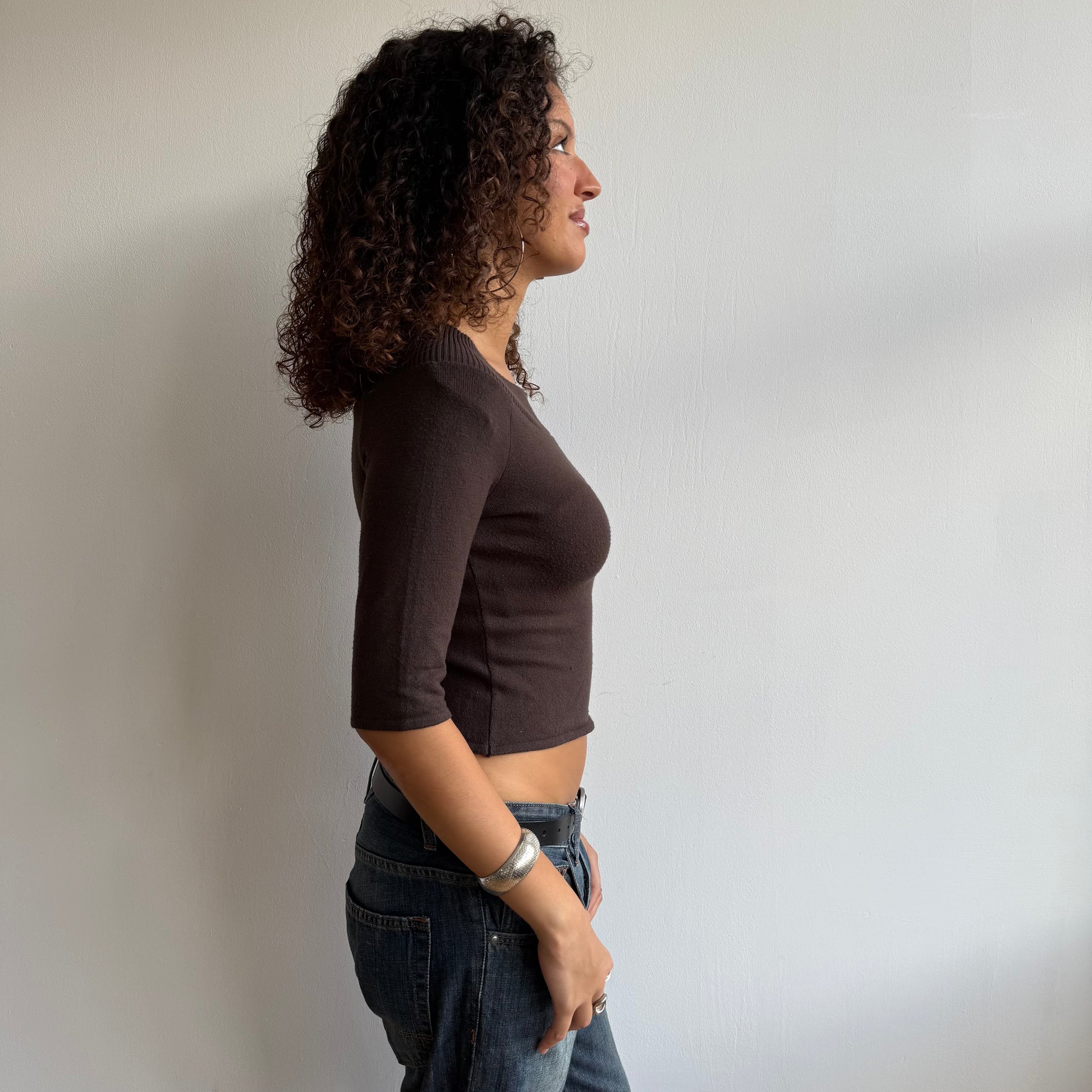 Brown chocolate 3/4 sleeve Bardot knit with buttons on the neckline
