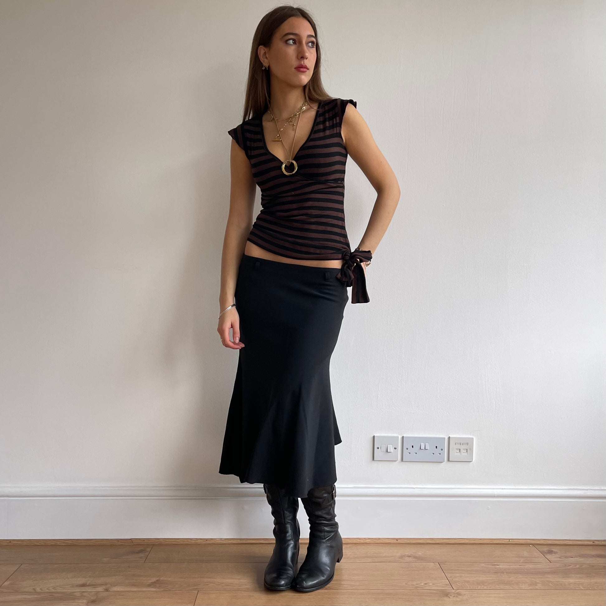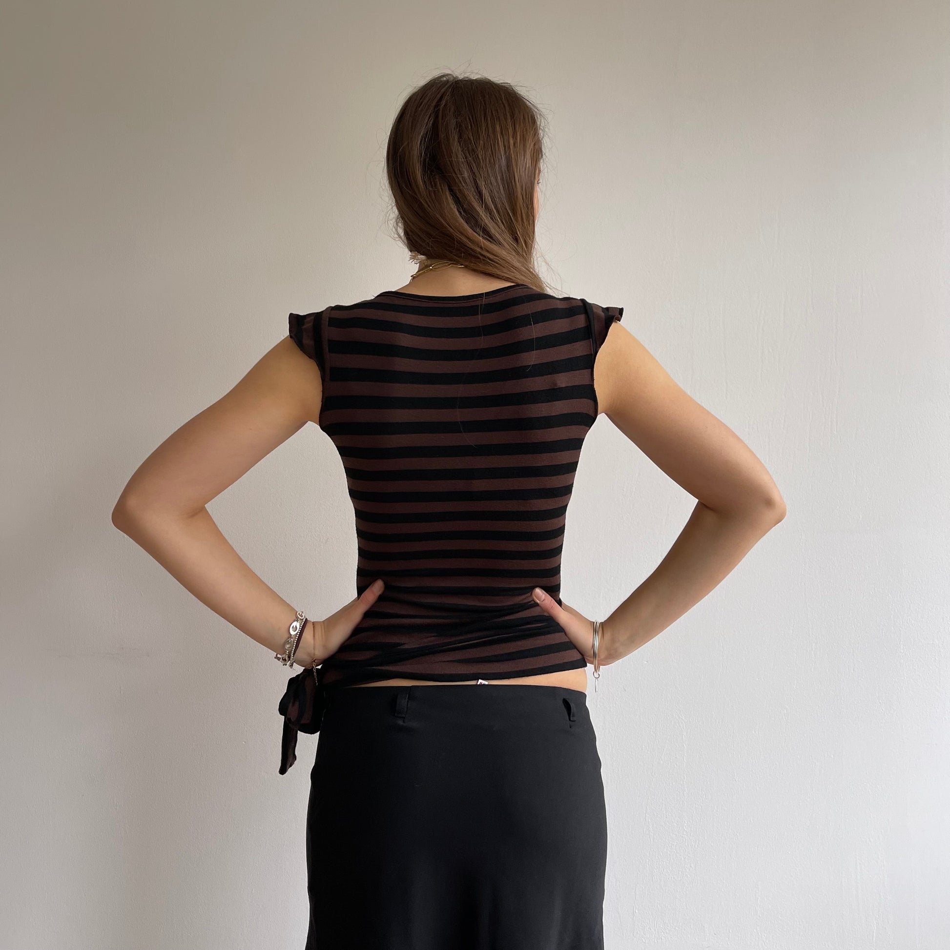 Brown and black striped t-shirt top with ballet wrap front and bow tie on the waist