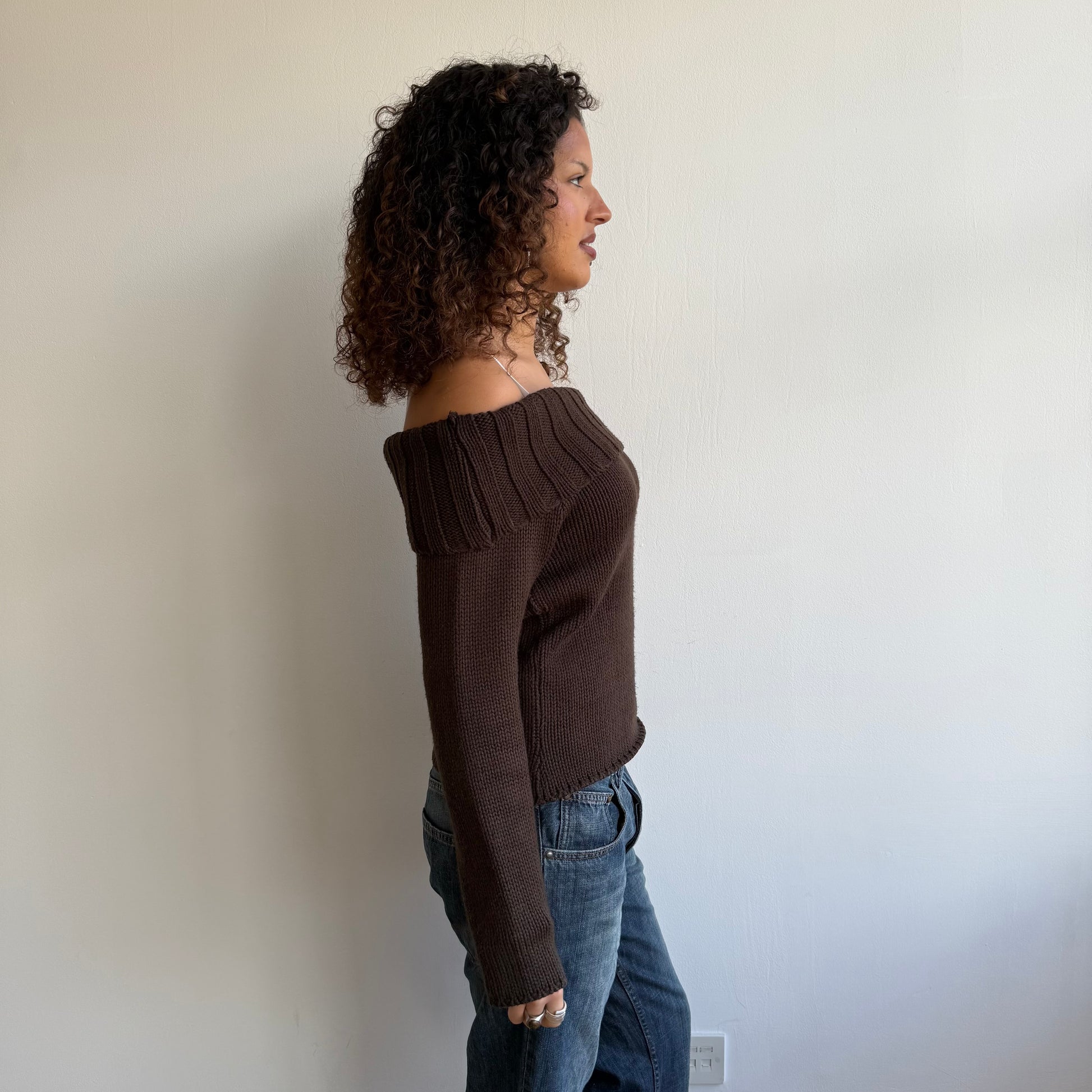 Brown chunky knit off the shoulder jumper
