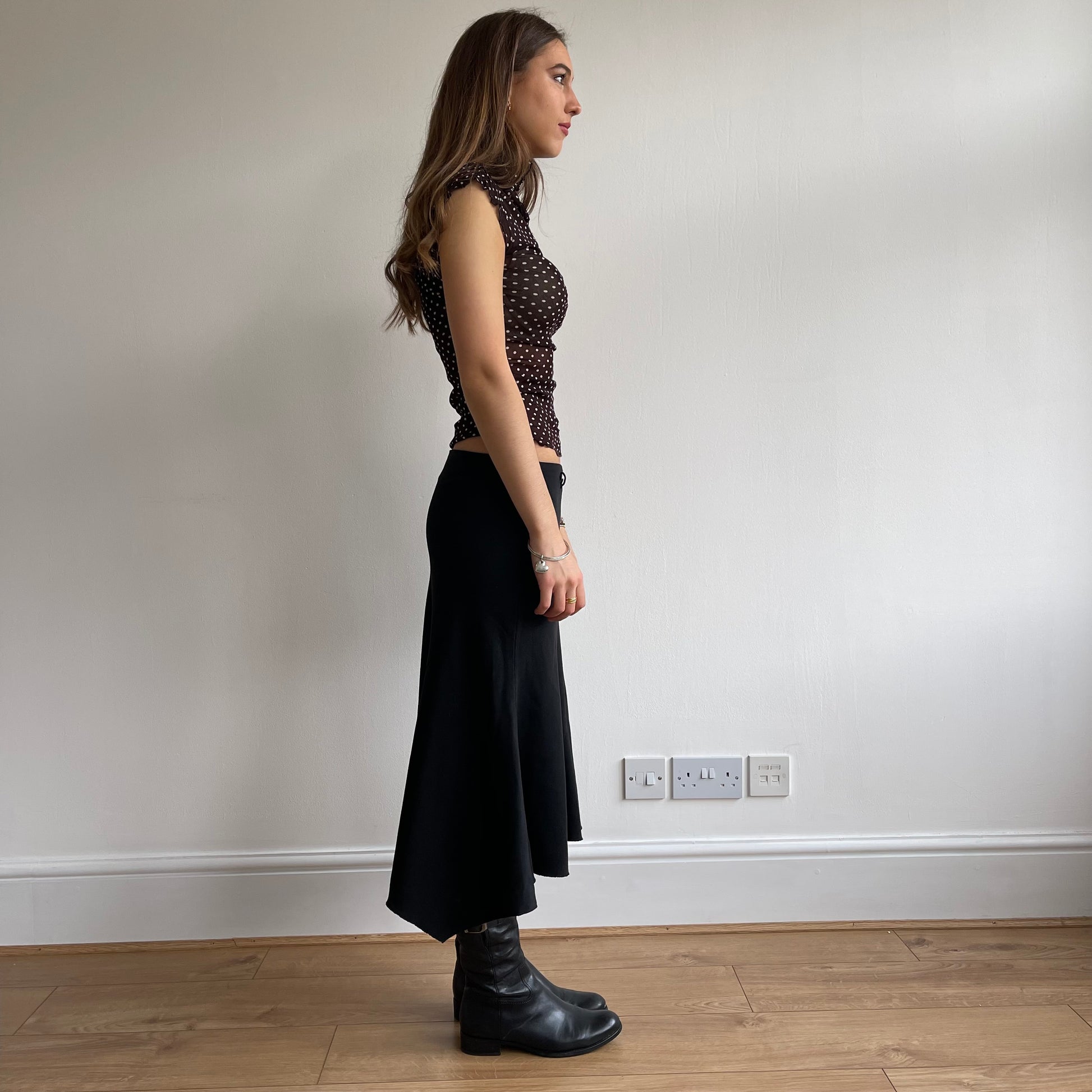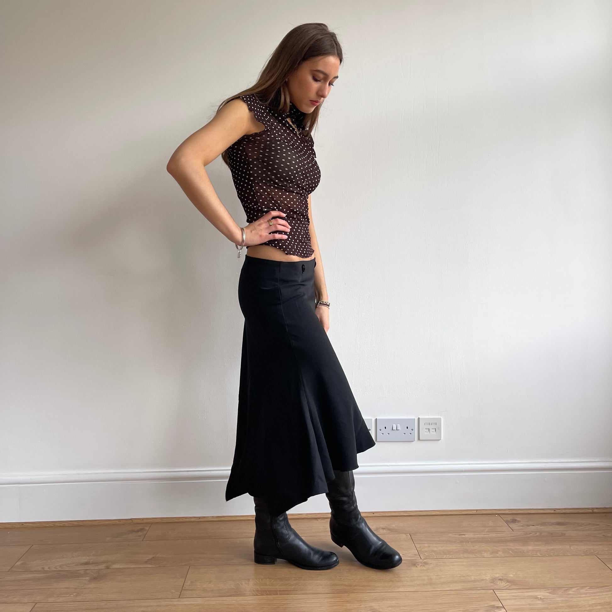 Brown and white polka dot mesh high neck top with capped sleeves. We have styled it with the keyhole detailing at the front, but its technically meant to be worn at the back