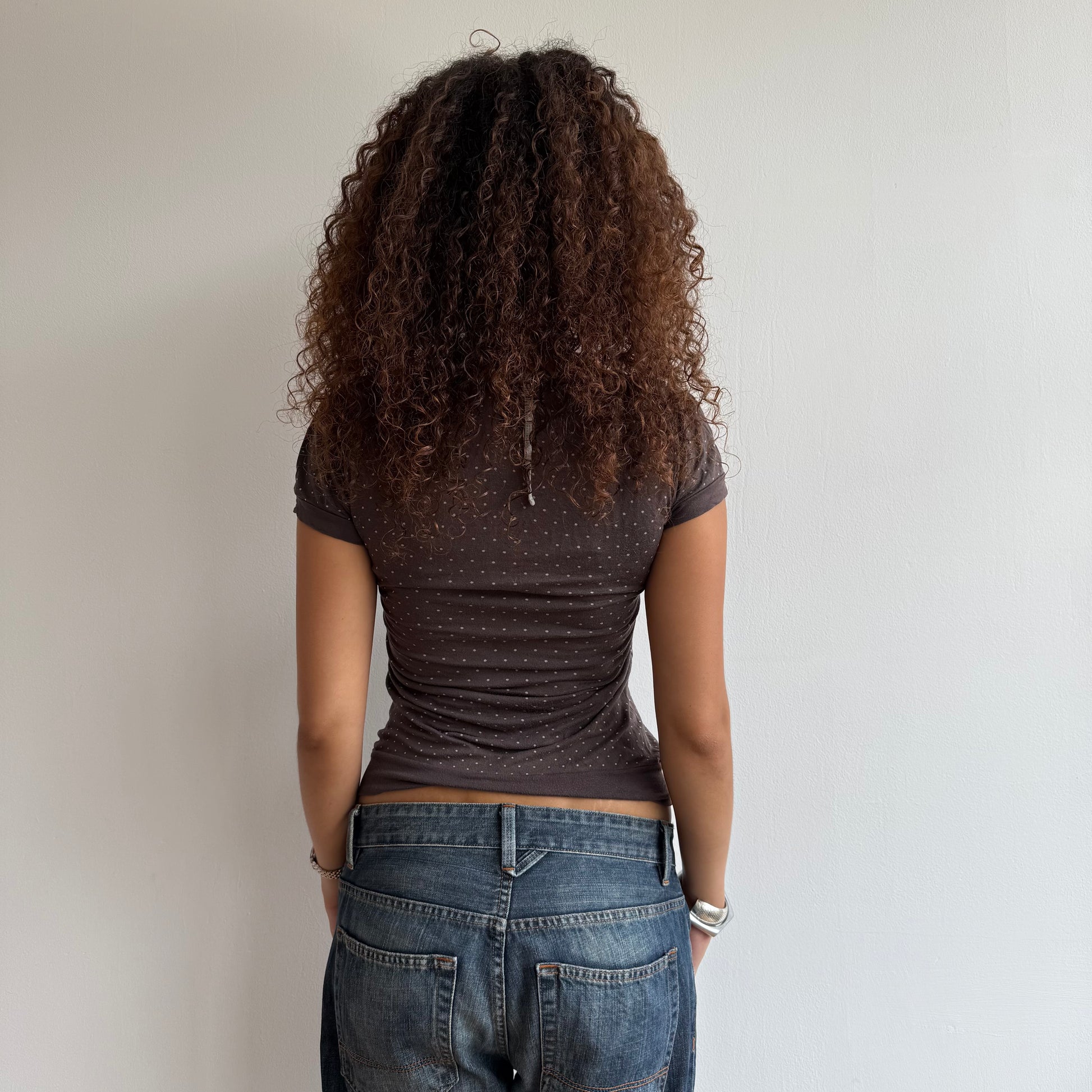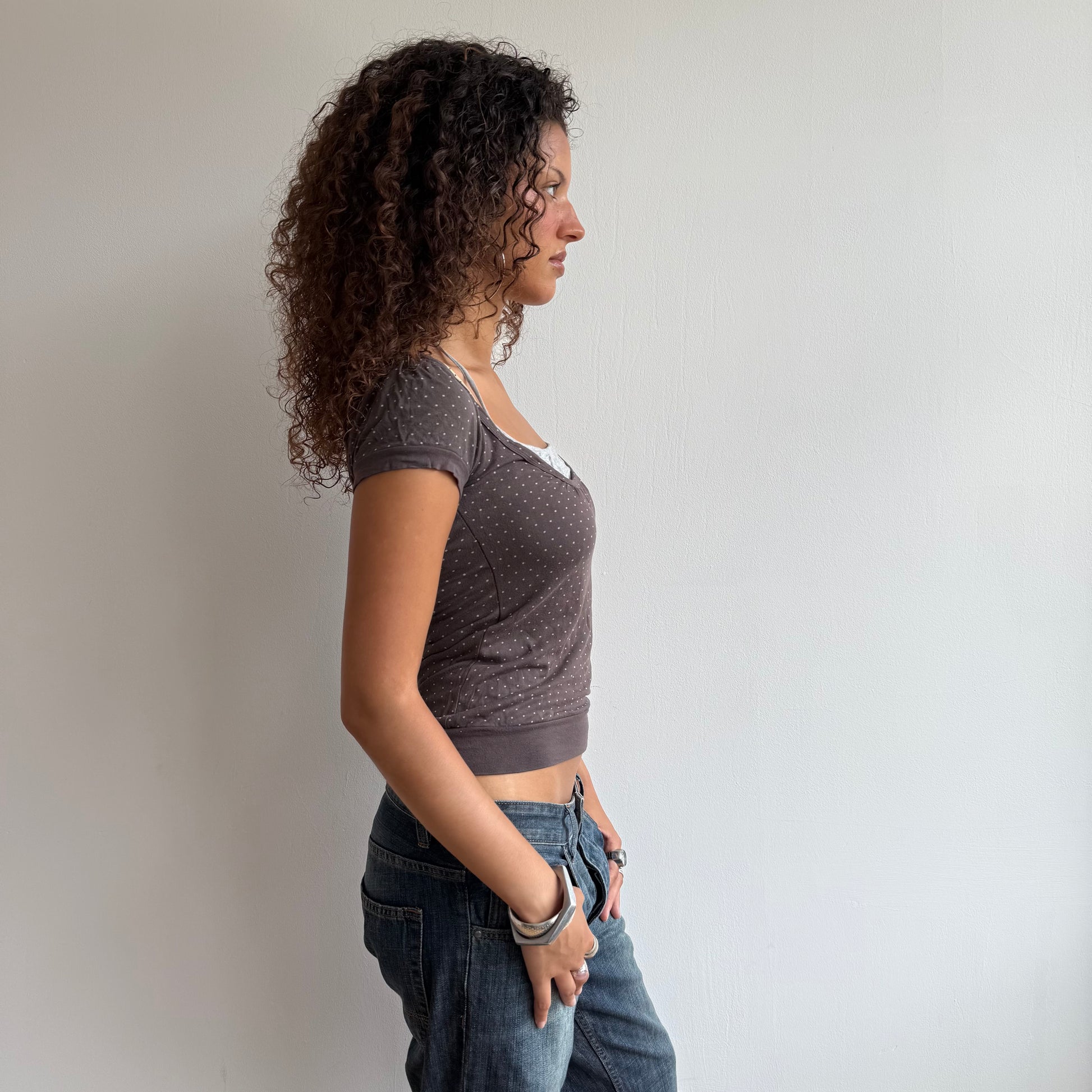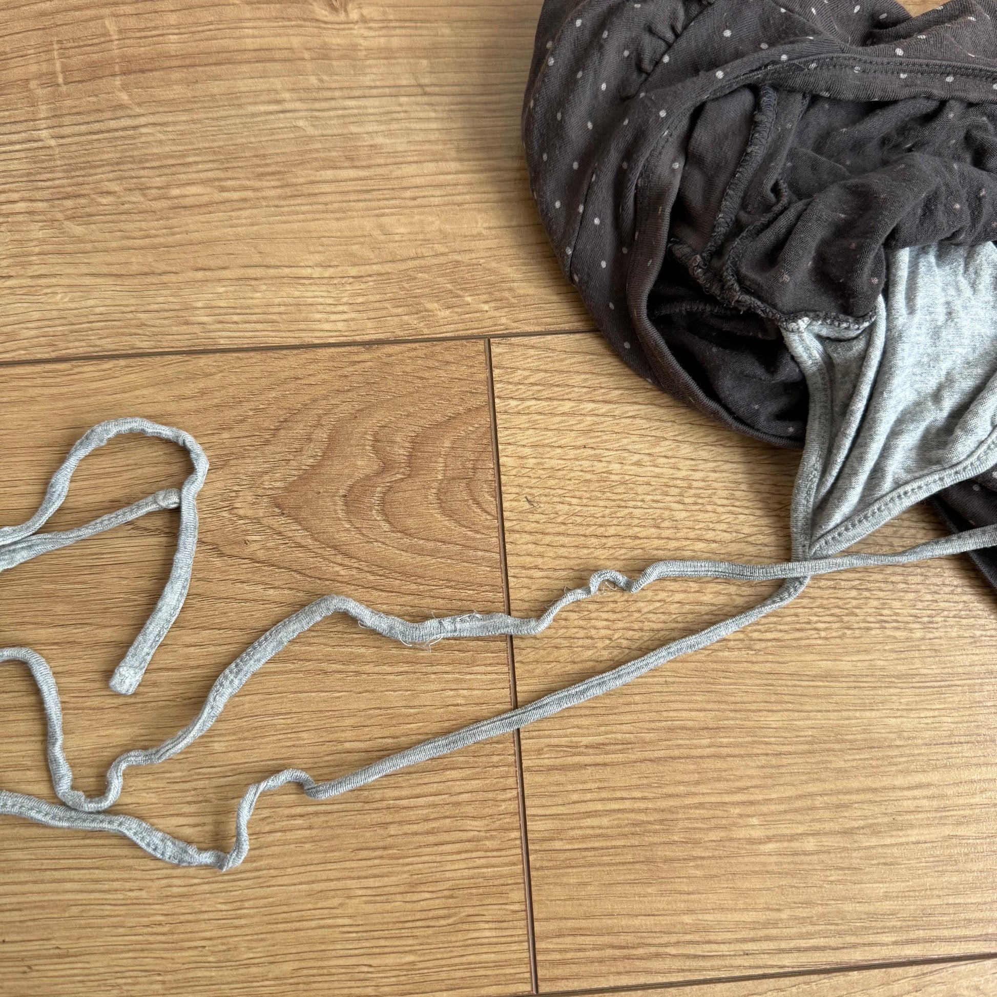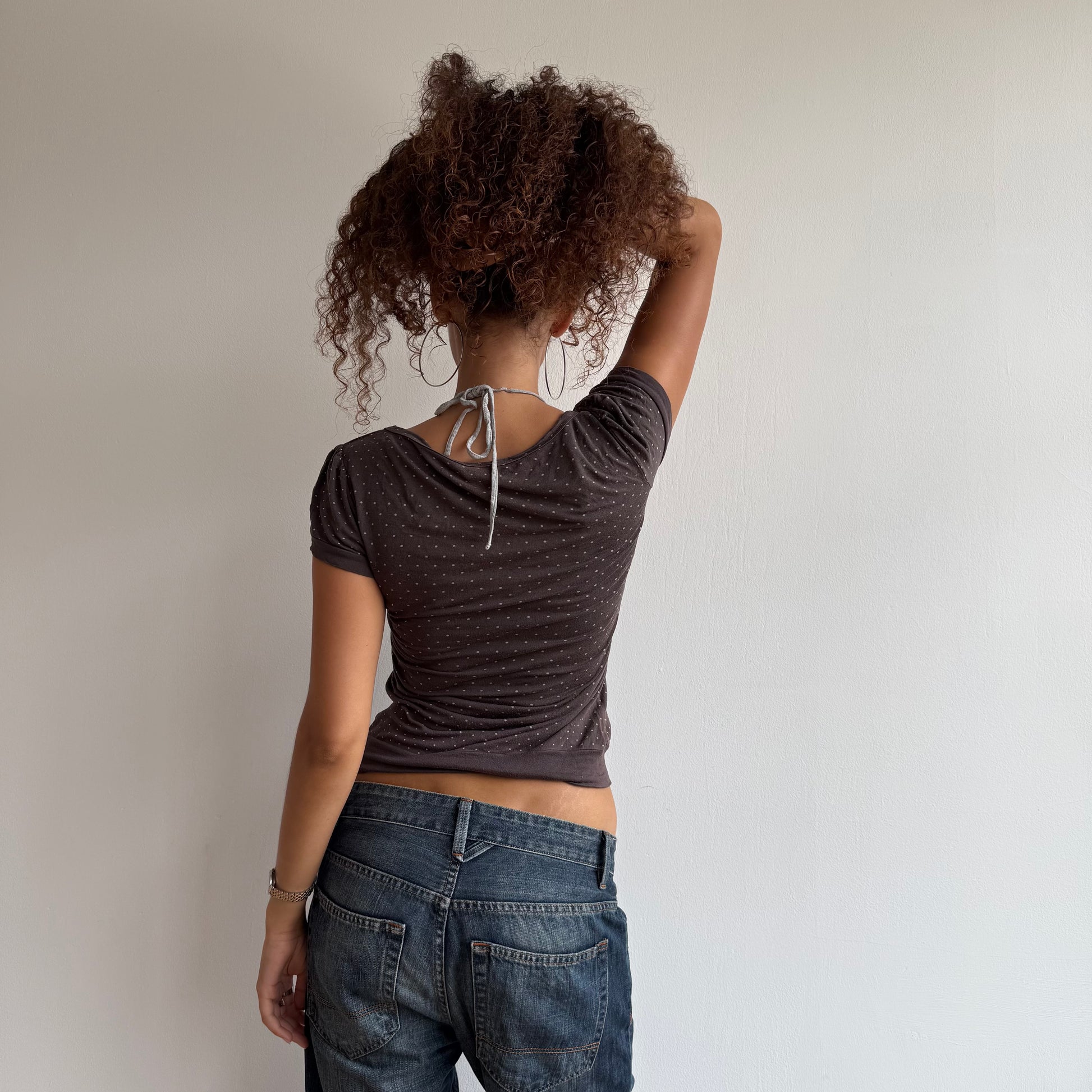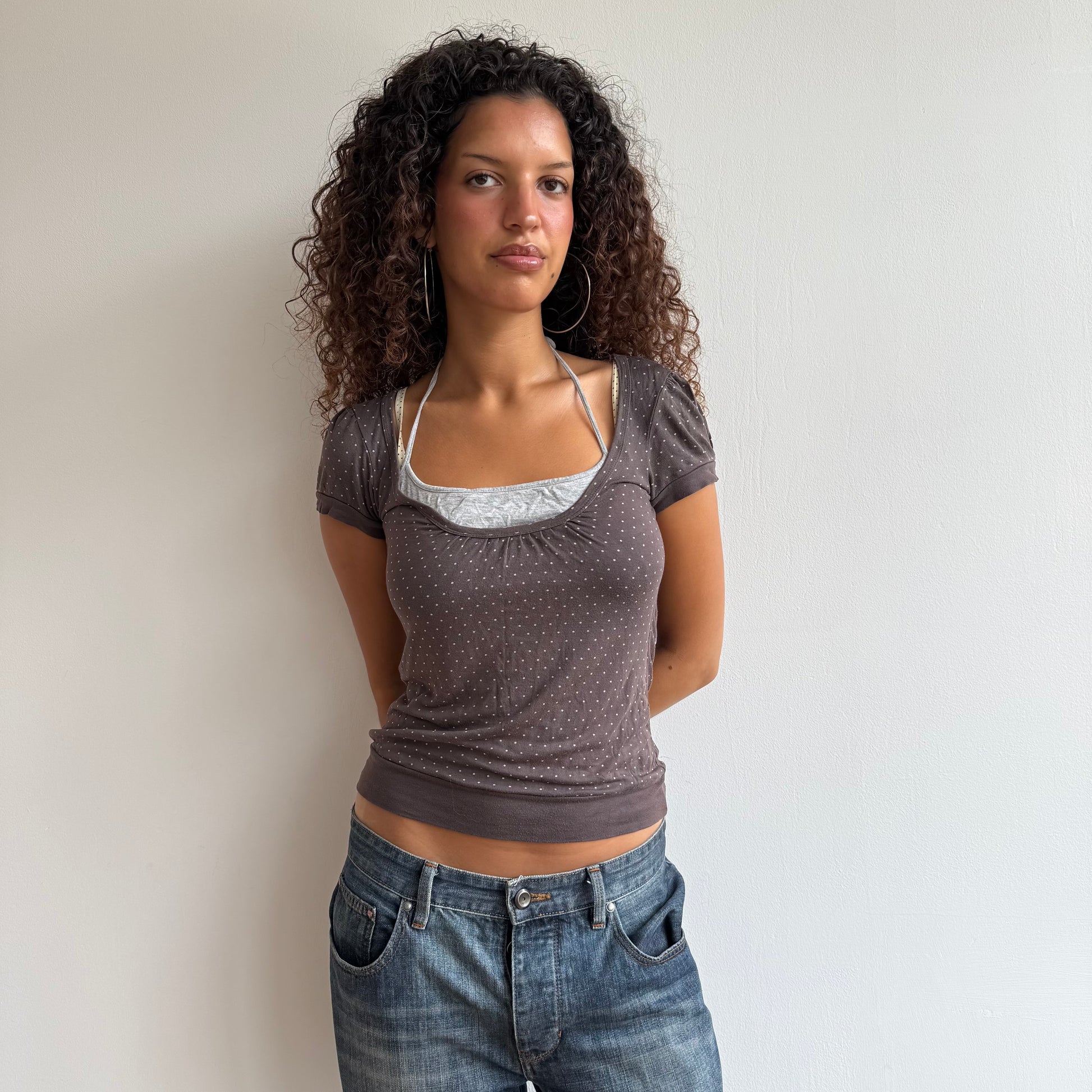 Brown and grey polka dot top with inbuilt striped halter neck detailing