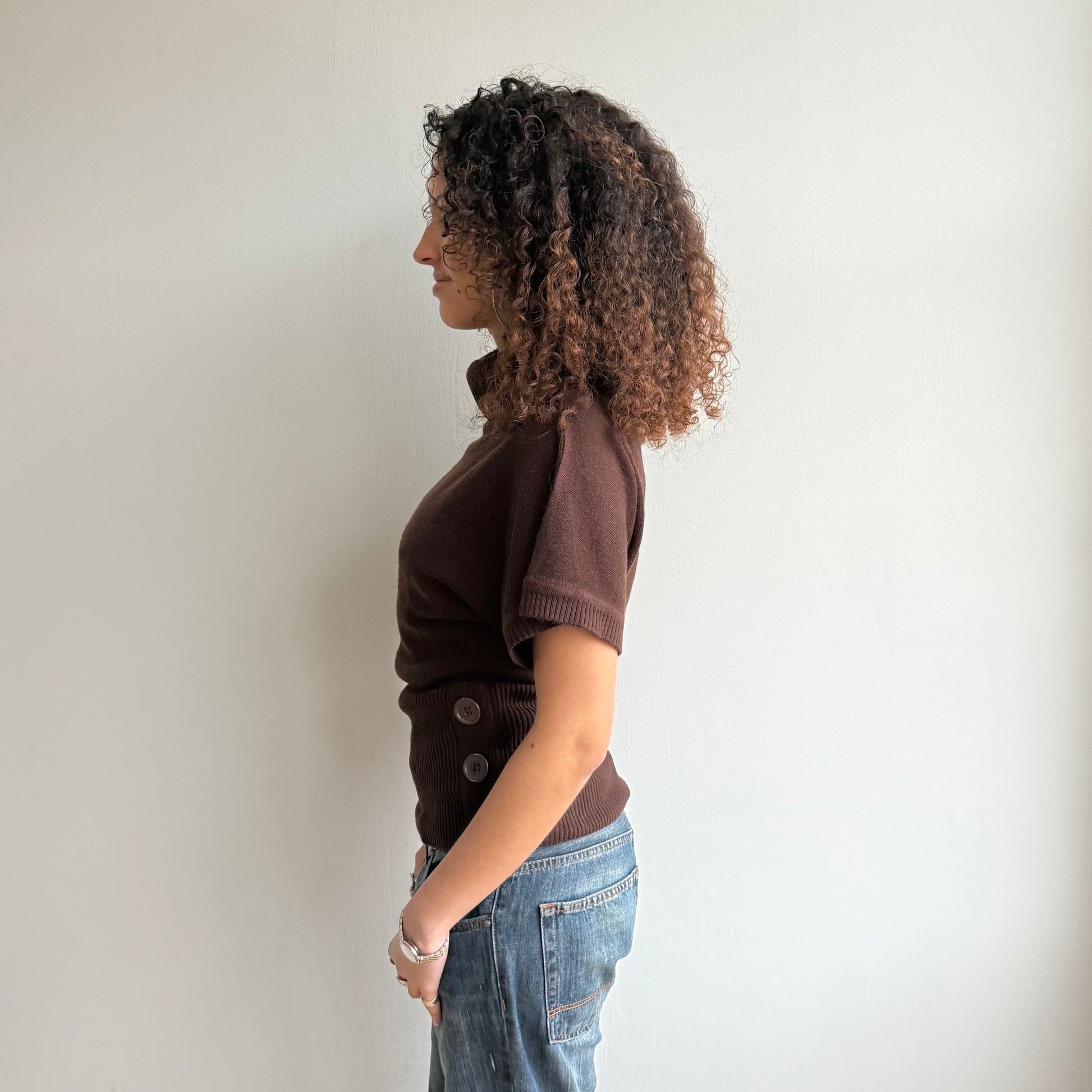 Brown short sleeve roll neck jumper with buttons at the waist
