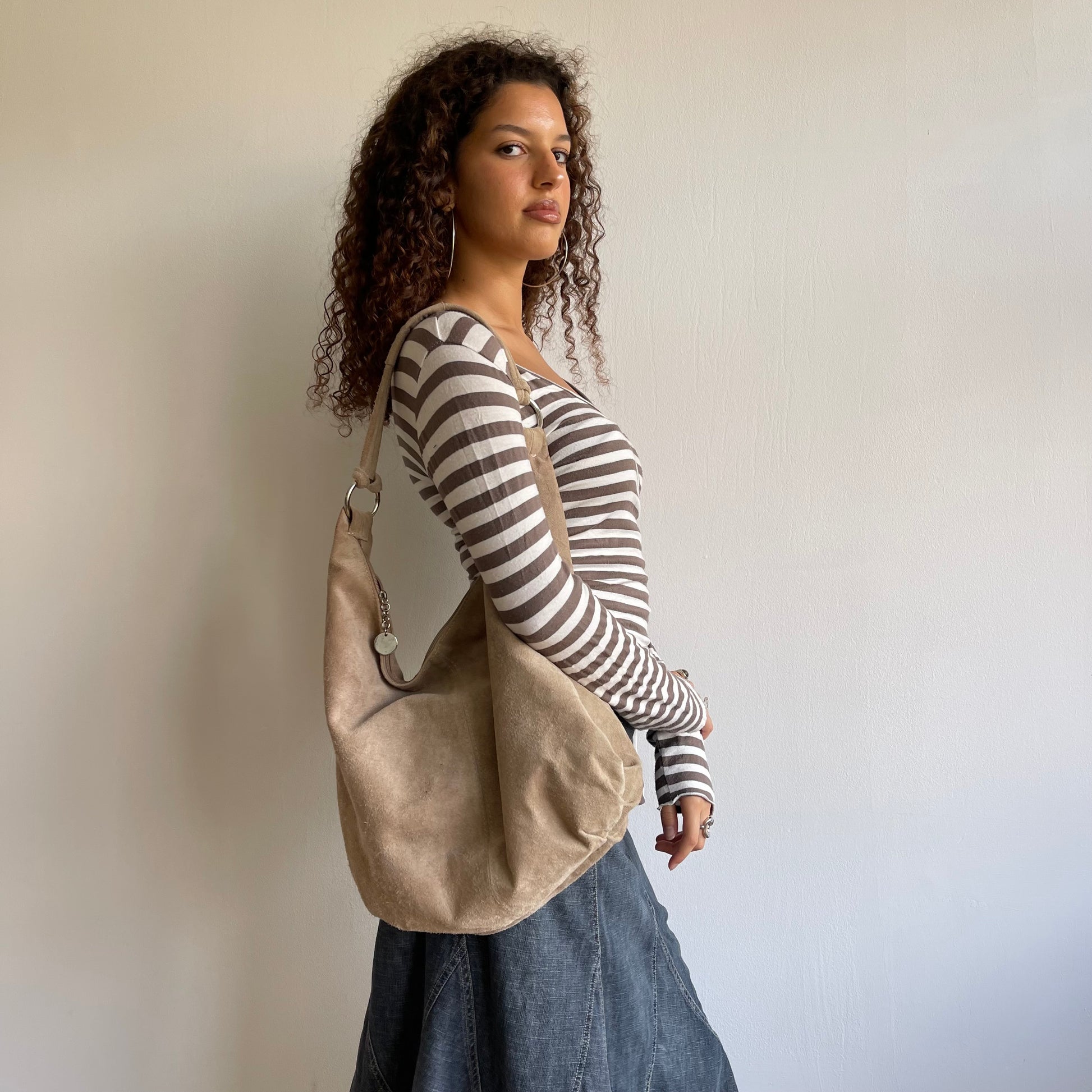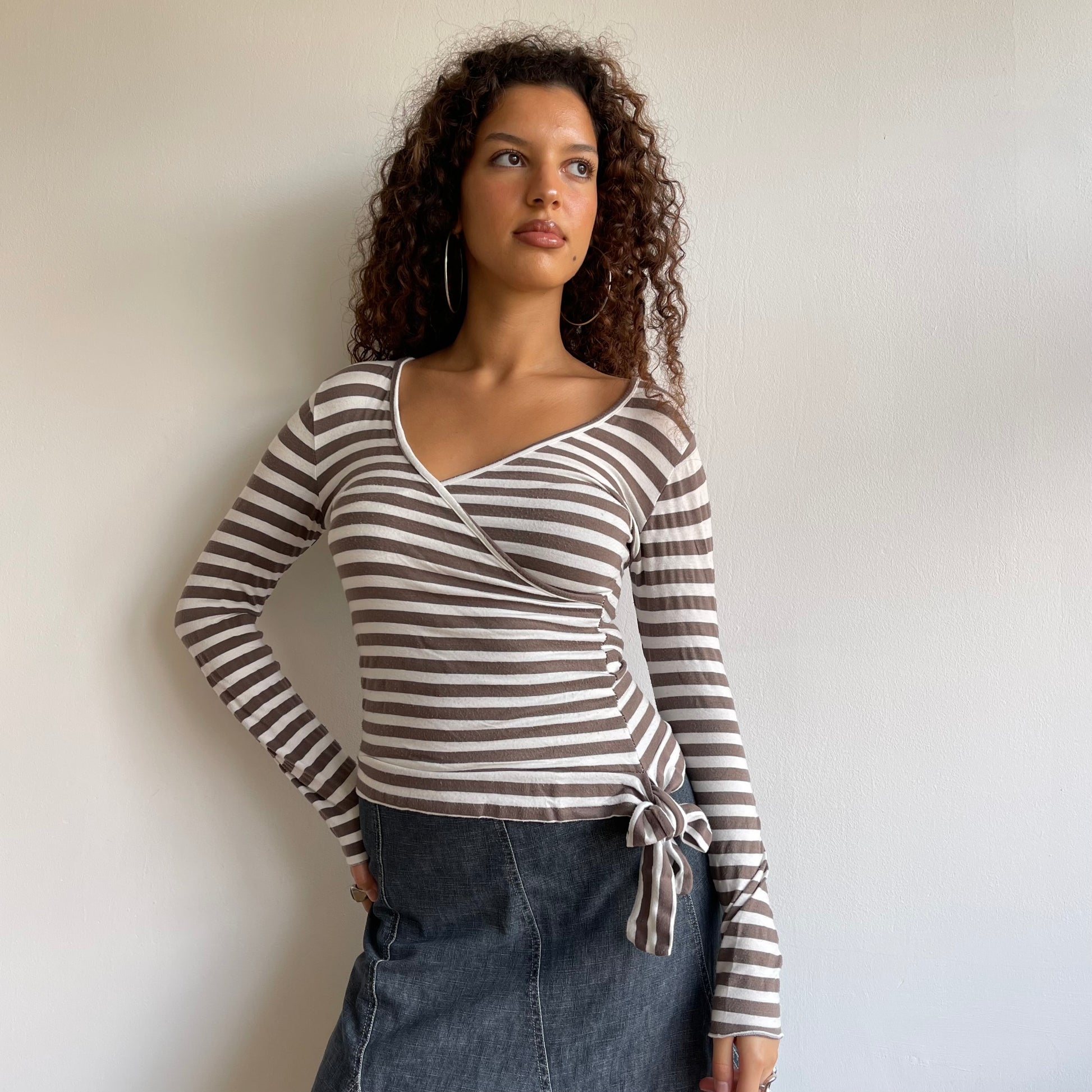 Light brown and white striped long sleeve top with ballet wrap front and tie side detail at the waist