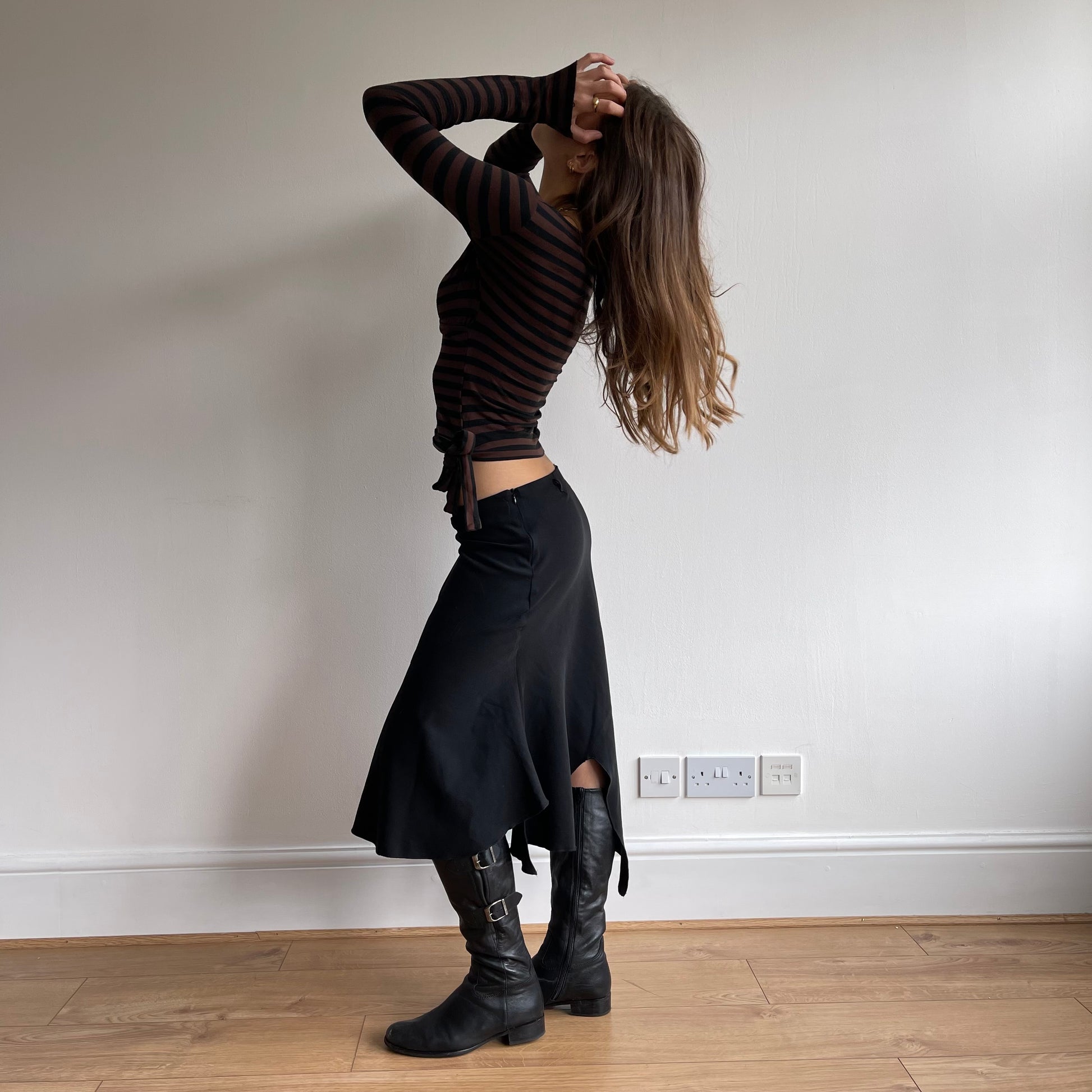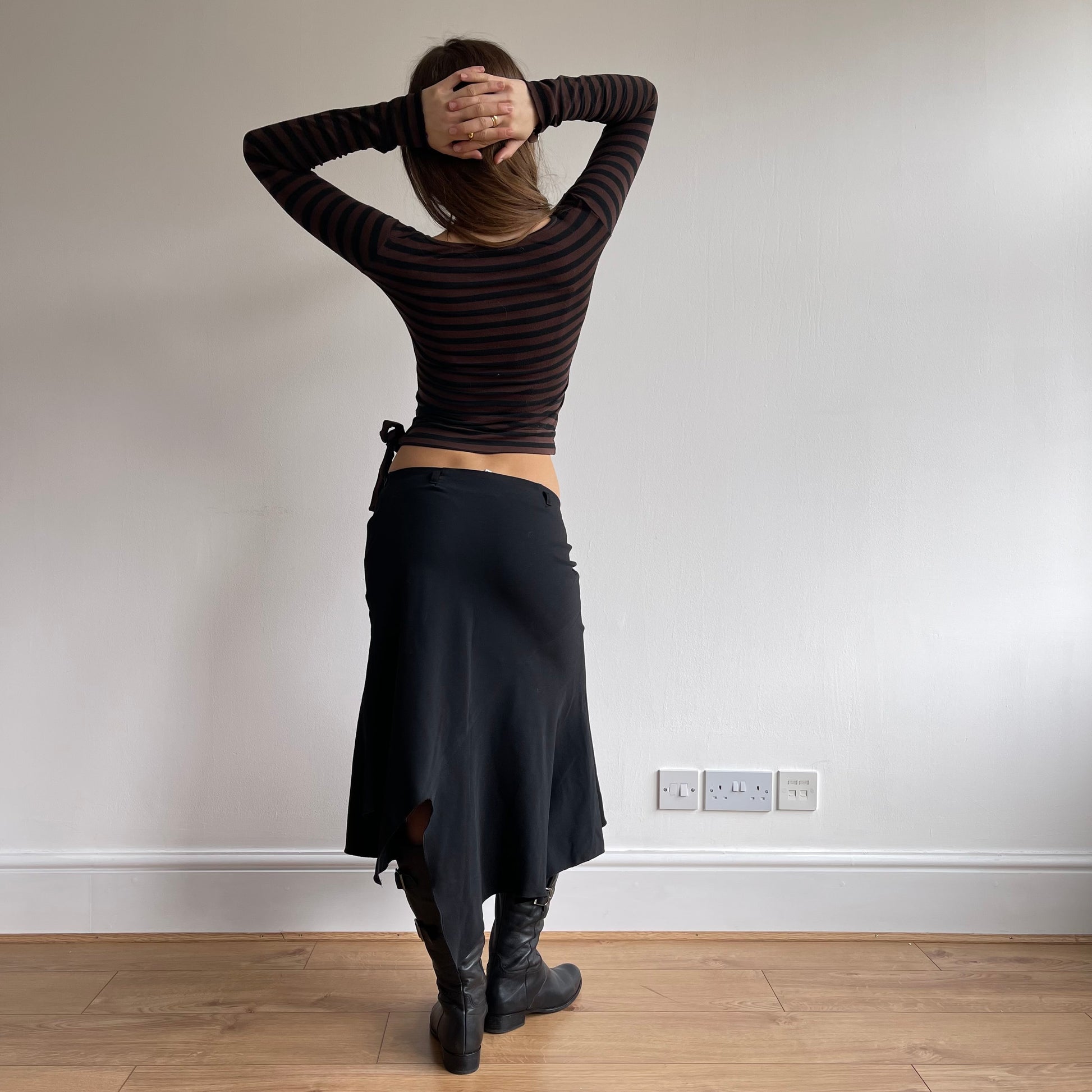 Brown and black striped long sleeve ballet wrap top with bow tie side