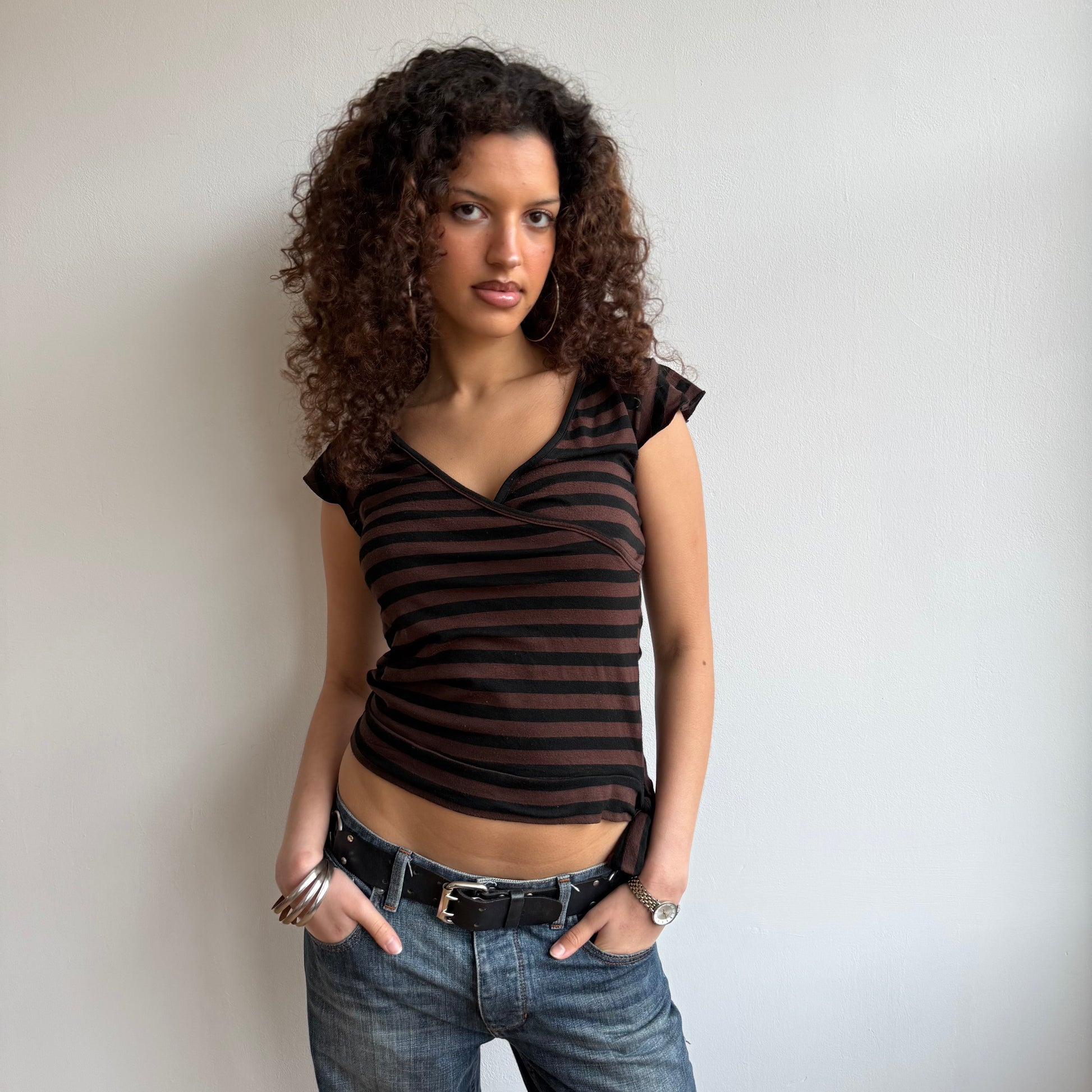 Brown and black striped short sleeve top with bow tie side