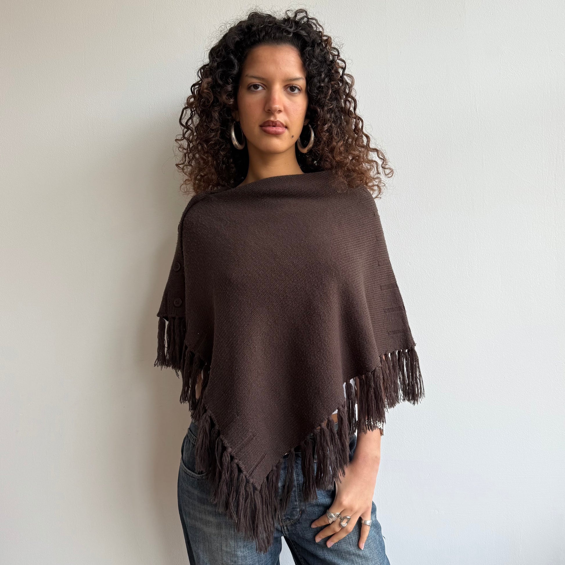 Brown knit poncho with tassels and buttons on one side