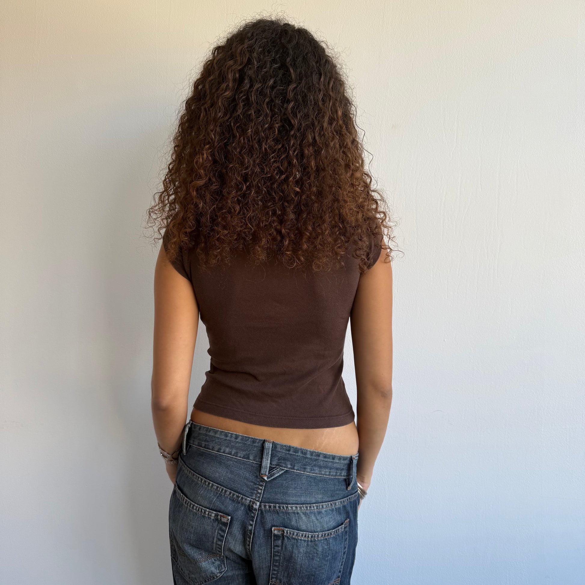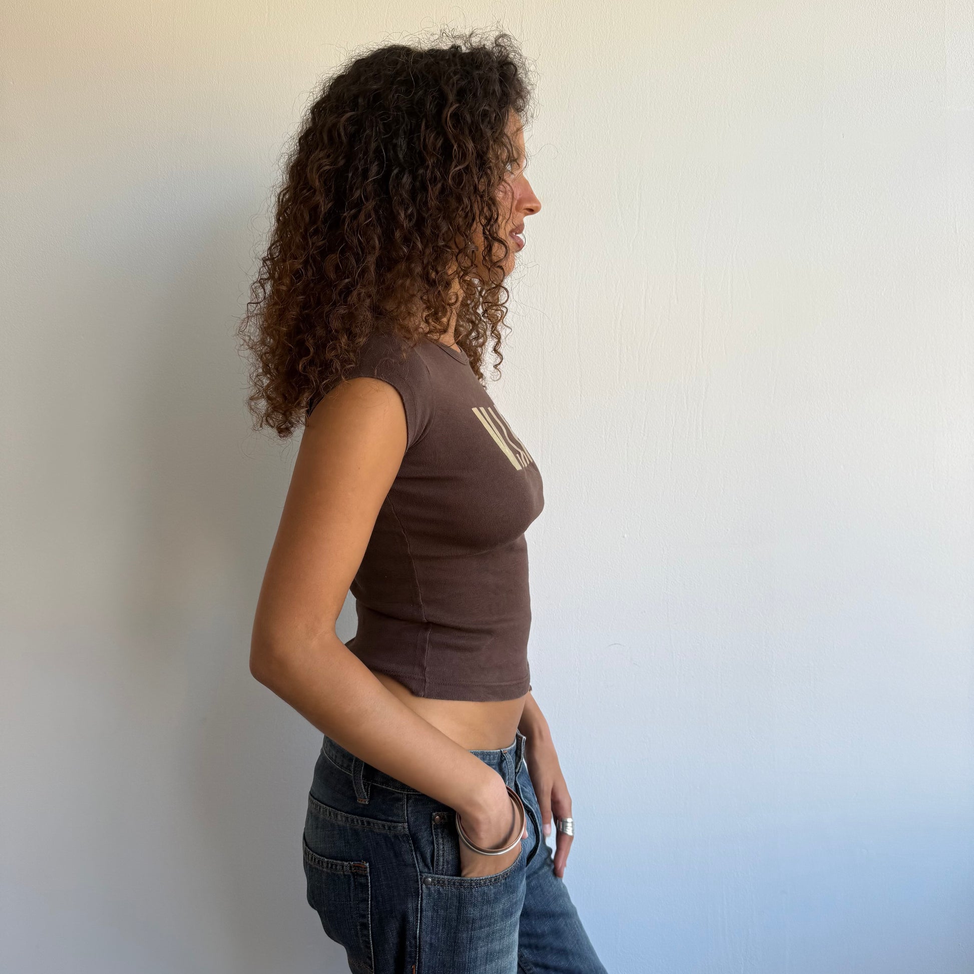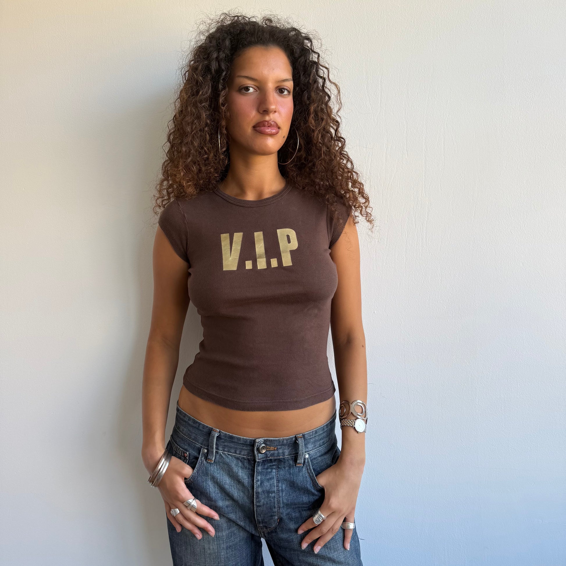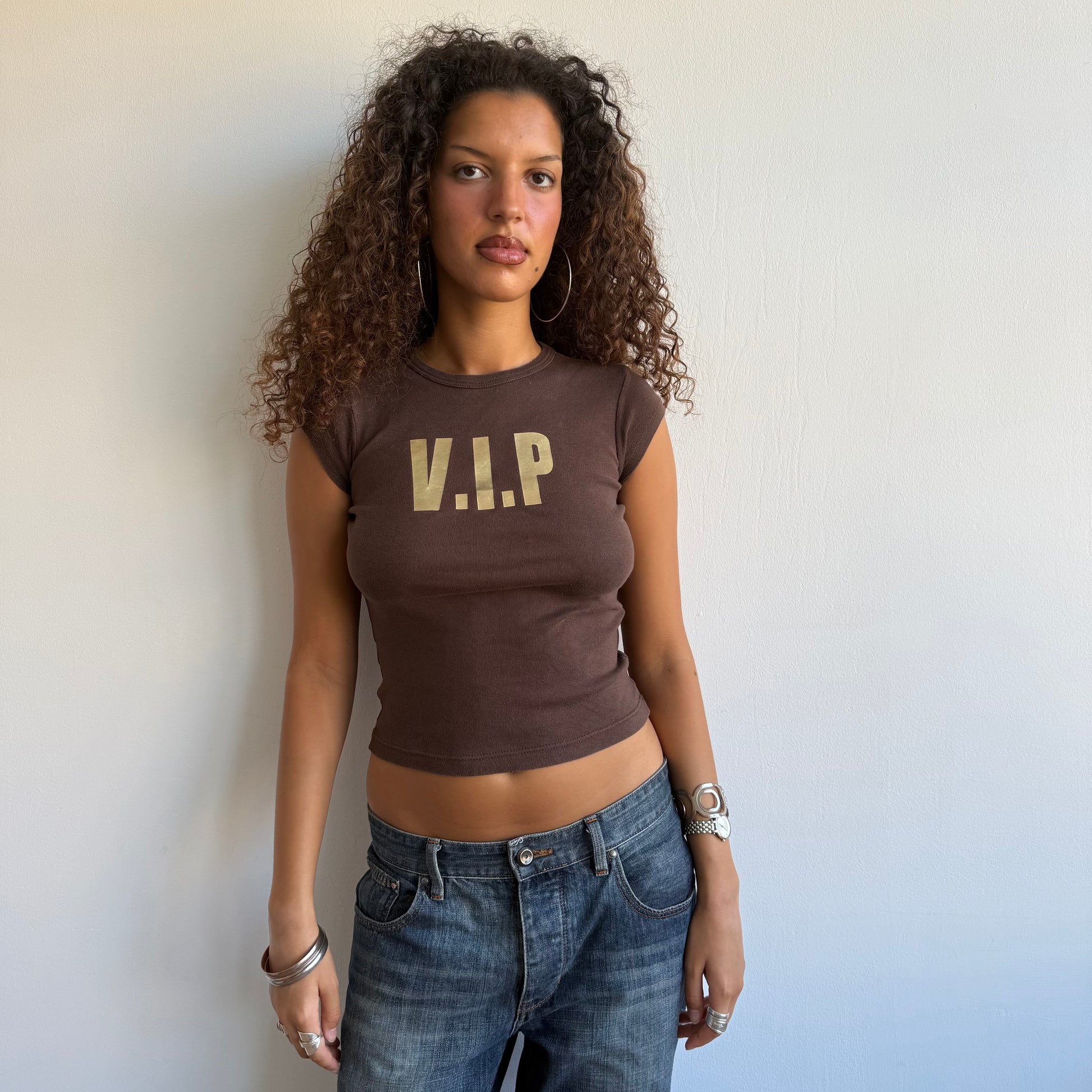 Brown 90’s baby tee with gold VIP logo on the front and back