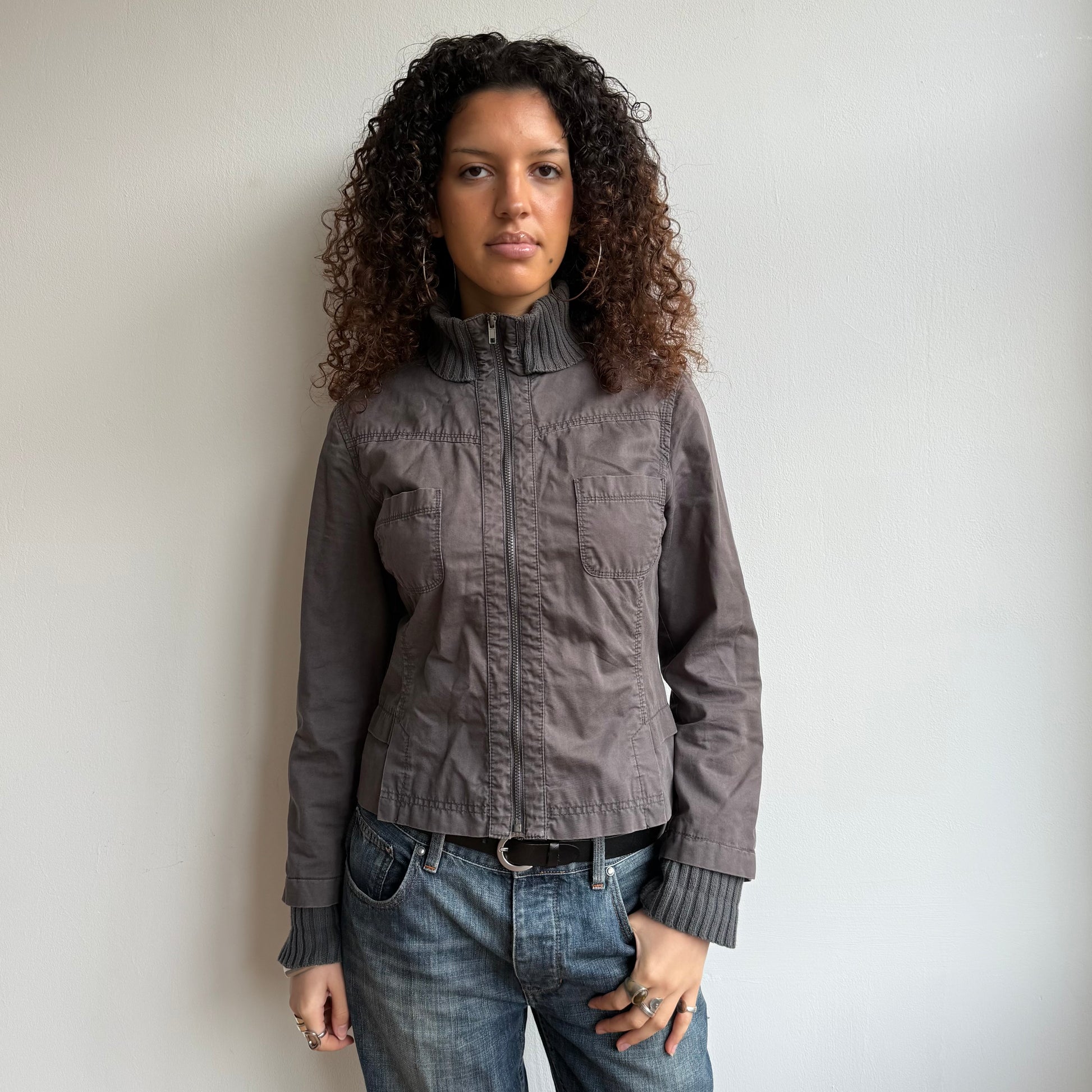 Charcoal grey bi-material cargo jacket with zip up closure and tie details