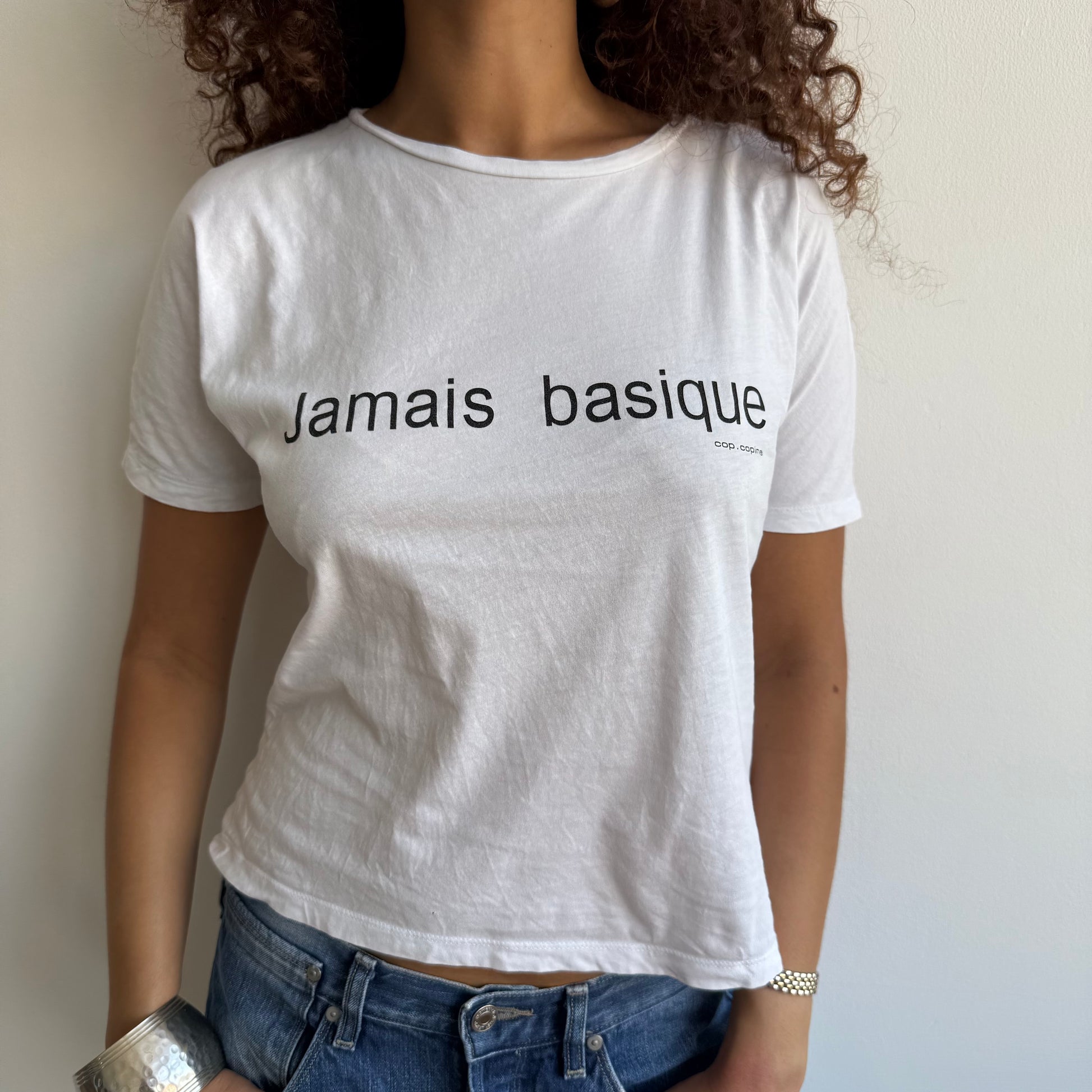 White Cop Copine graphic tee with ‘jamais basique’ on the font