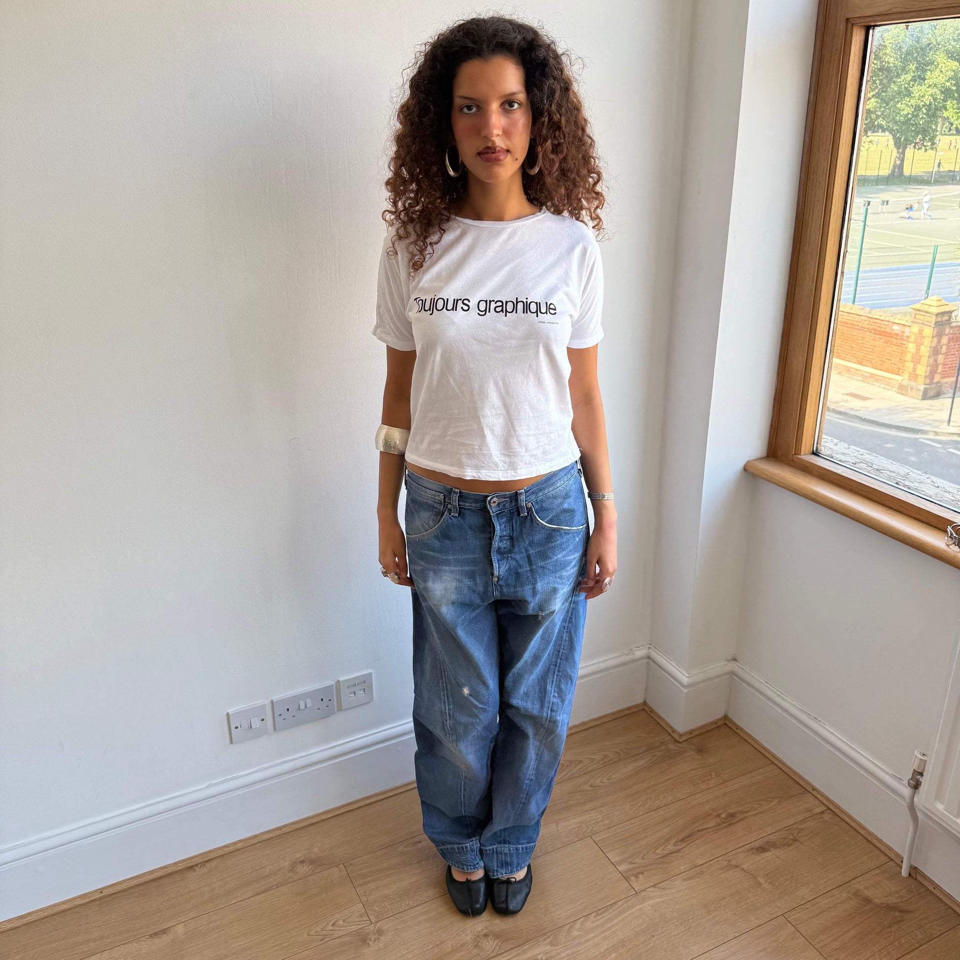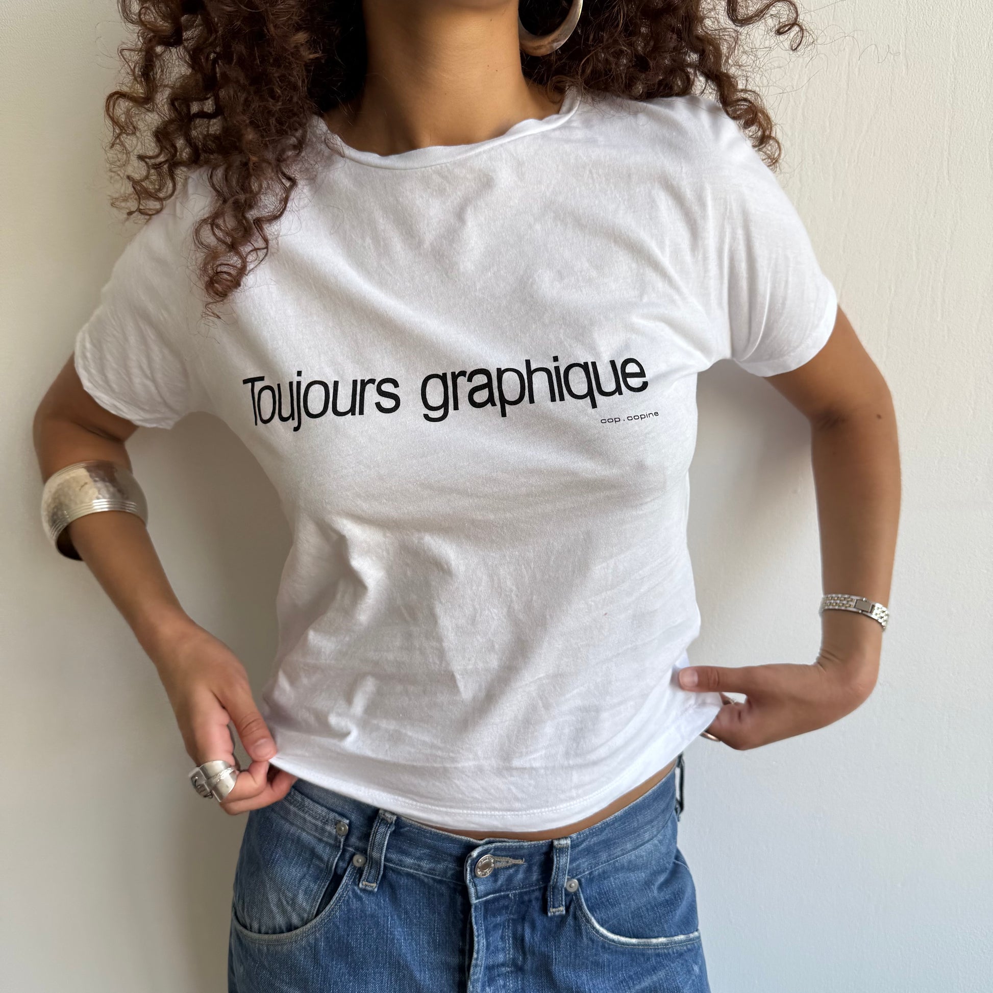 White Cop Copine graphic tee with ‘toujours graphique’ on the font