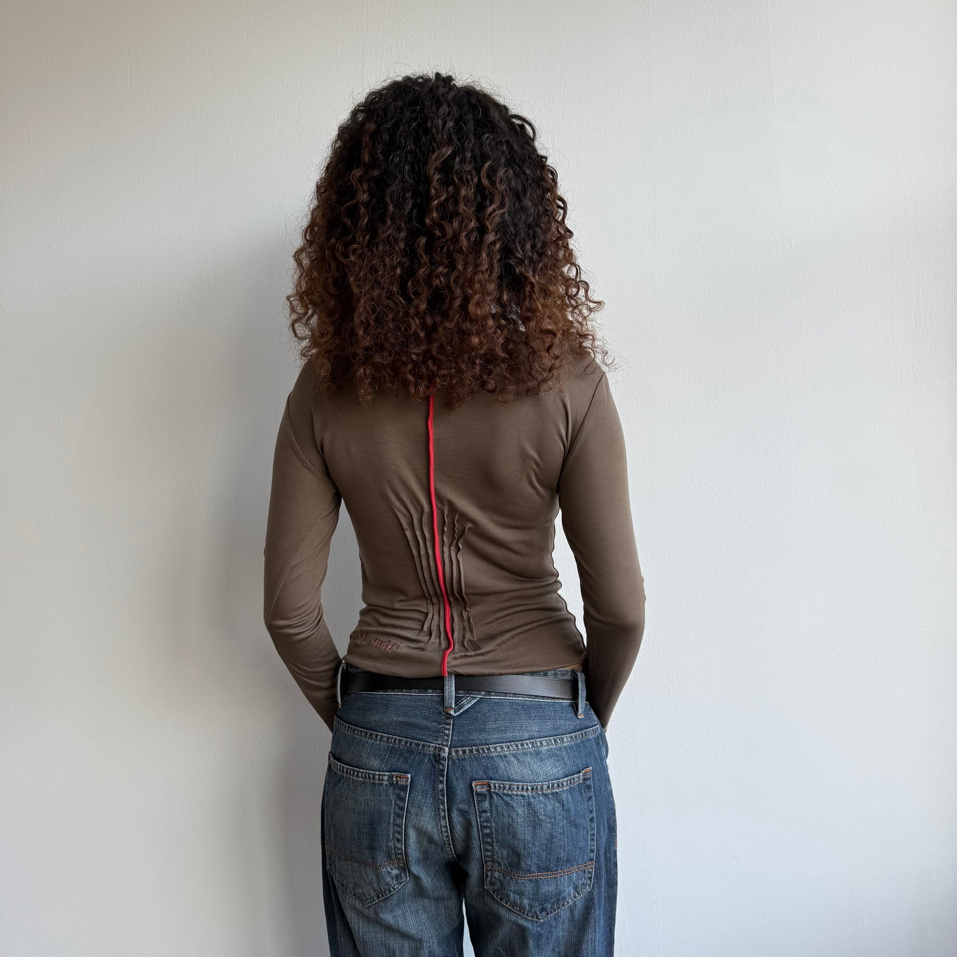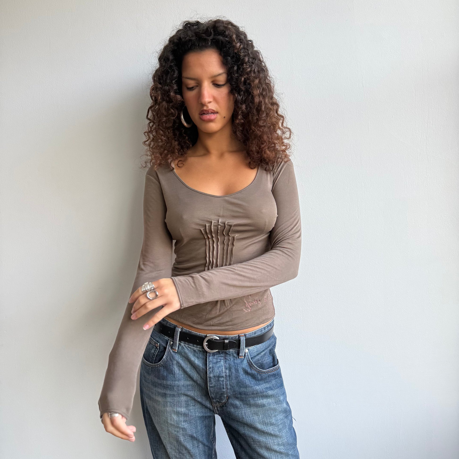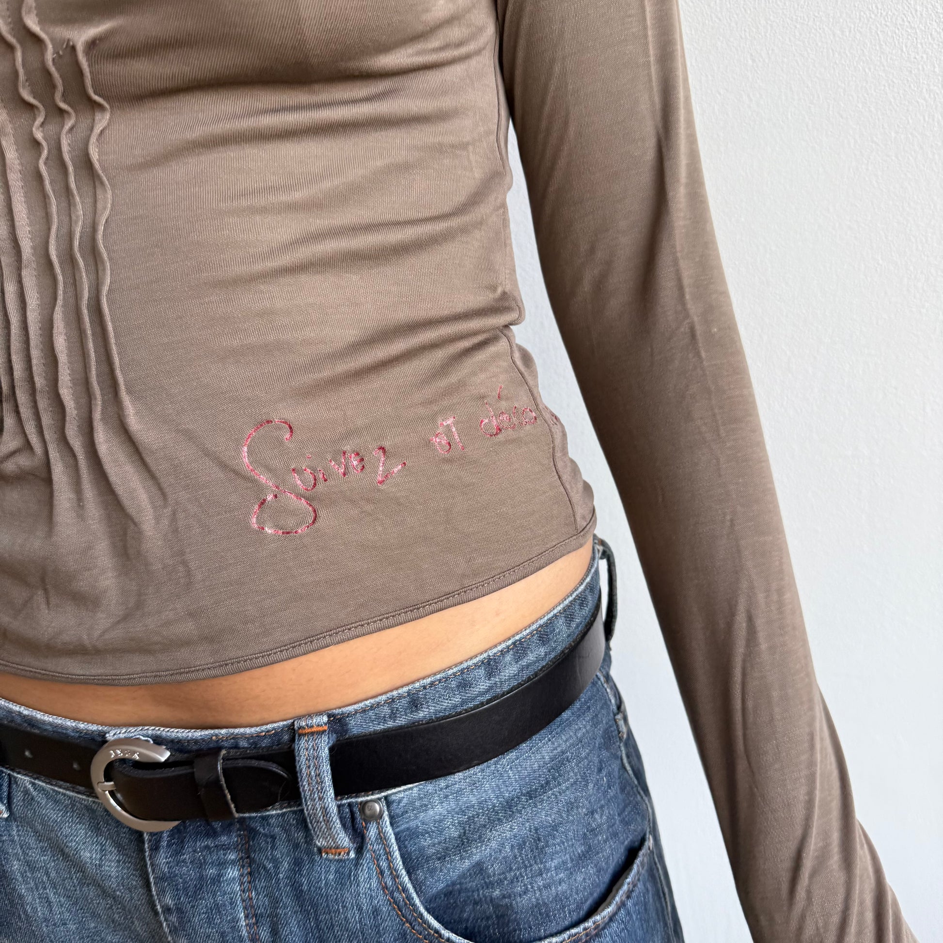 Cop copine taupe long sleeve top with ruffle front detailing and red text