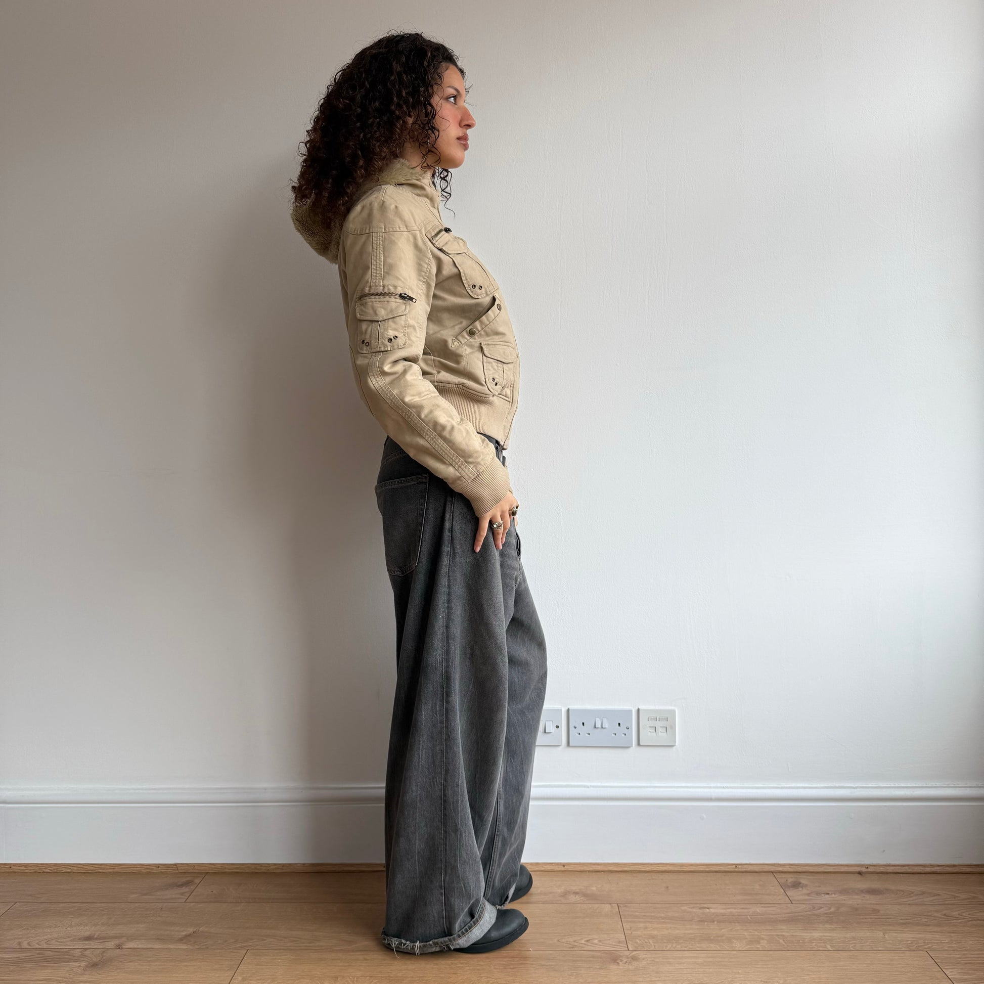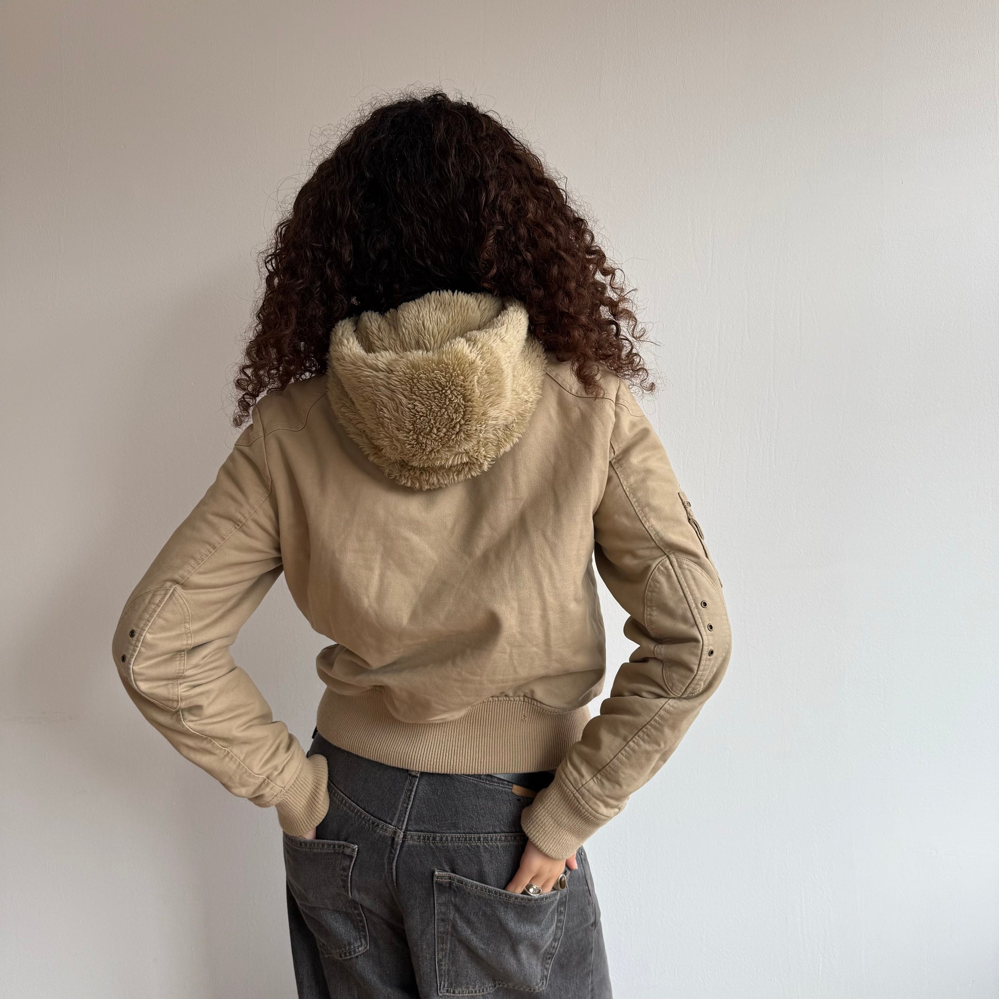 Cream/tan denim bomber jacket with warm lining and faux fur hood.