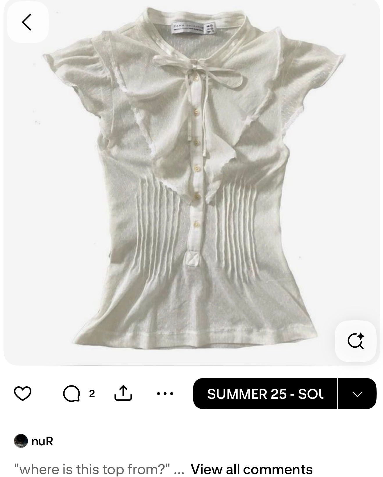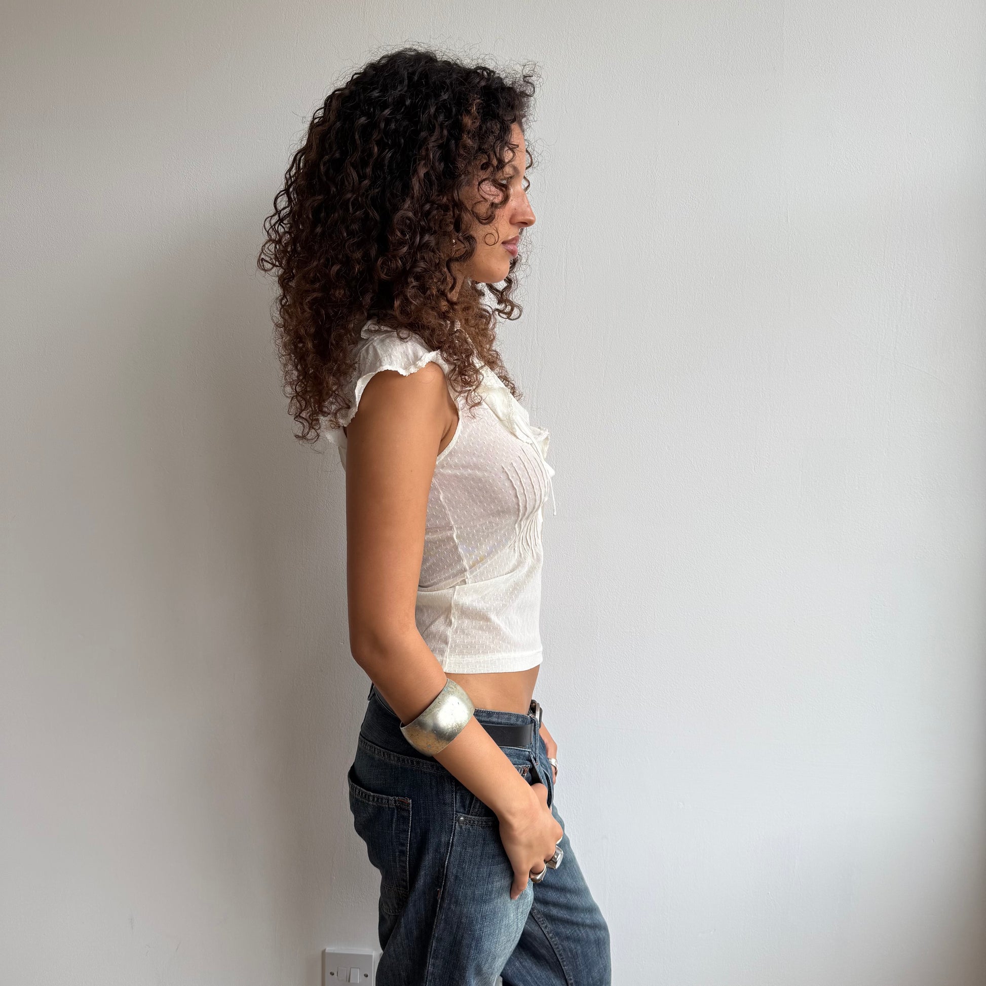 Cream polka dot mesh ruffle top with button up front and tie at the neck