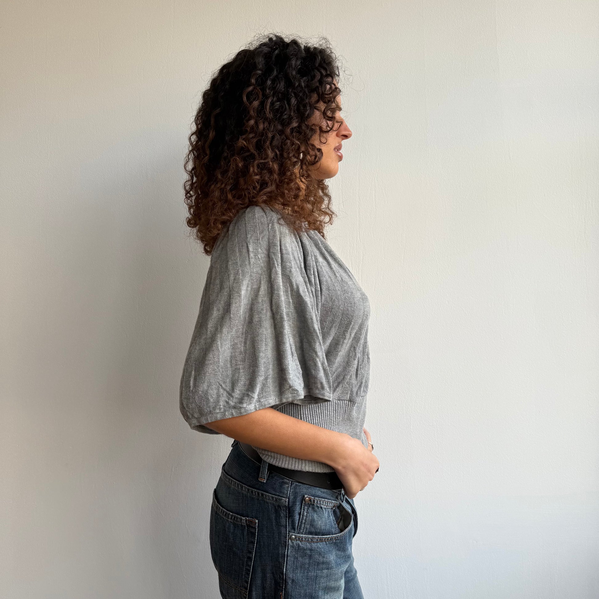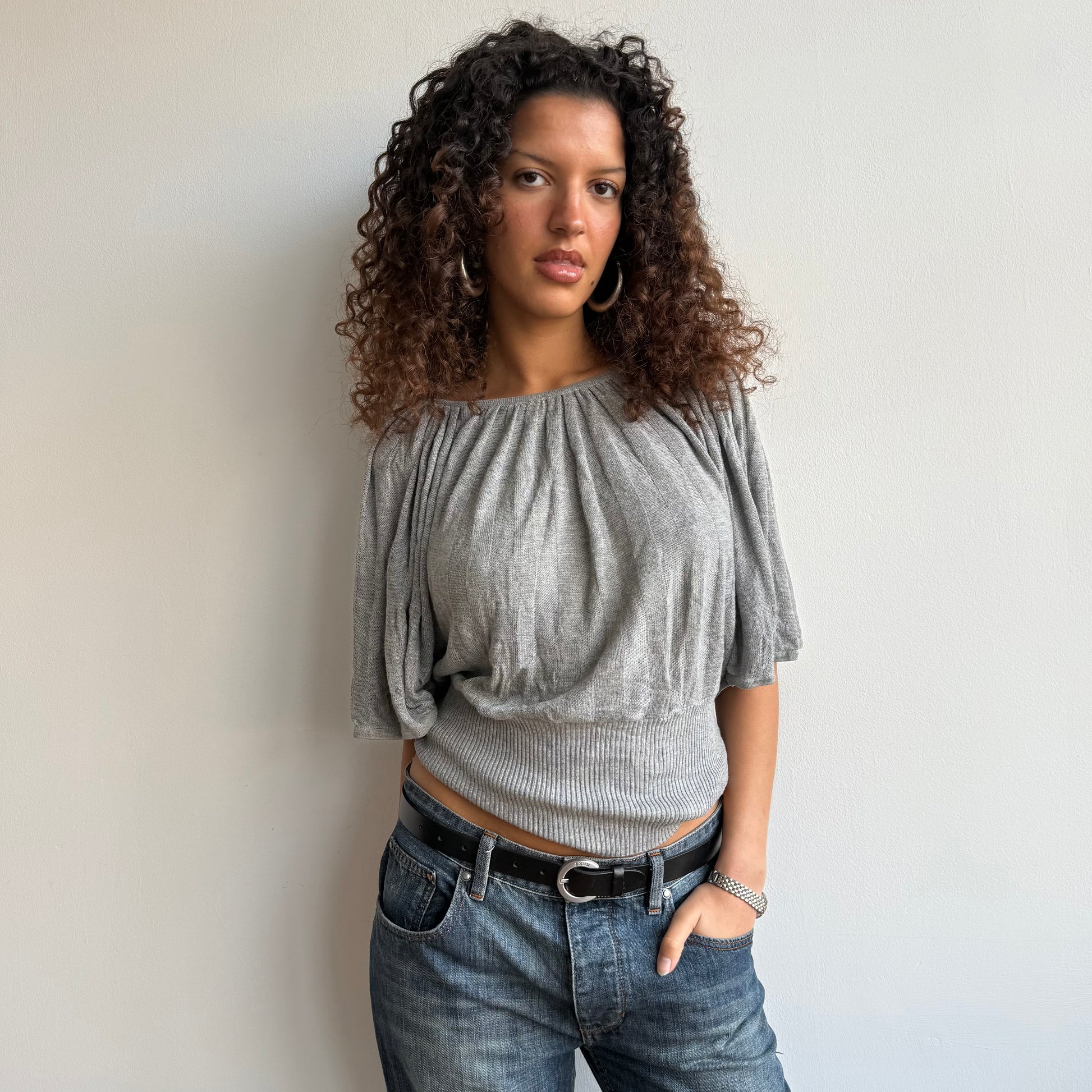 Dark grey knit with rib details and batwing sleeves + tie back detail