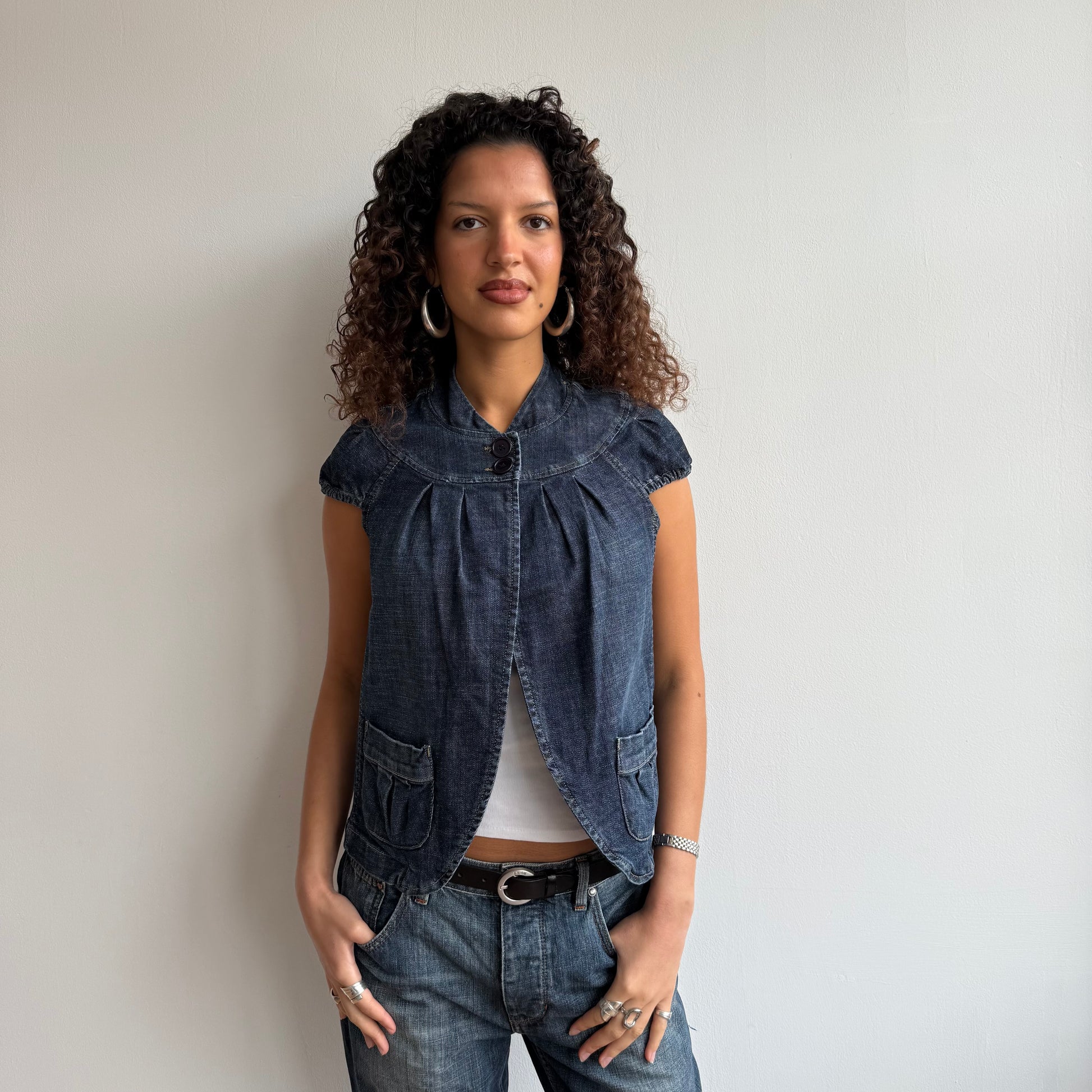 Dark wash denim feel short sleeve peacoat with buttons on the neck