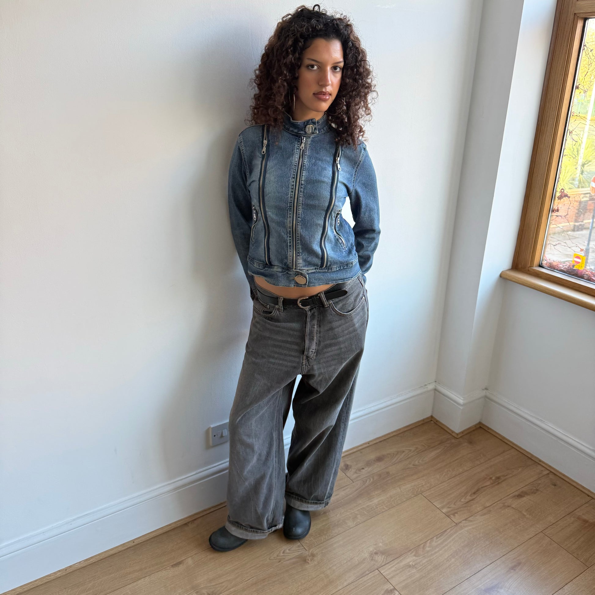 Denim moto cross jacket with multiple zips