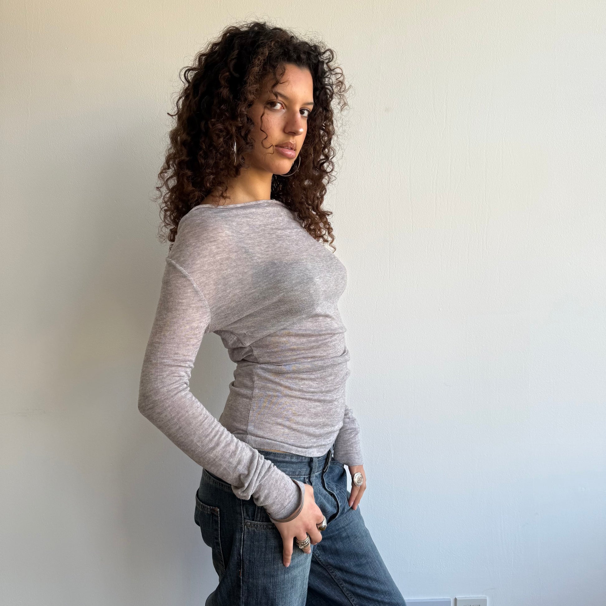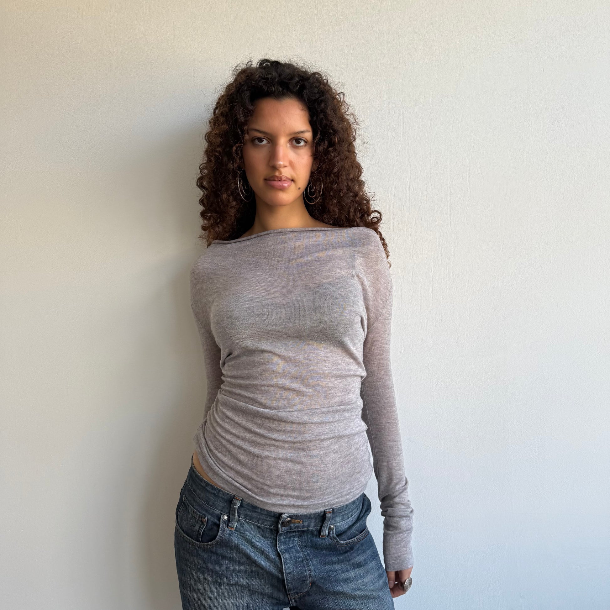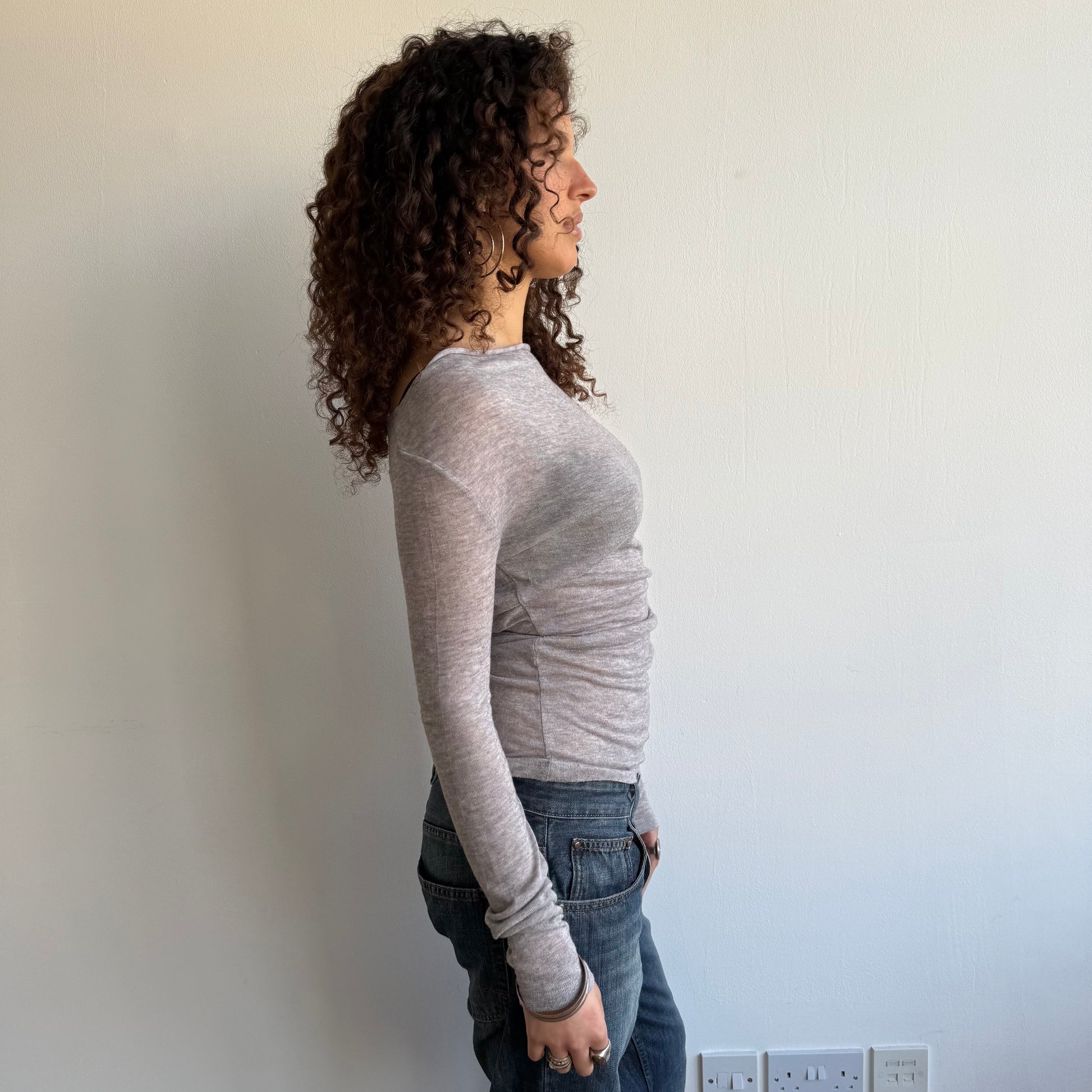 Fine knit cowl neck top with long sleeves in a light feather grey