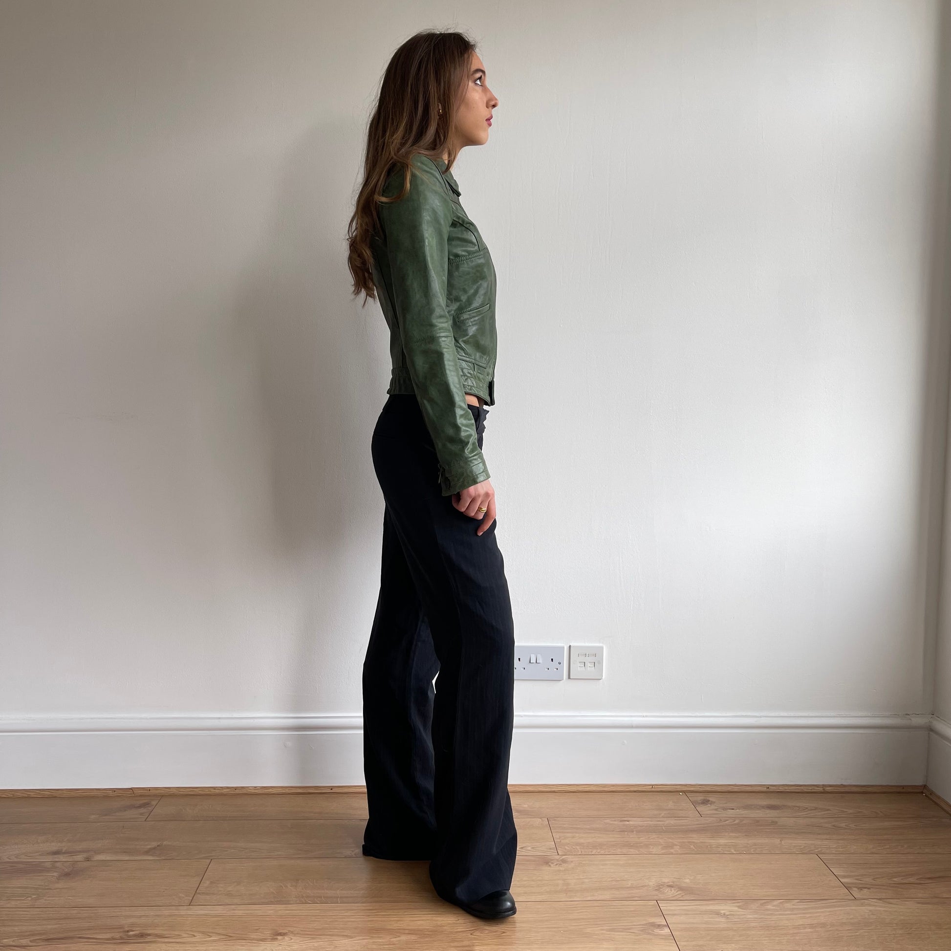 Vintage racing green leather moto cross jacket with zip up front and pockets
