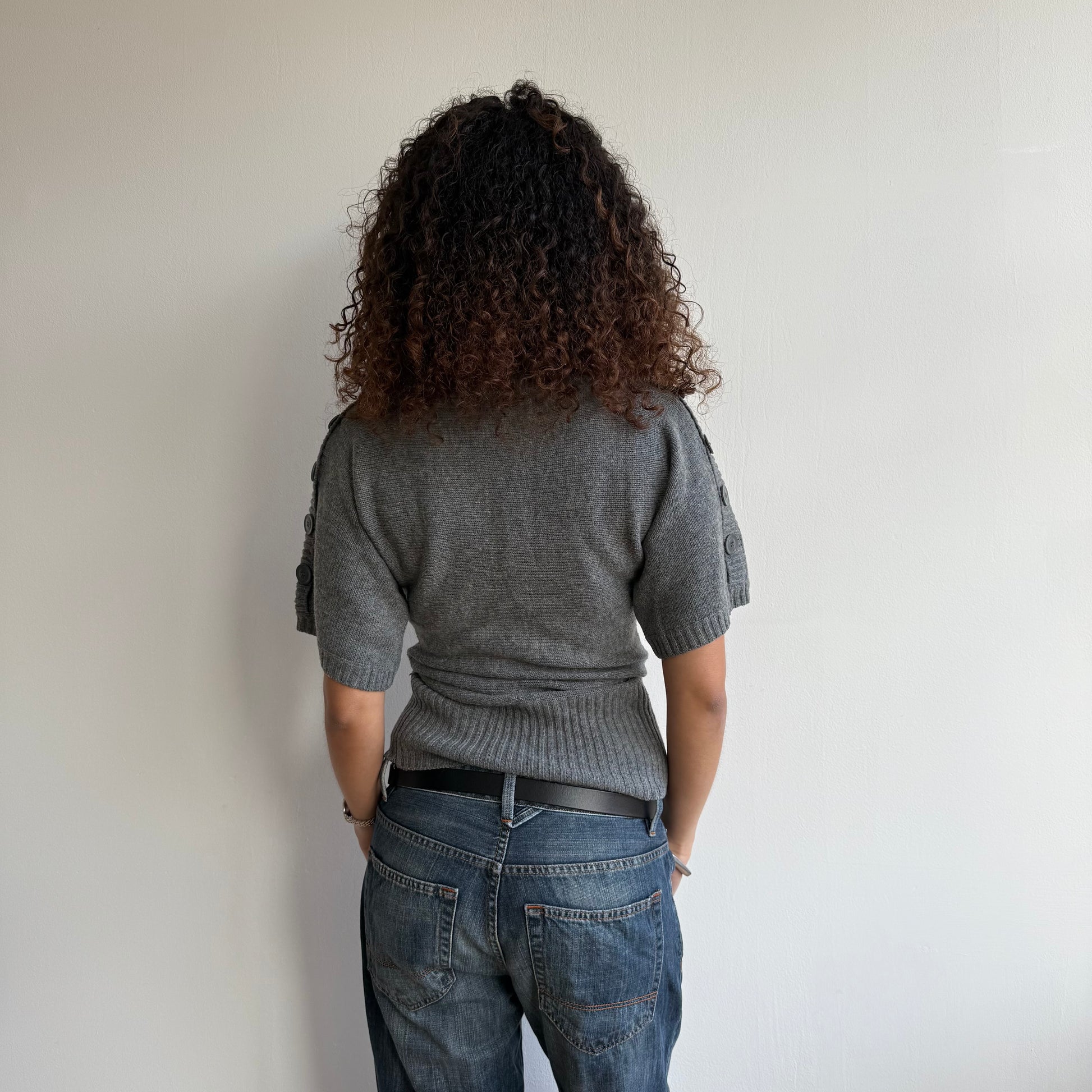 Grey short sleeve slouchy knit jumper with buttons on the shoulders