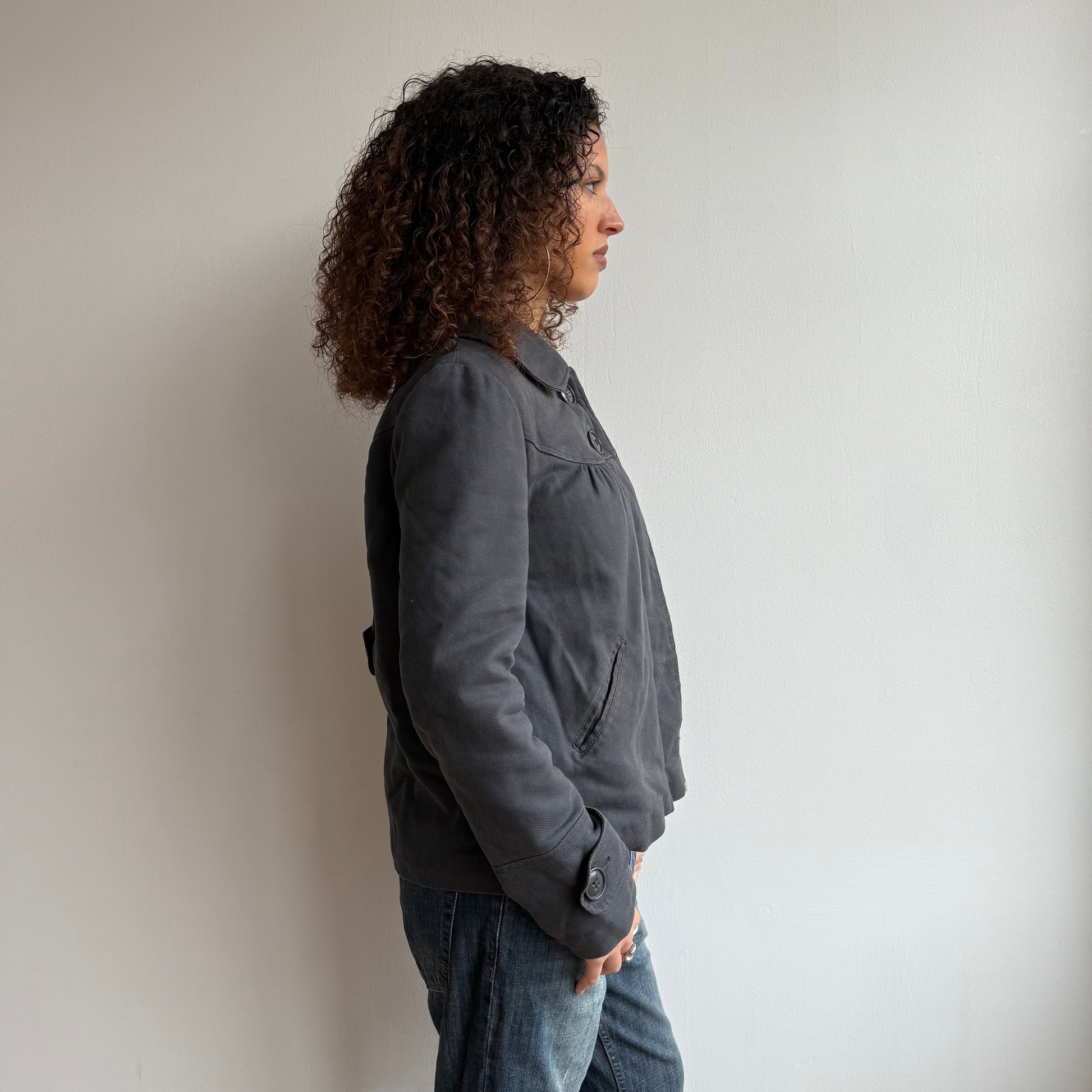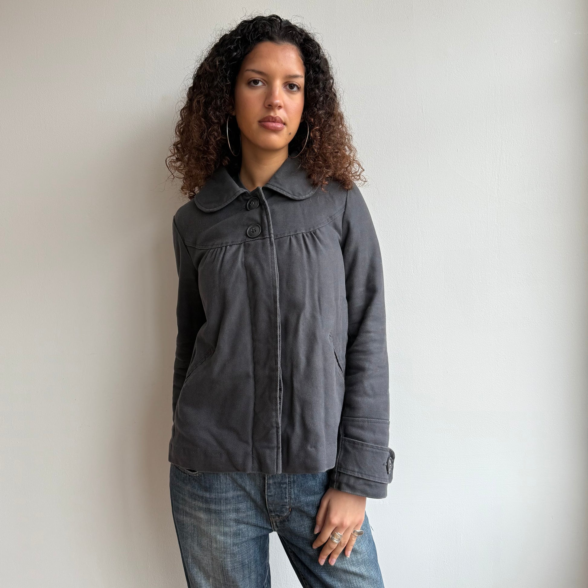 Grey padded peacoat swing coat with hidden buttons and detachable hood (not worn!)