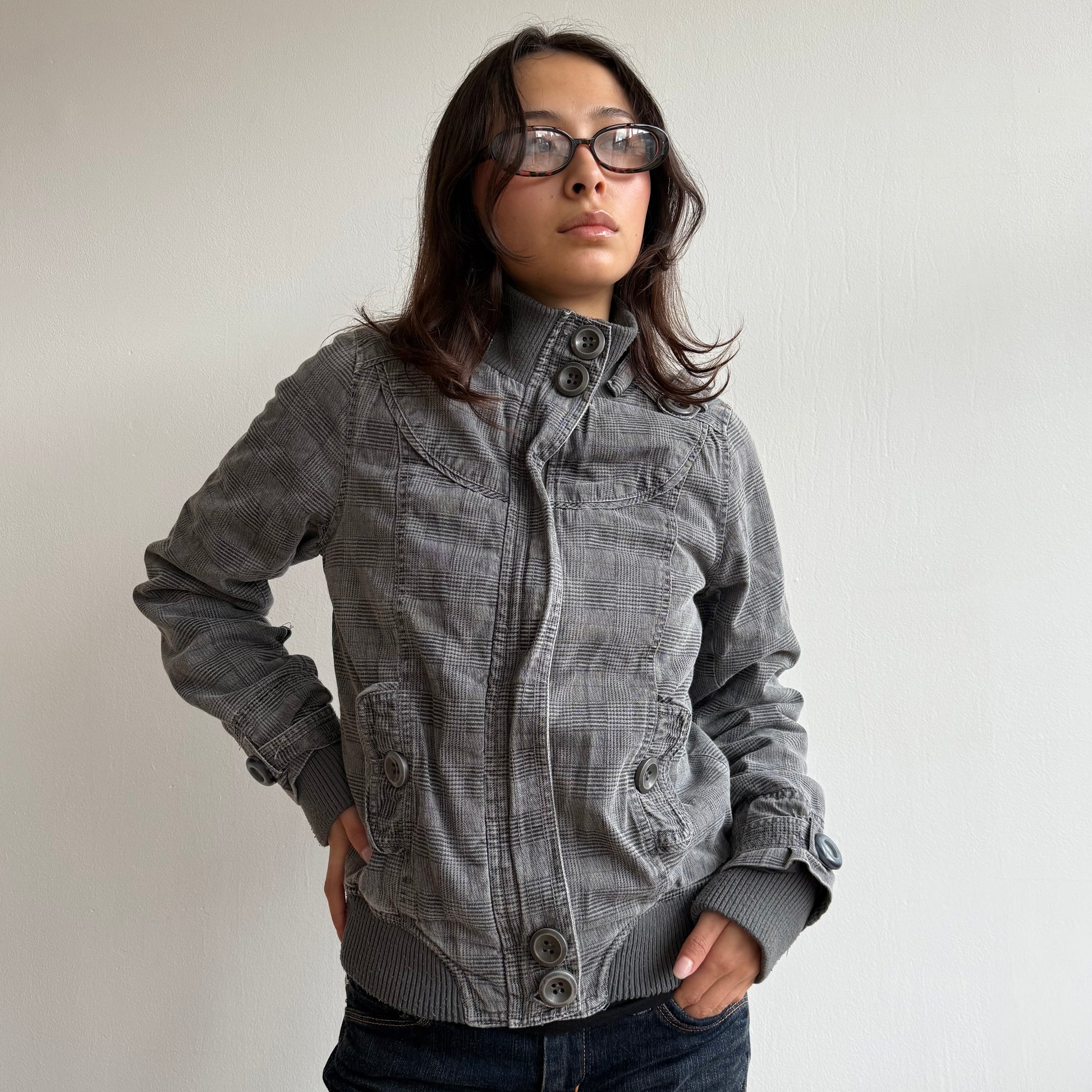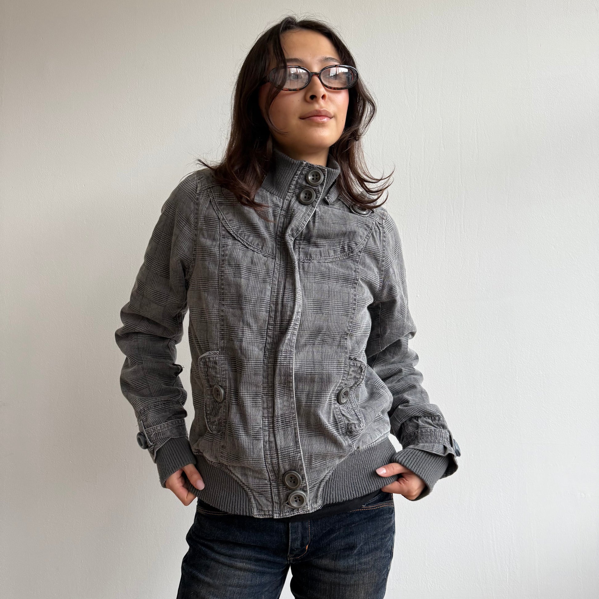 Grey plaid bomber jacket zip up front with buttons