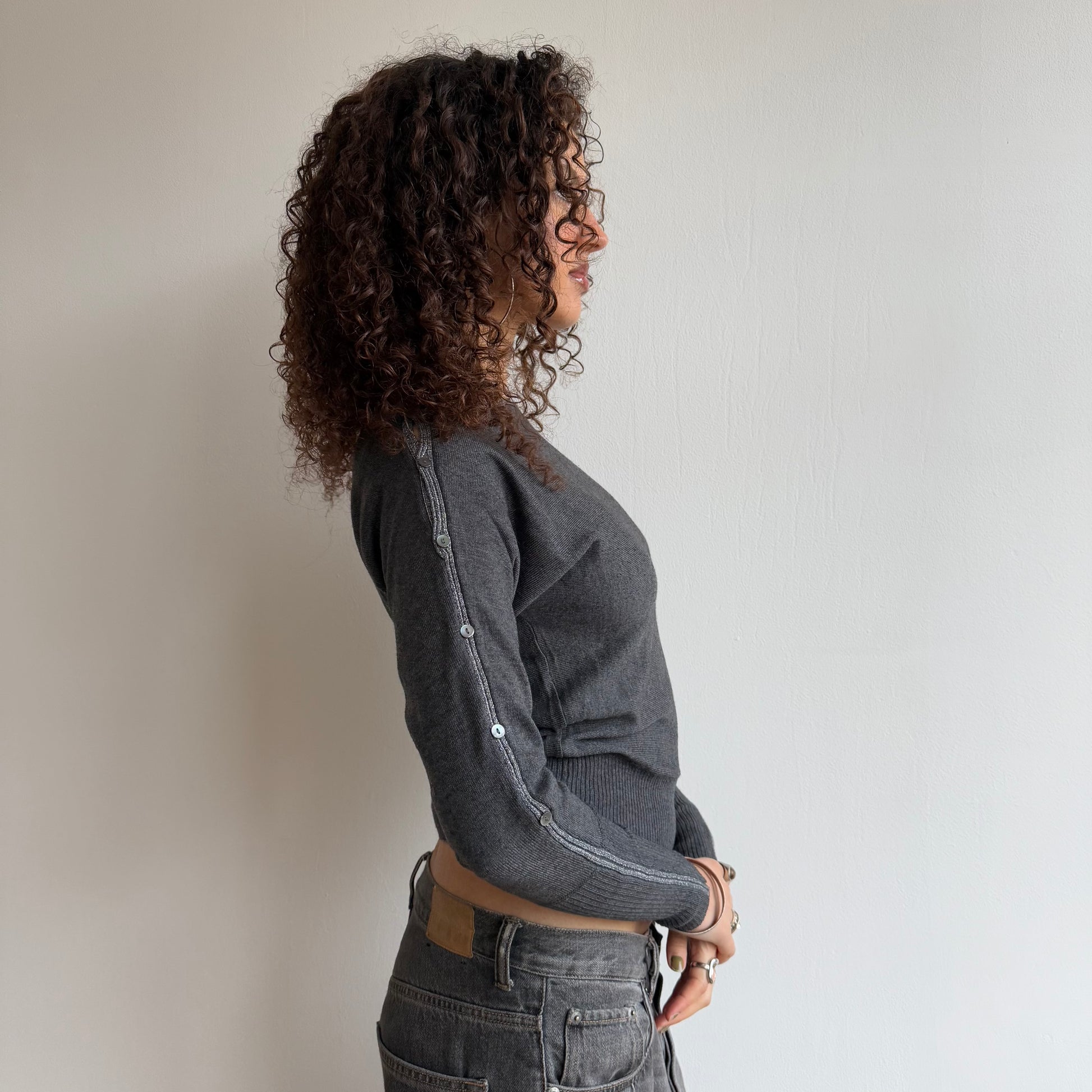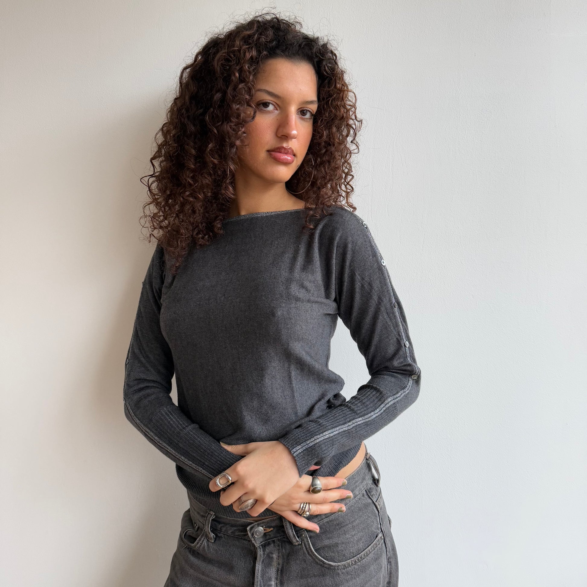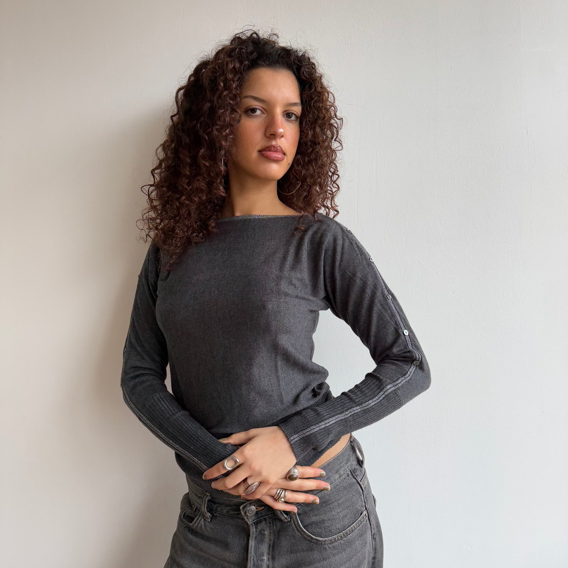 Grey knit wide neck knit with button long sleeves