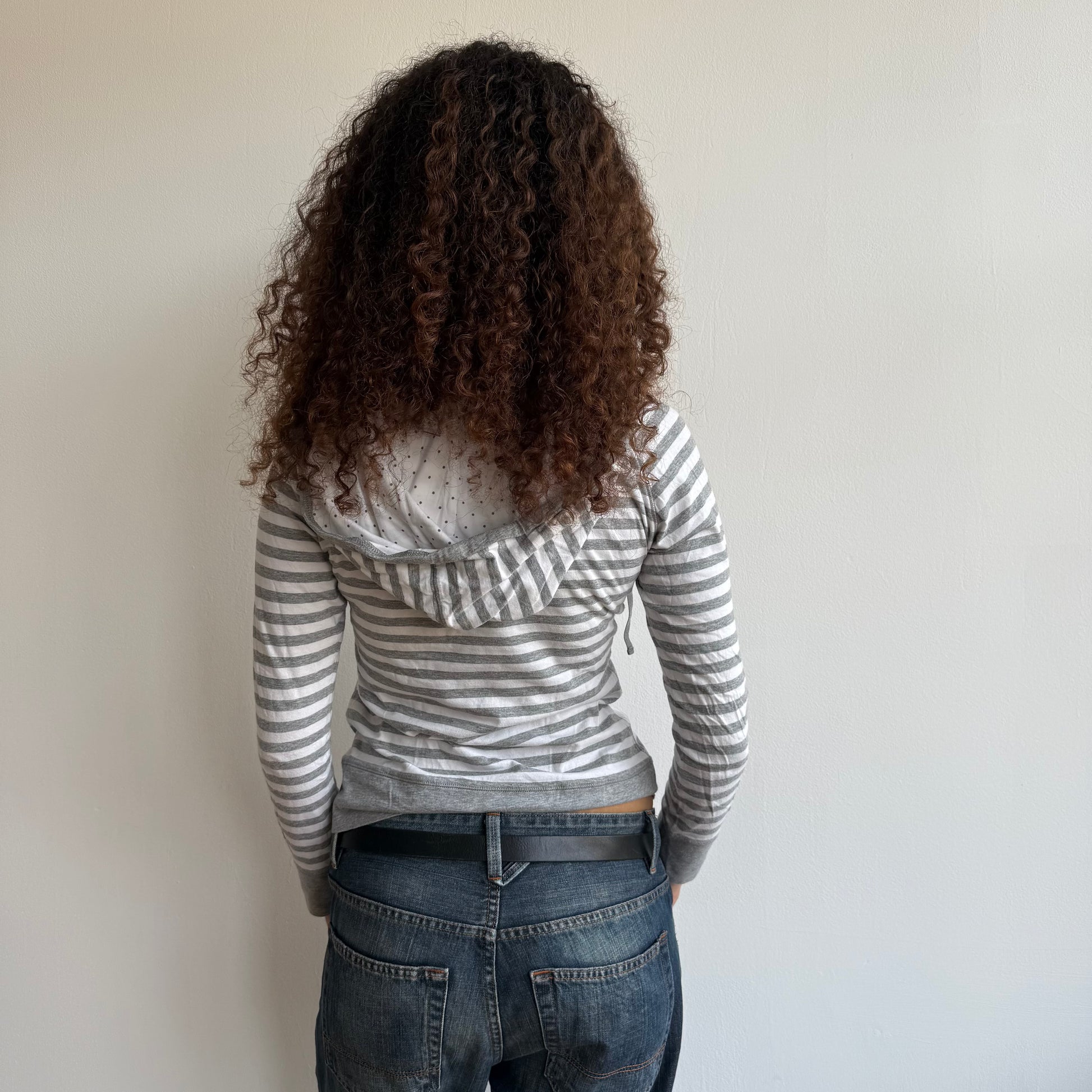 Grey and white striped hooded top (inside of the hood is white polka dot)