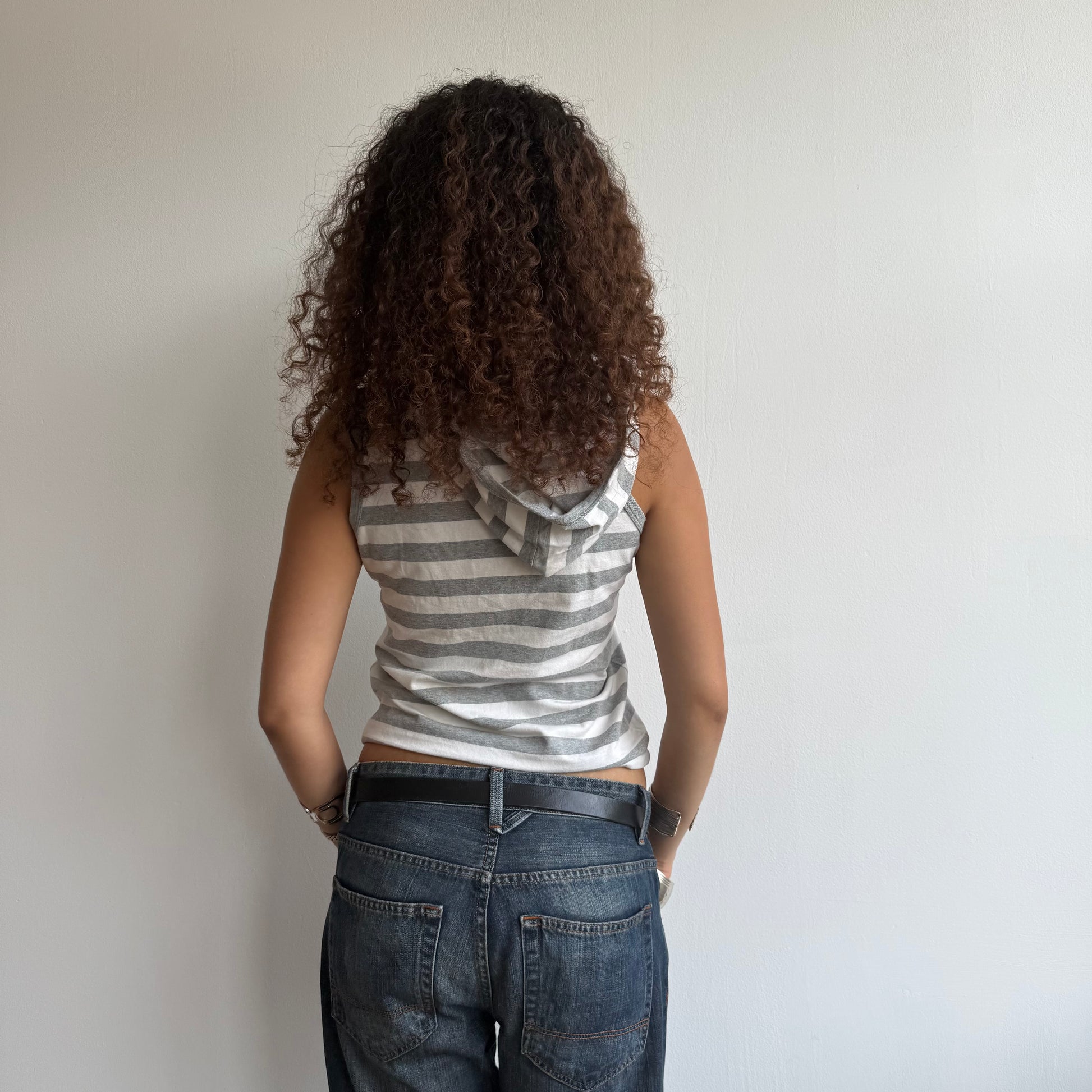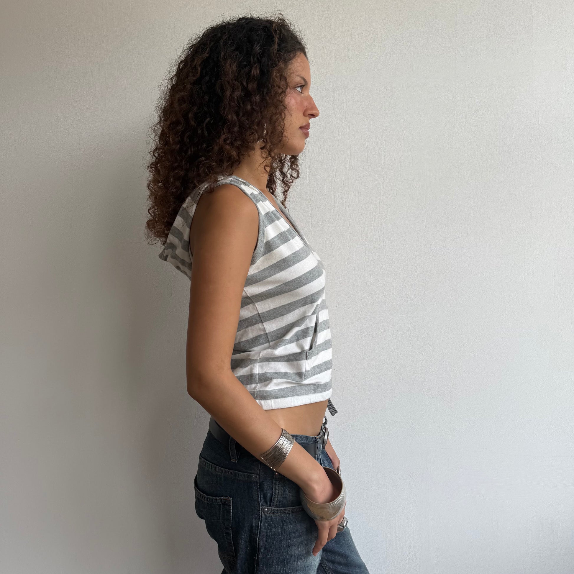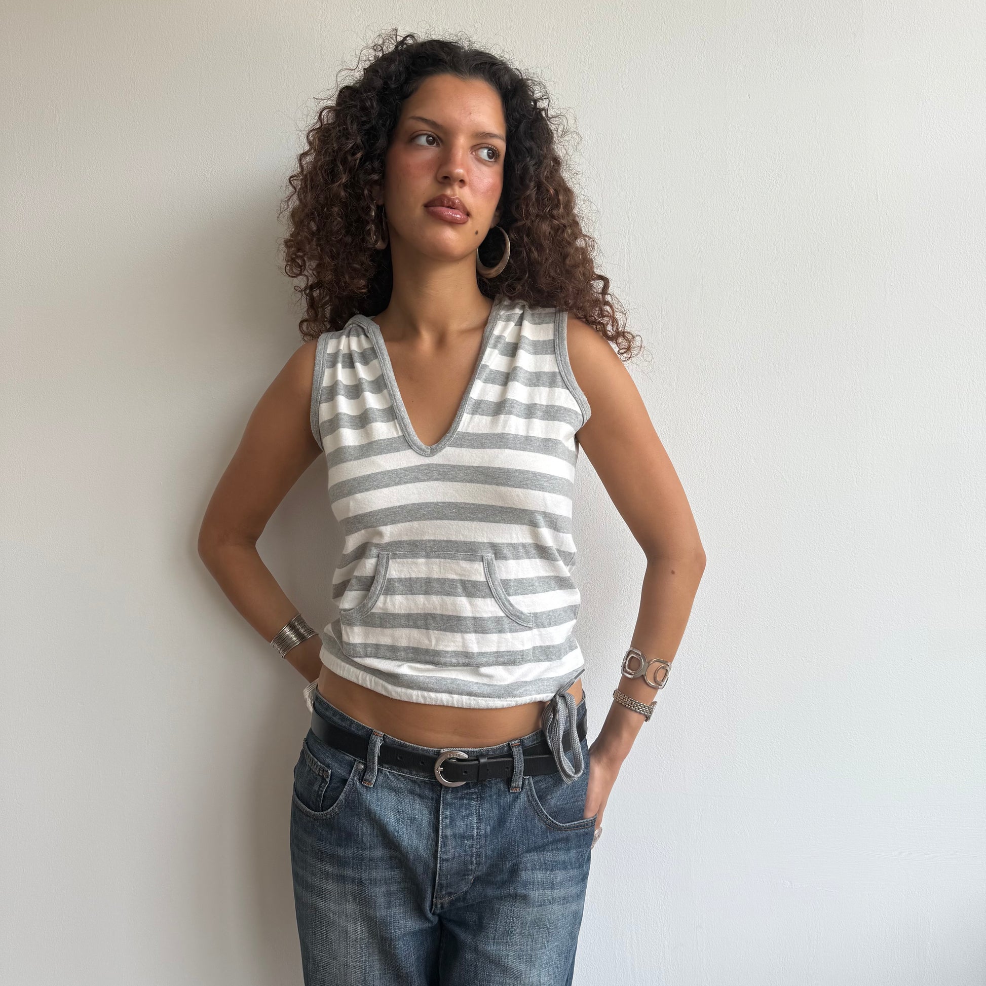 Grey and white striped sleeveless hooded top with front pocket and adjustable tie at the waist
