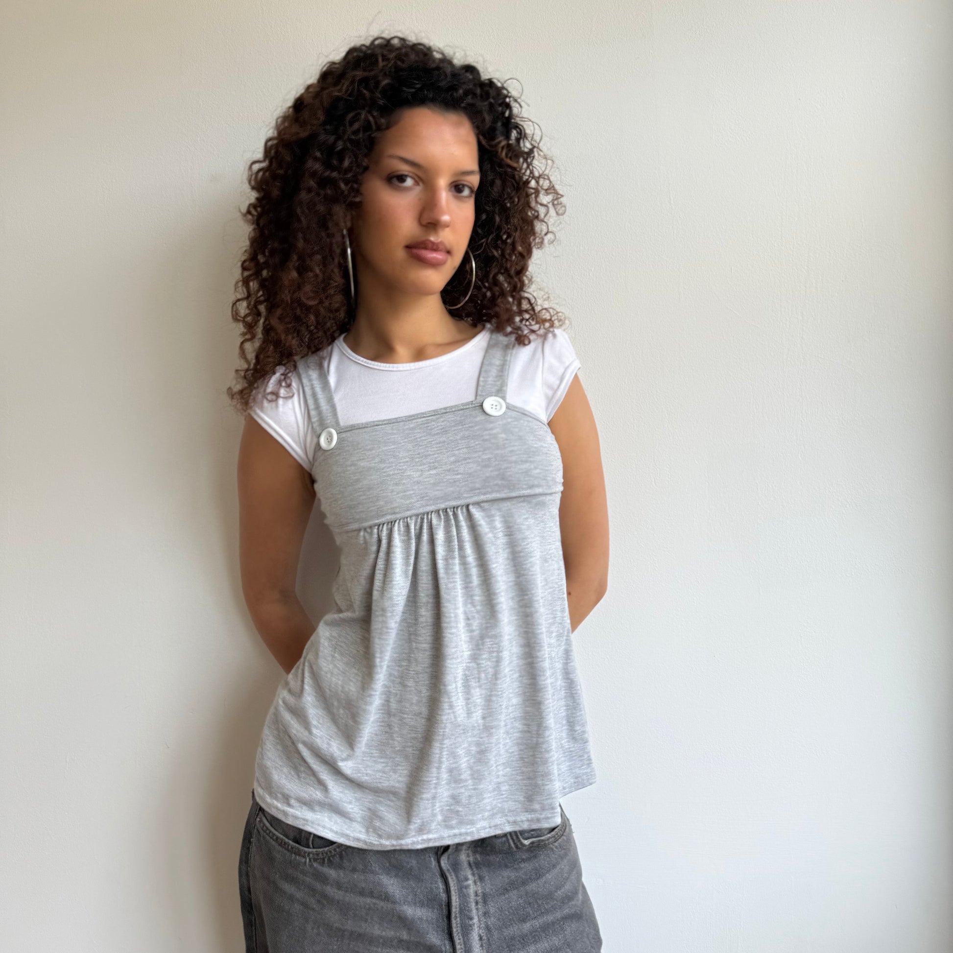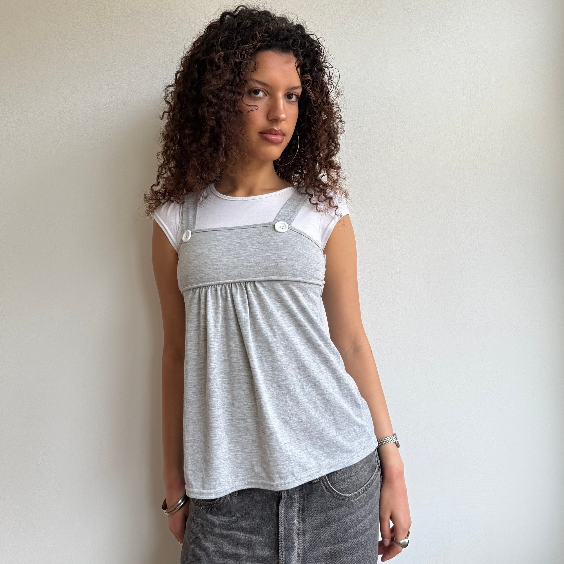 Grey + white double layer dungaree top with tie round the back. The tie has some stitching coming loose, as seen in the photos - can be sewn easily