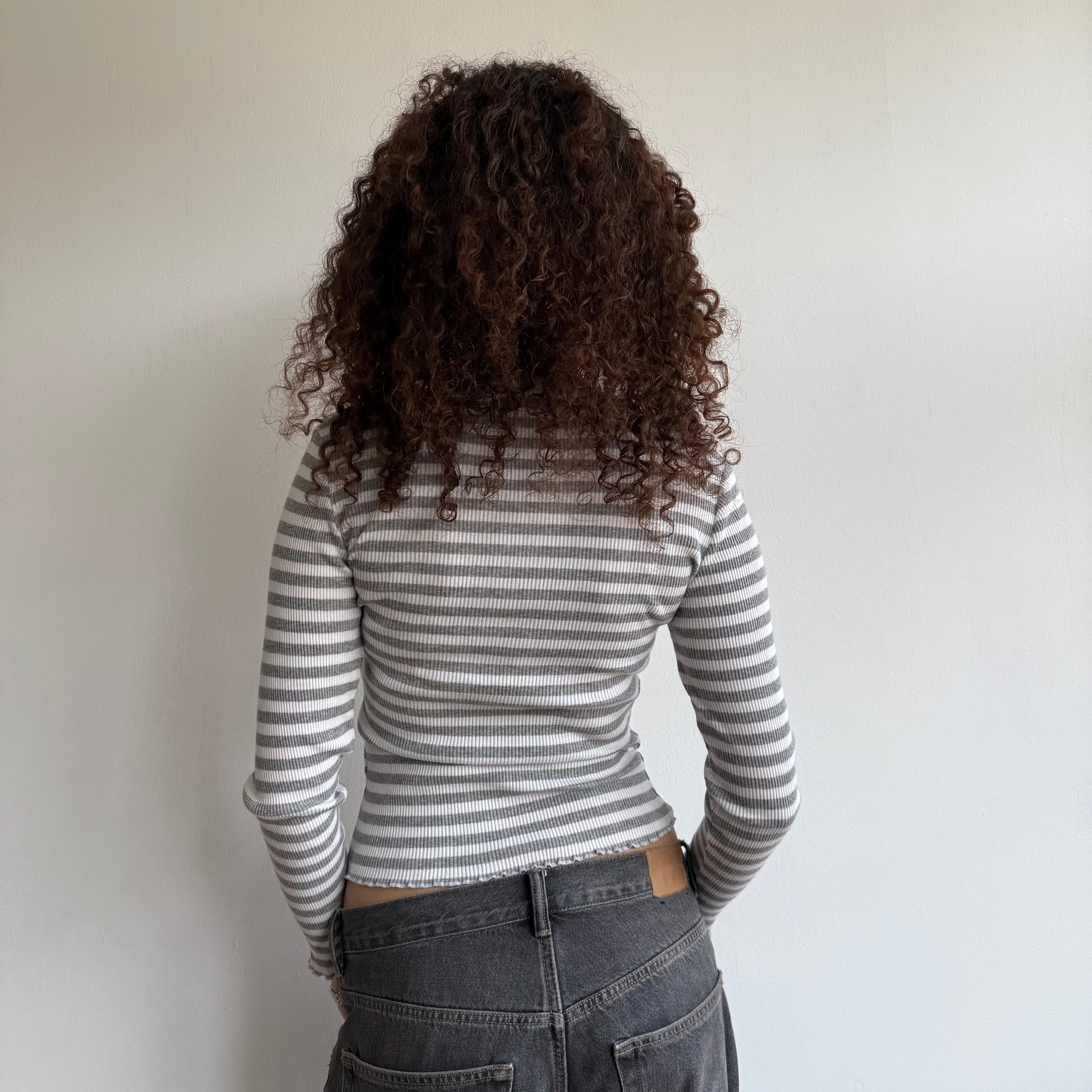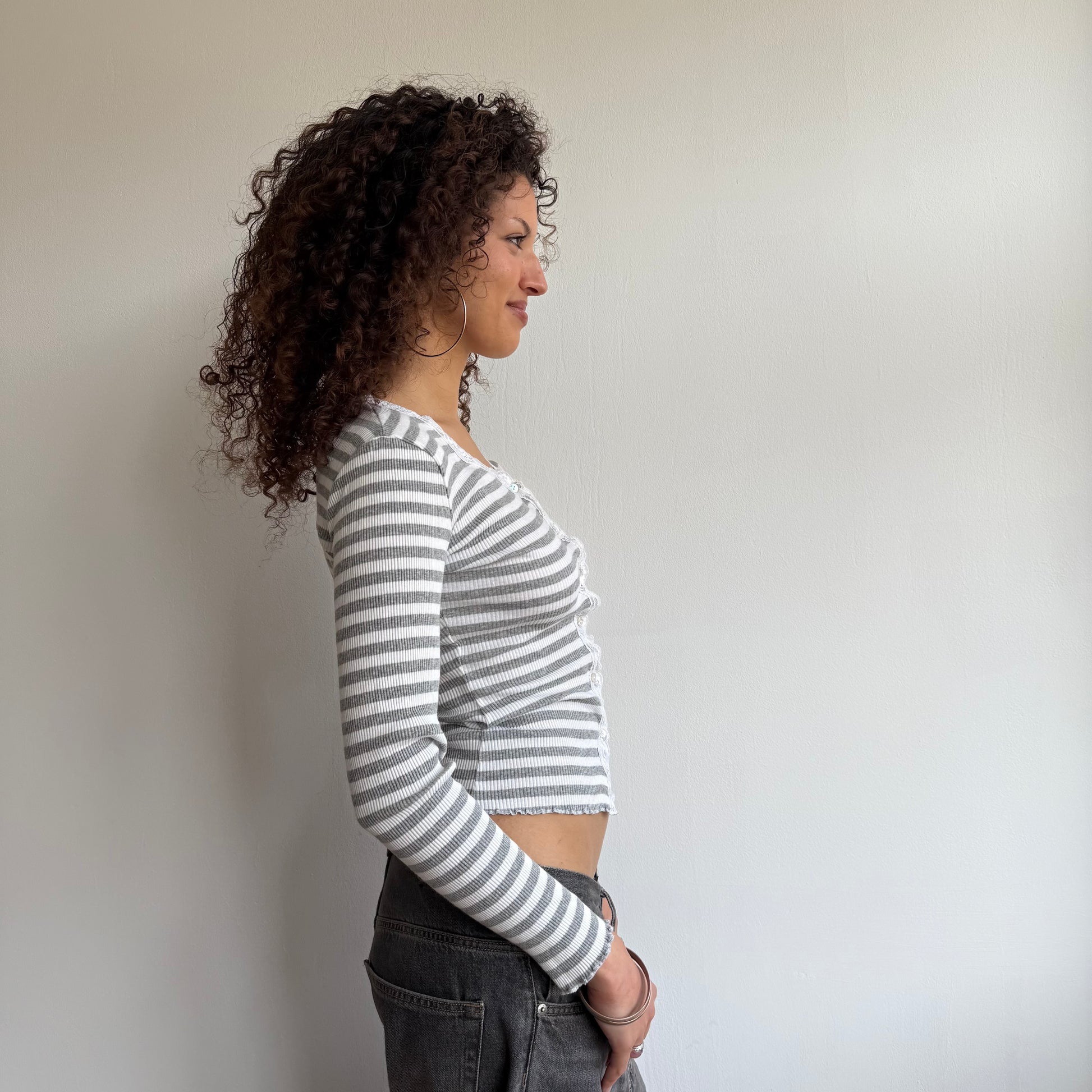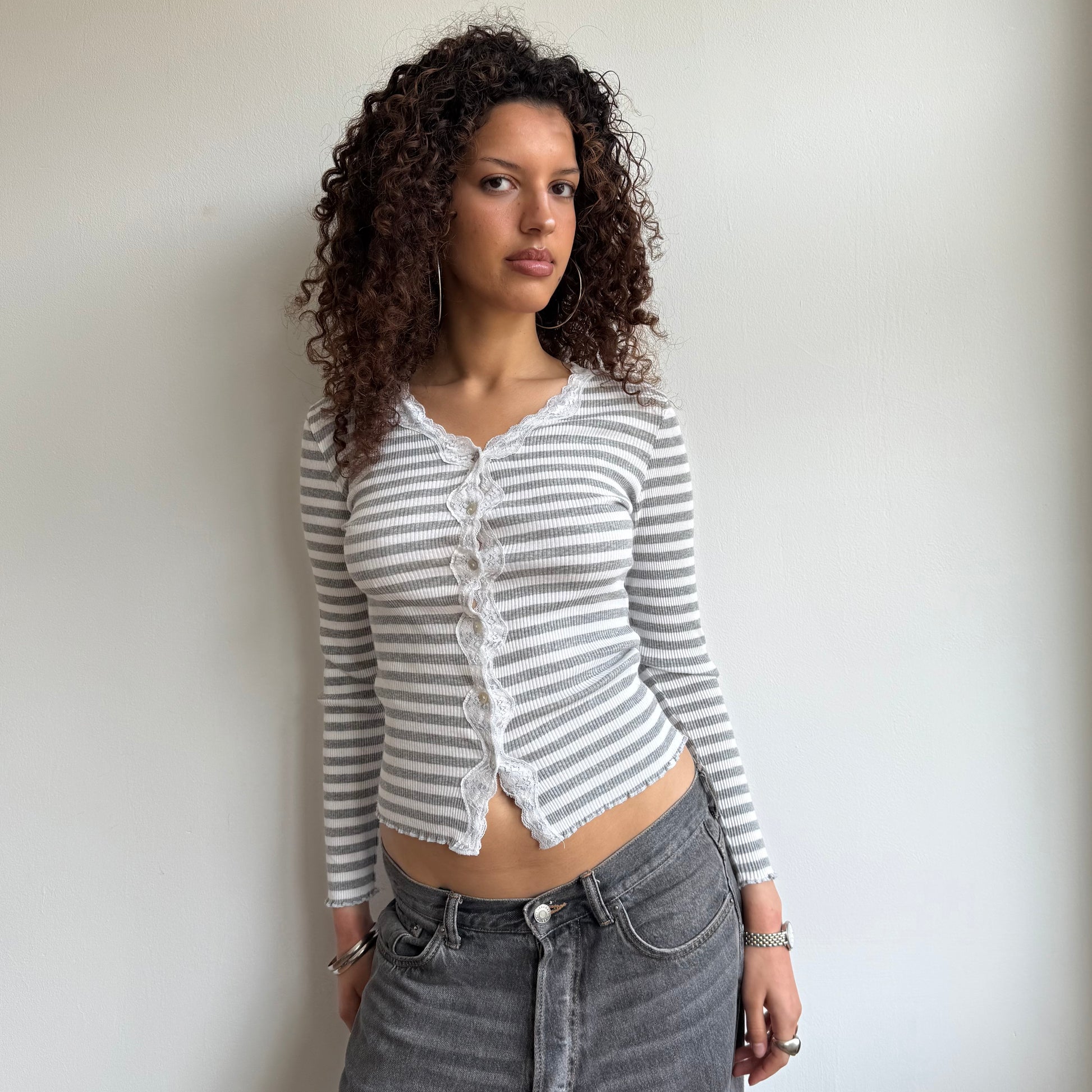 Grey + white striped cardigan with lace trim and mother of pearl buttons