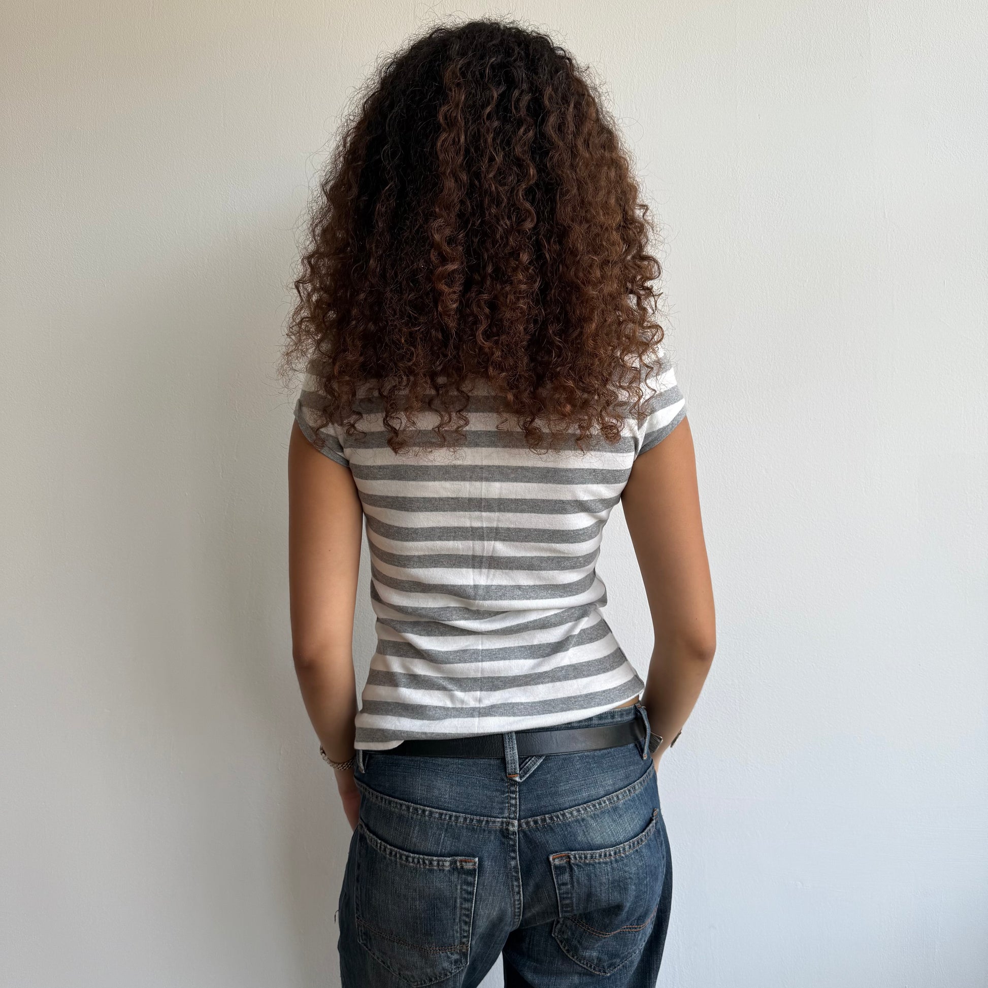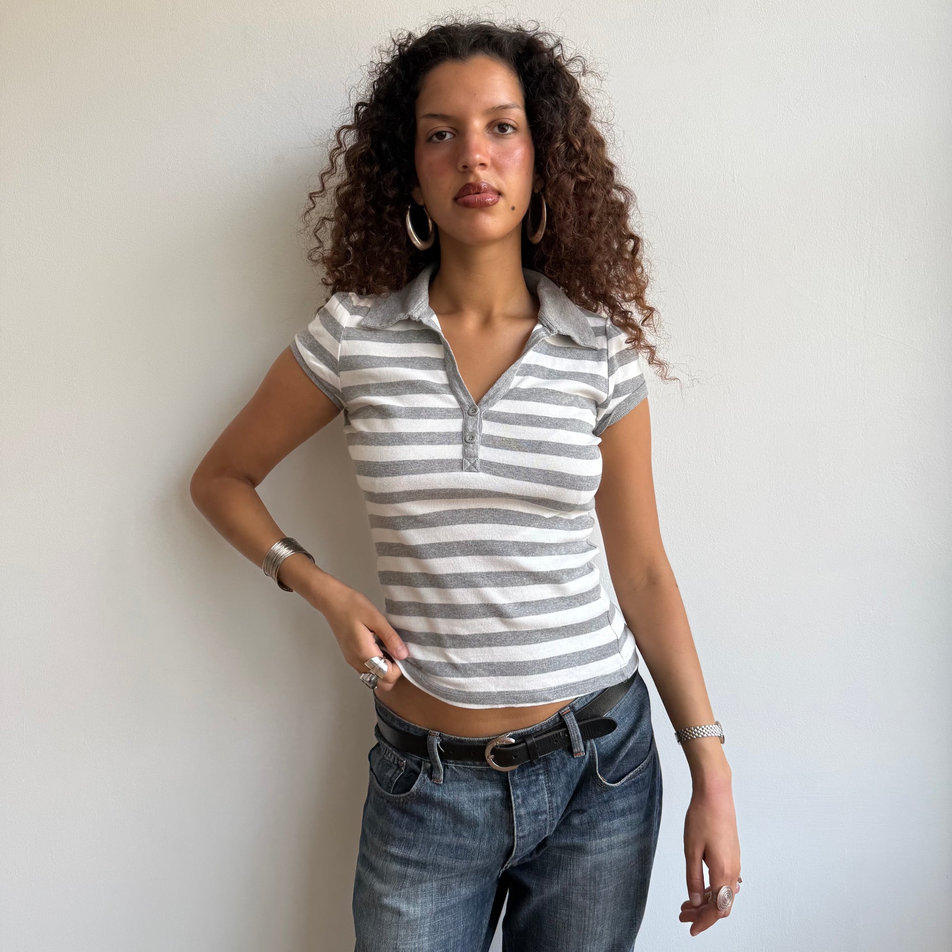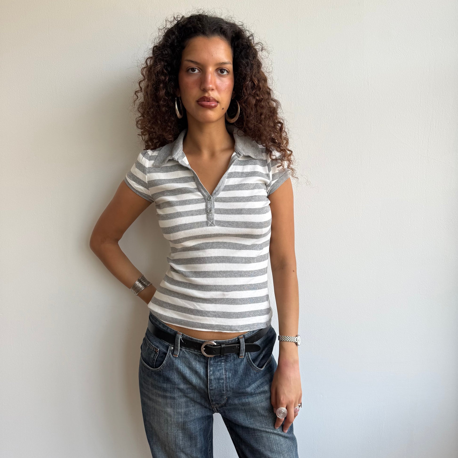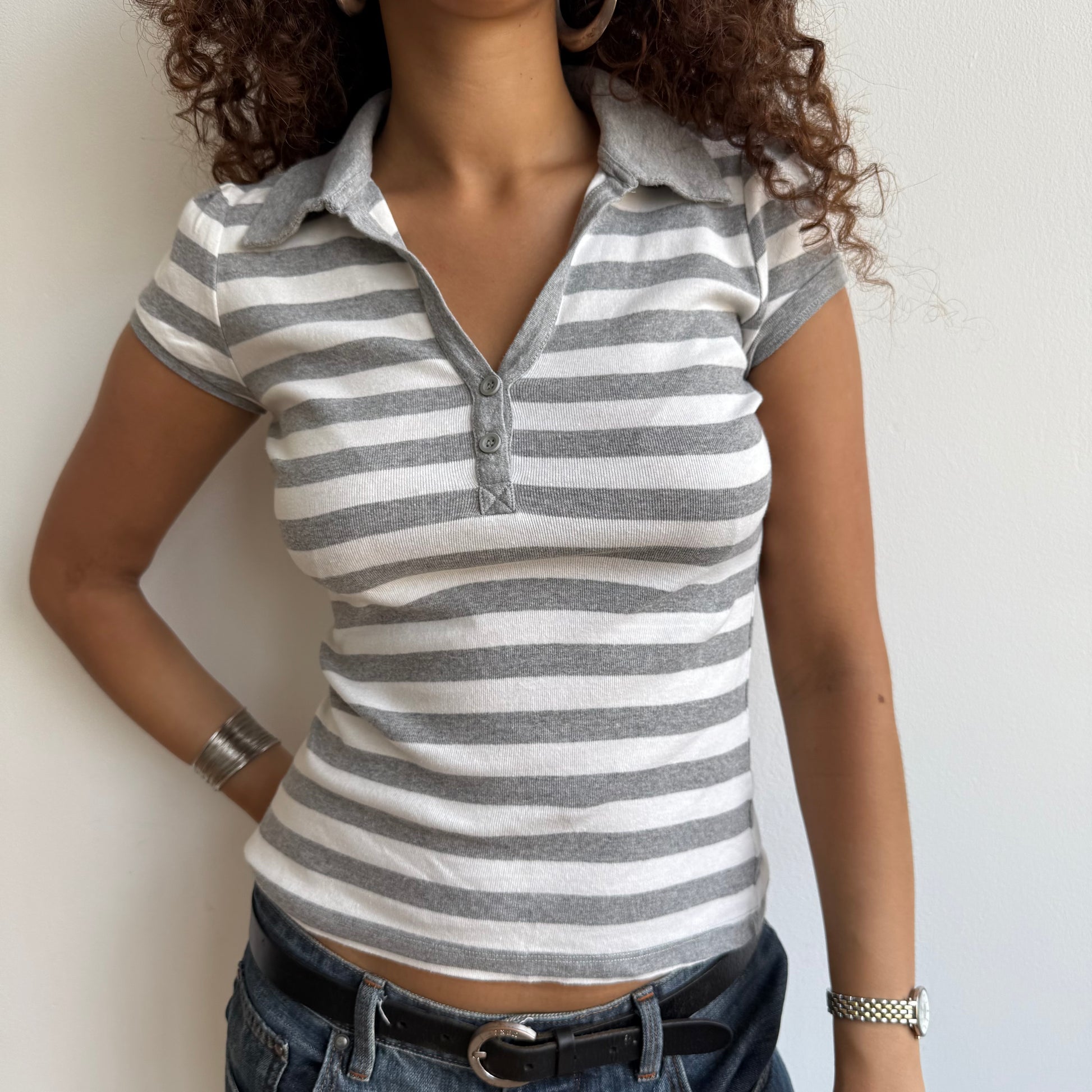 Grey + white striped polo - Size S/M