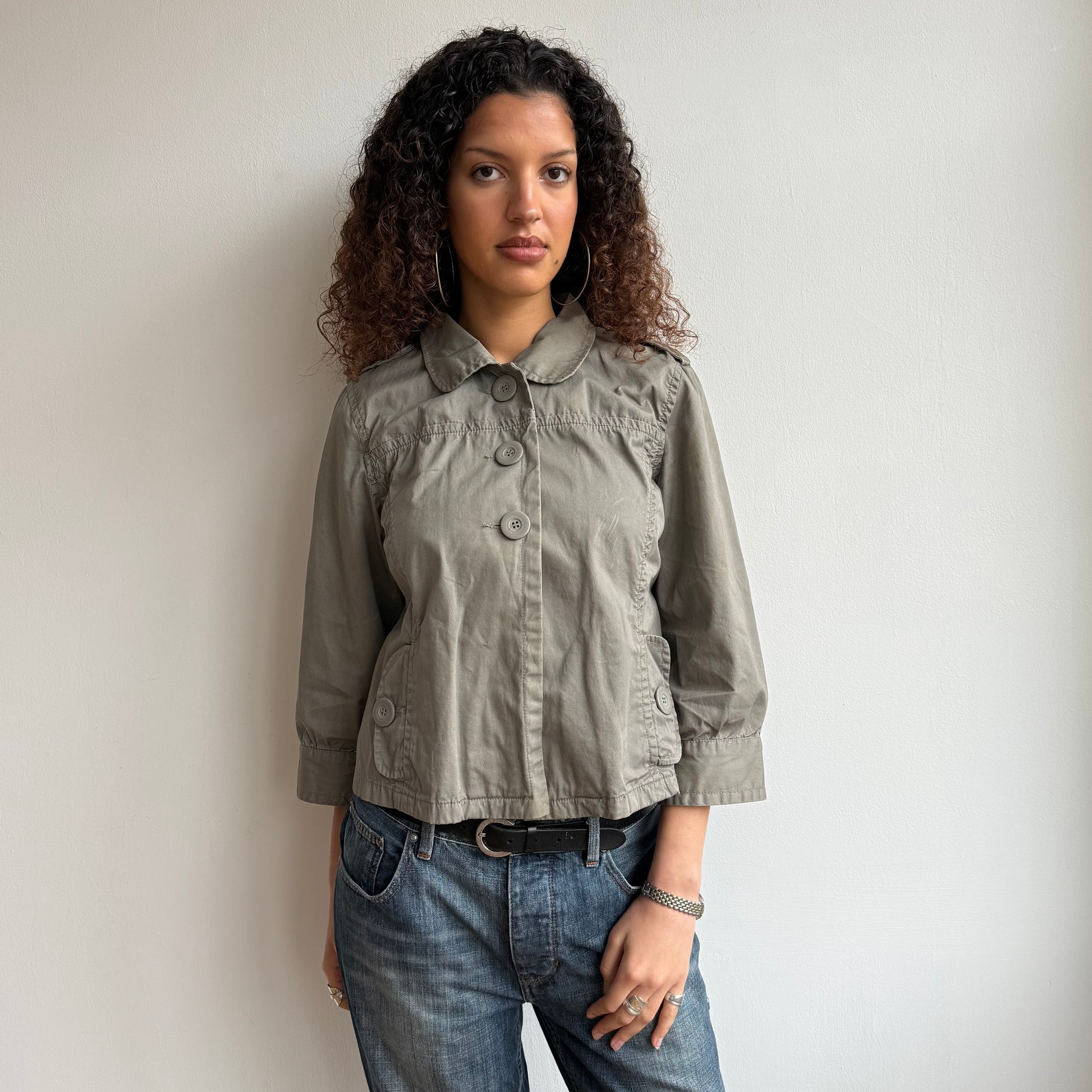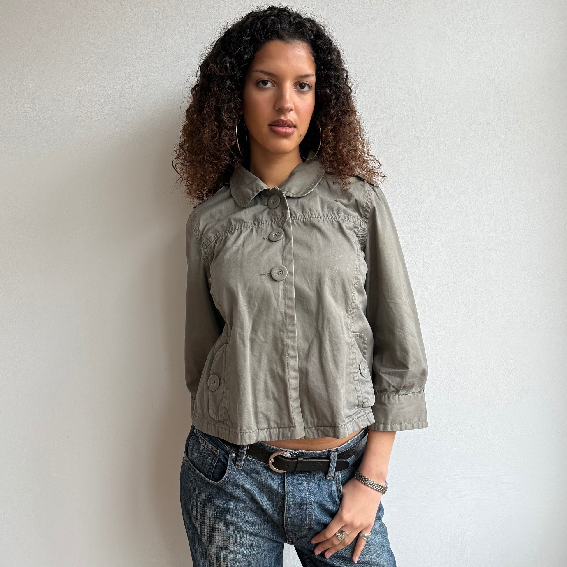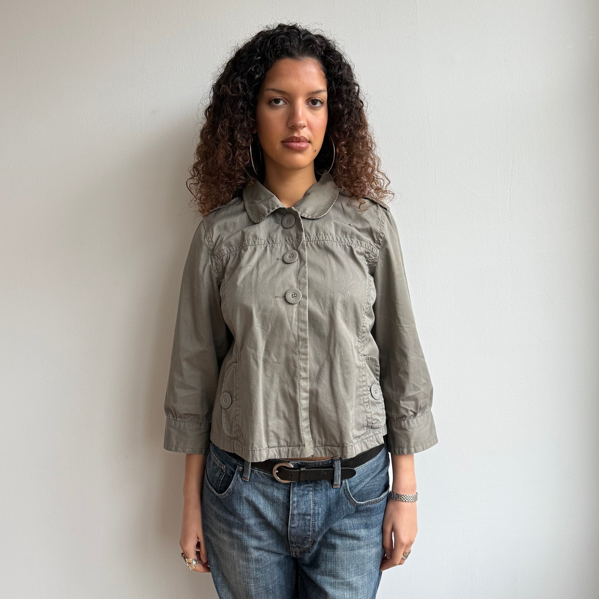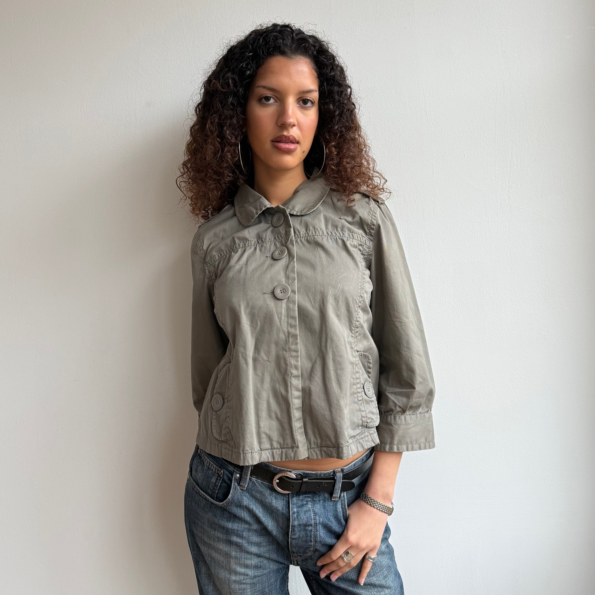 Khaki/grey 3/4 sleeve peacoat with 3 buttons on the front