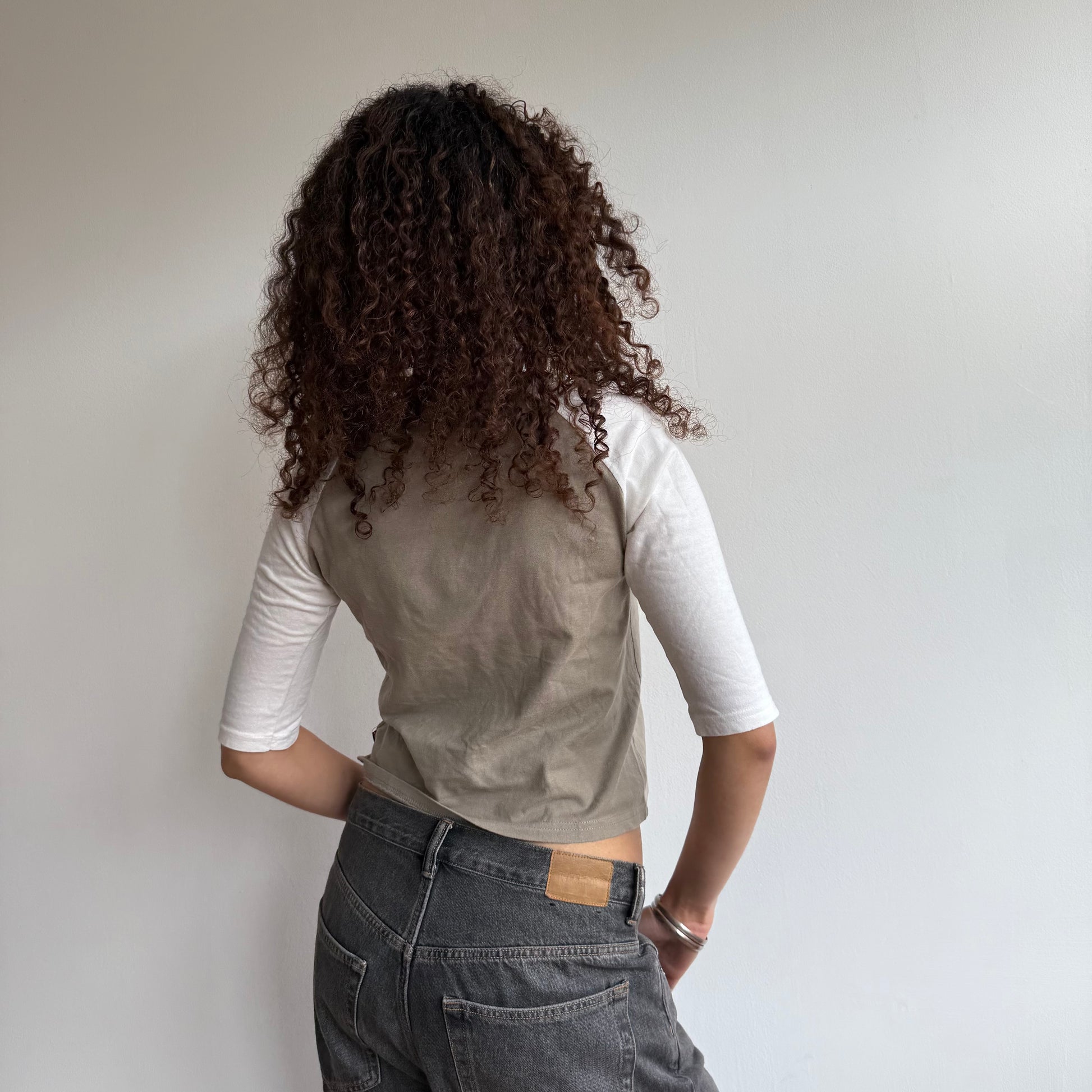 khaki and white 3/4 length sleeve sporty style top with 8 on the front