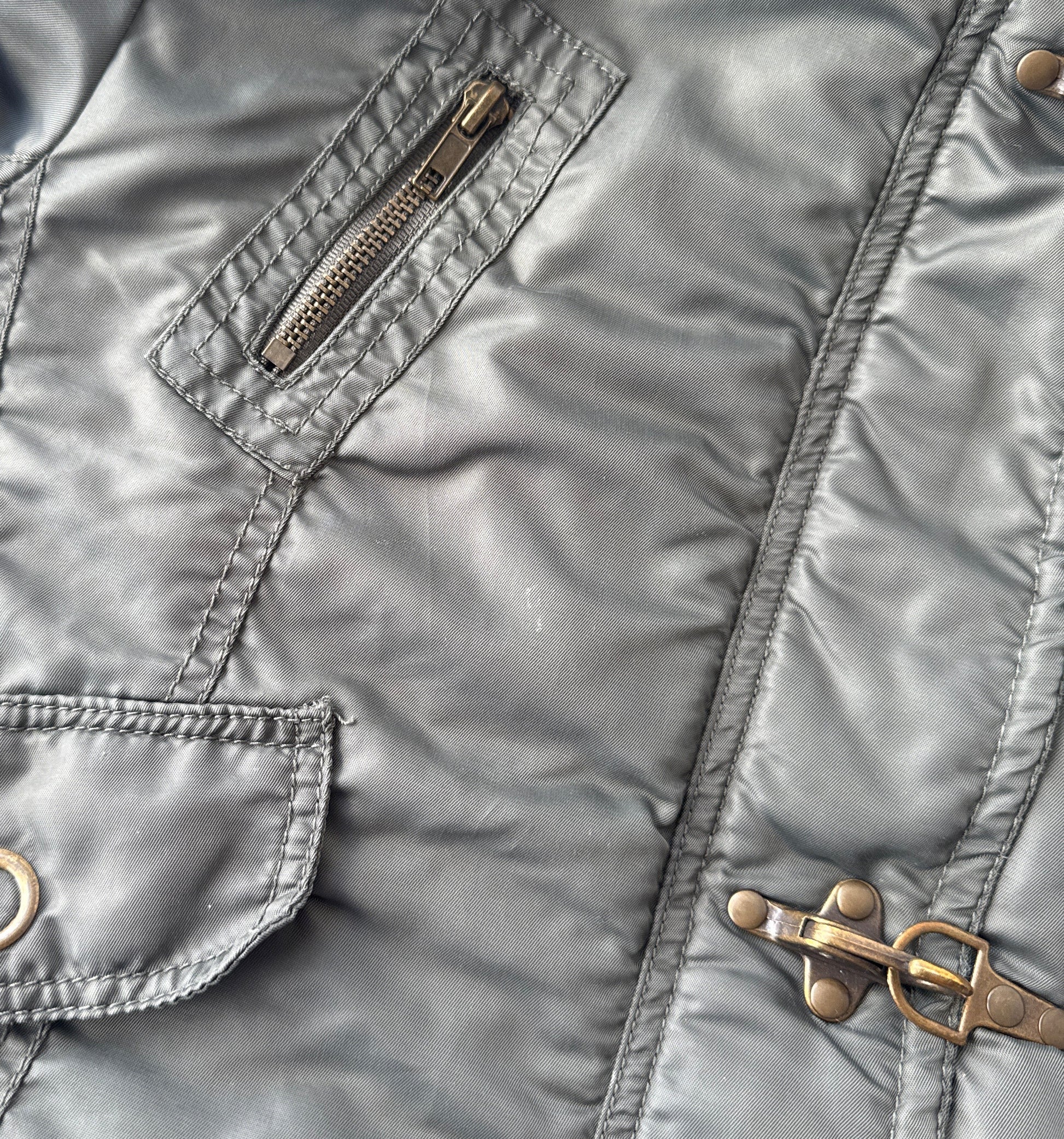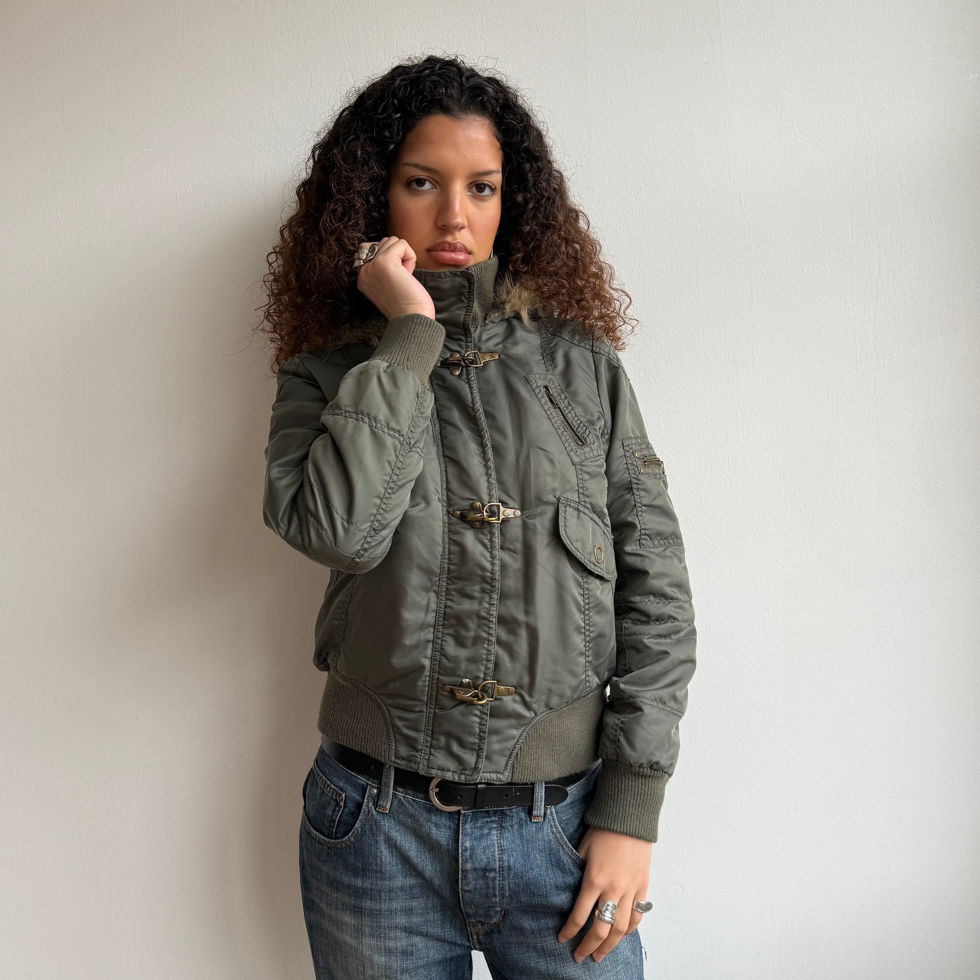 khaki padded warm bomber jacket with fur hood and lobster clasp details