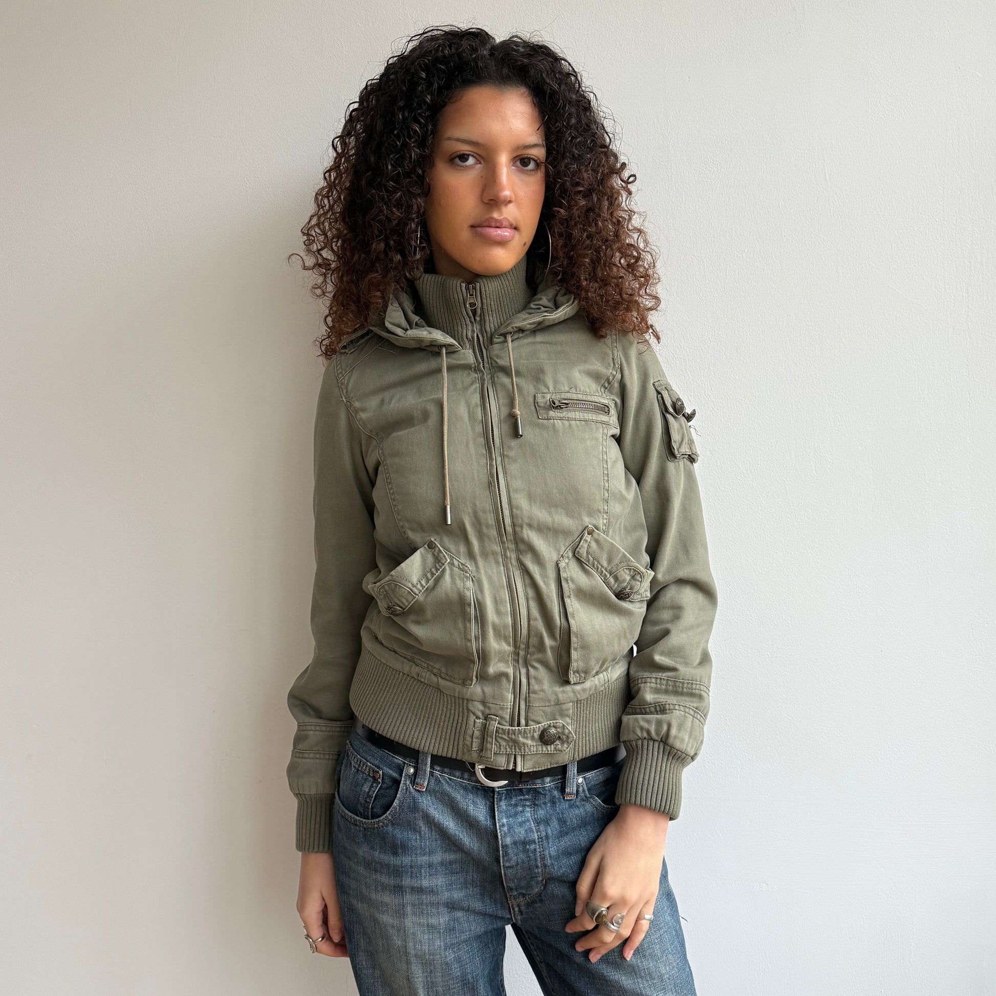 Khaki padded bomber with zip up ribbed neck and concealed hood