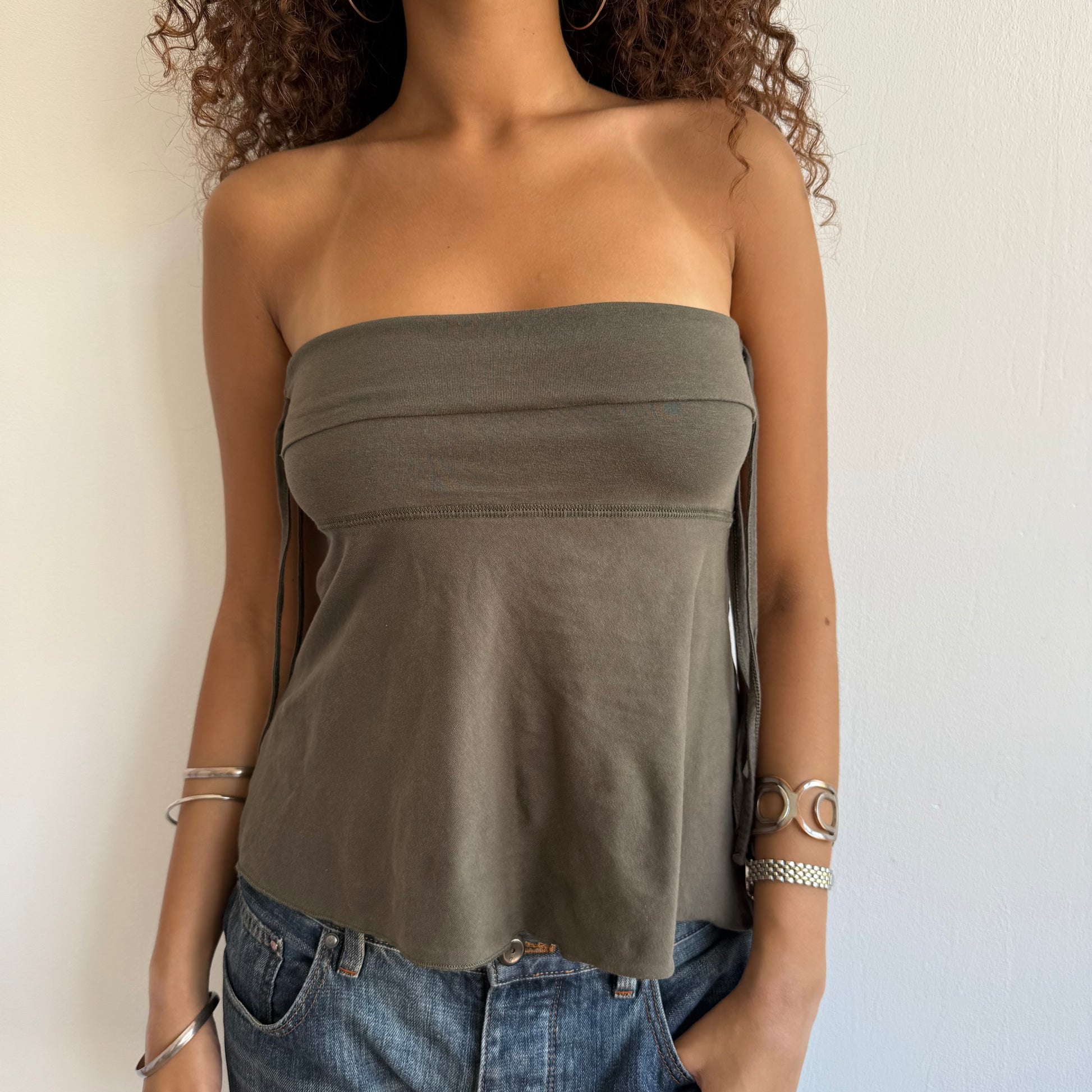 Khaki bandeau top with adjustable ruched sides and floaty body, could also be worn as a skirt