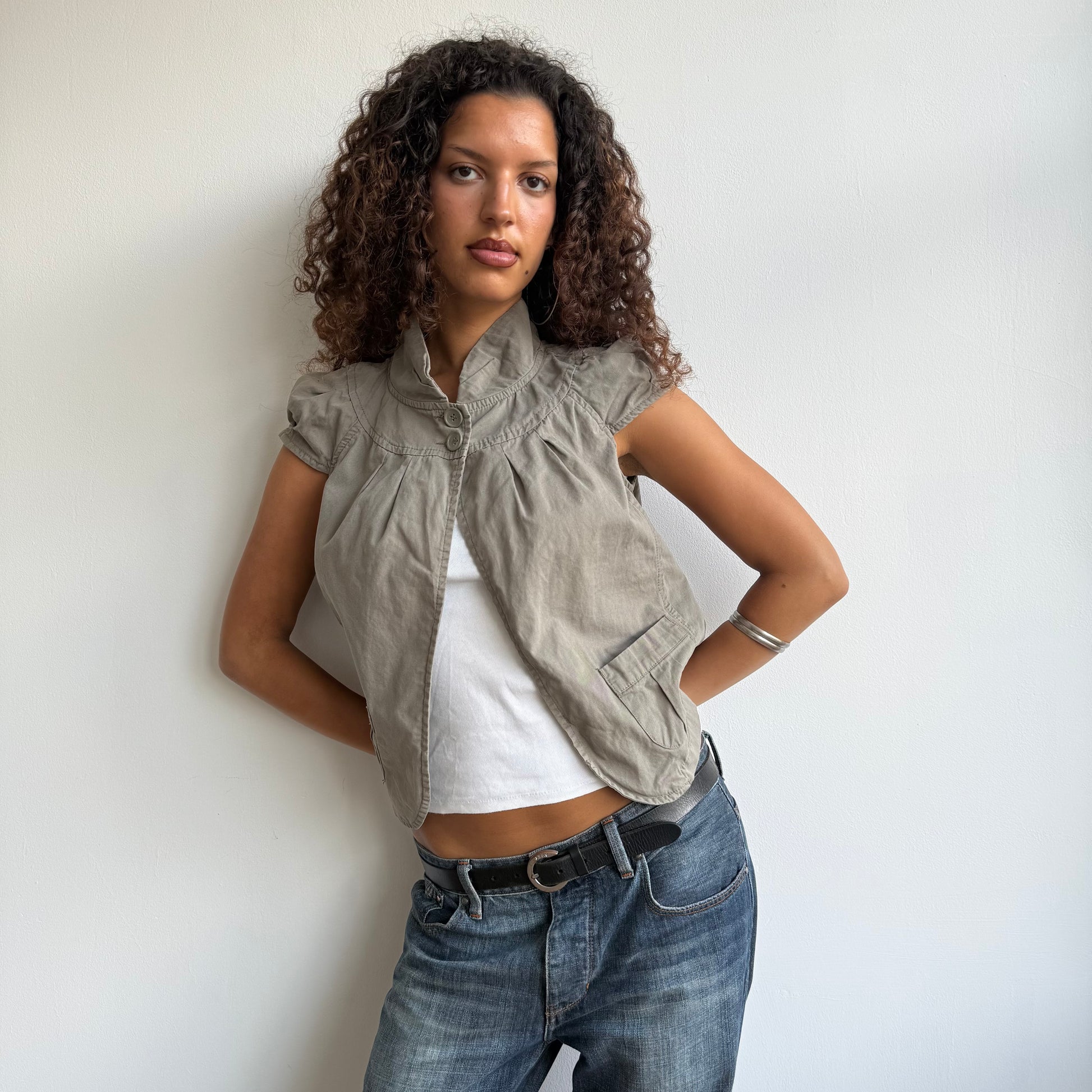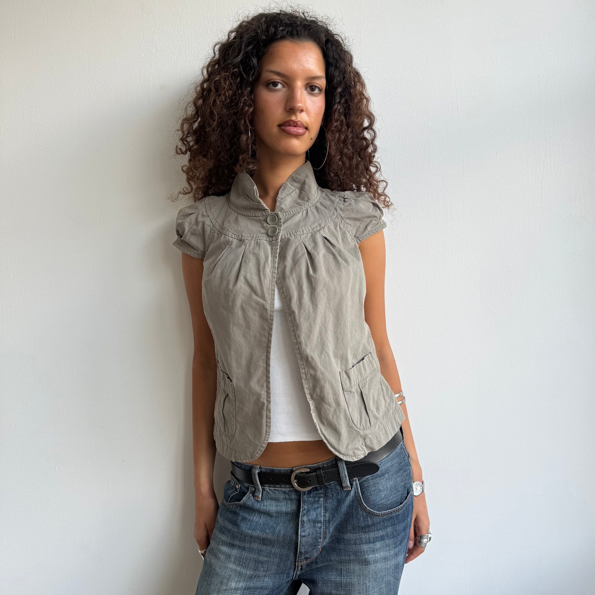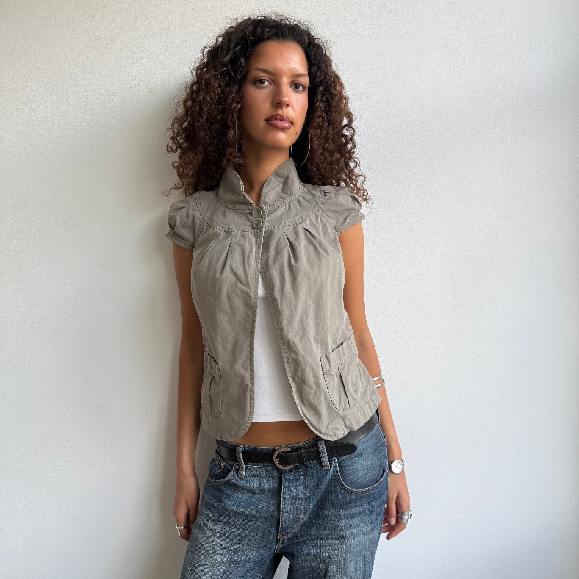 Khaki short sleeve open front peacoat with button neck details