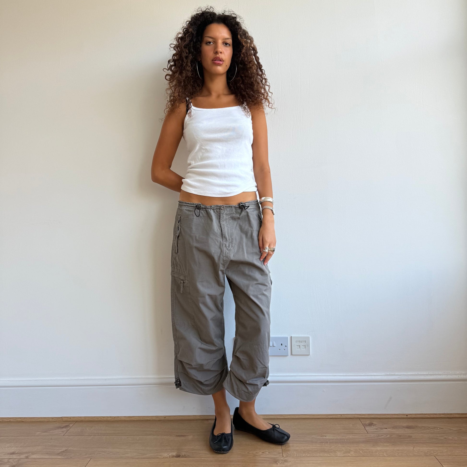 Khaki cargo toggle waist capris and adjustable ties at the ankles