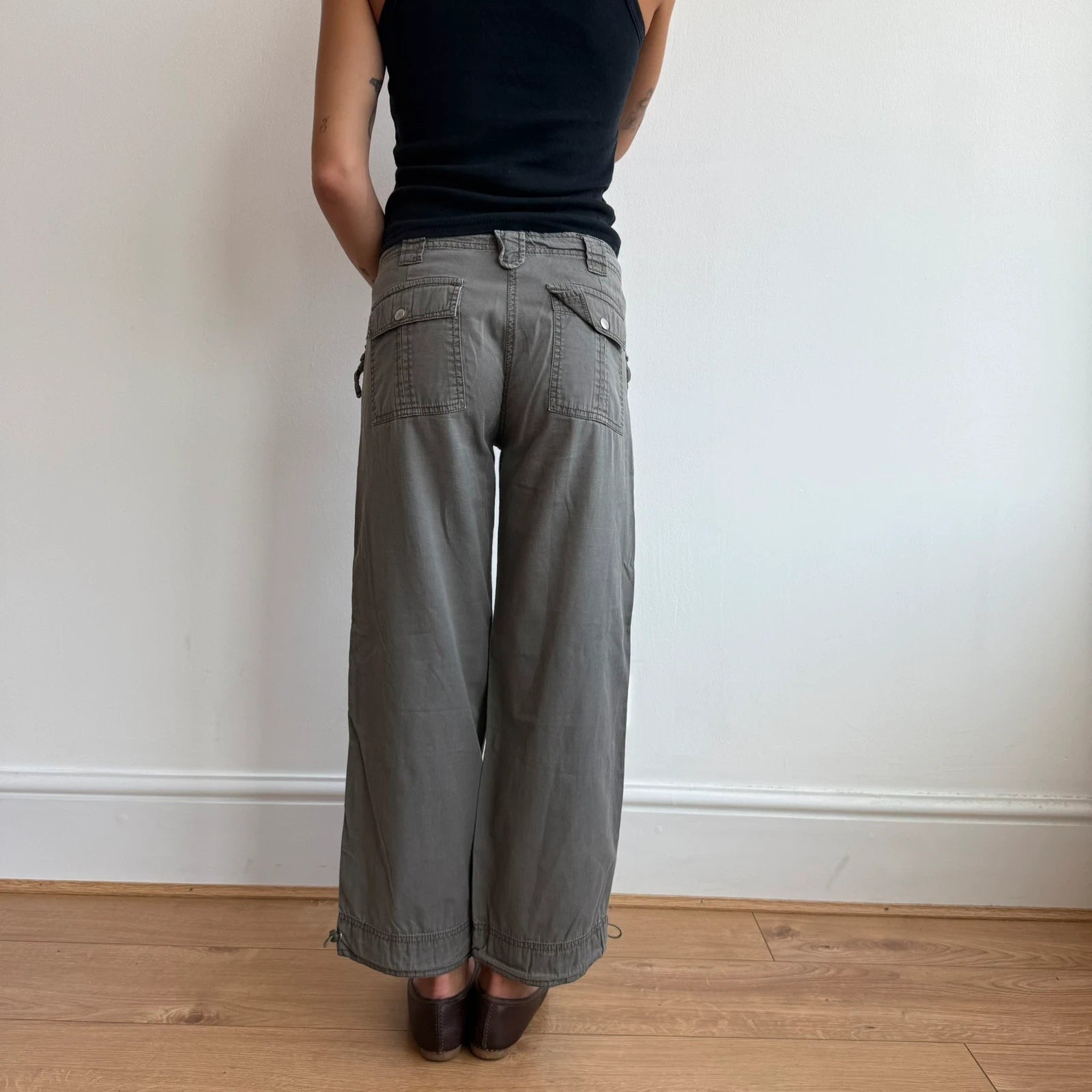 Khaki capris / 3/4 length cargo trousers with toggles at the waist and ankles