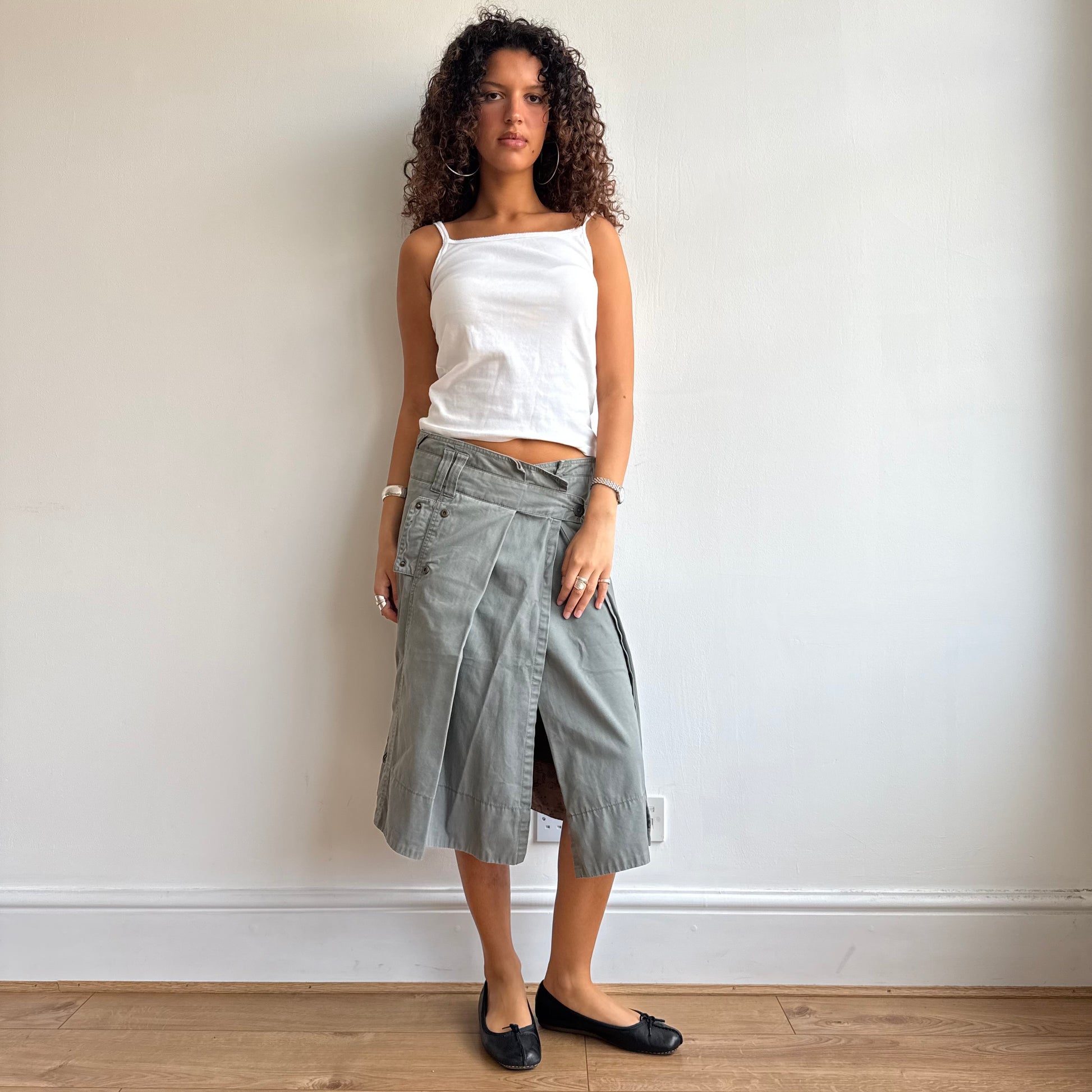 Khaki thick cotton wrap skirt with asymmetric details and pocket / embroidery