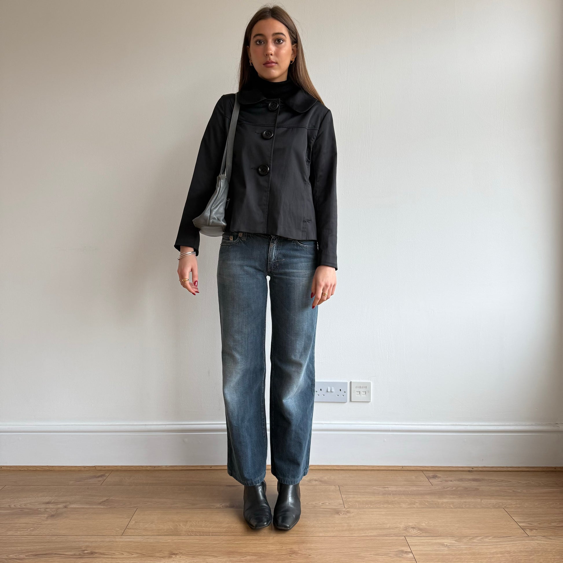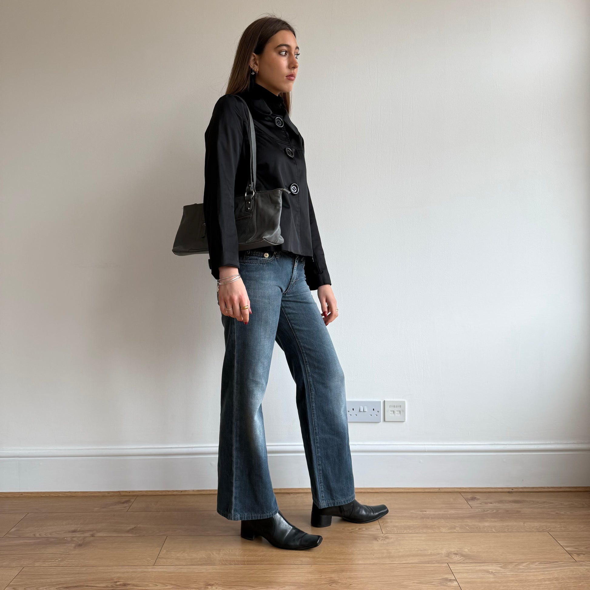 Blue grey leather baguette bag with silver buckles on the straps